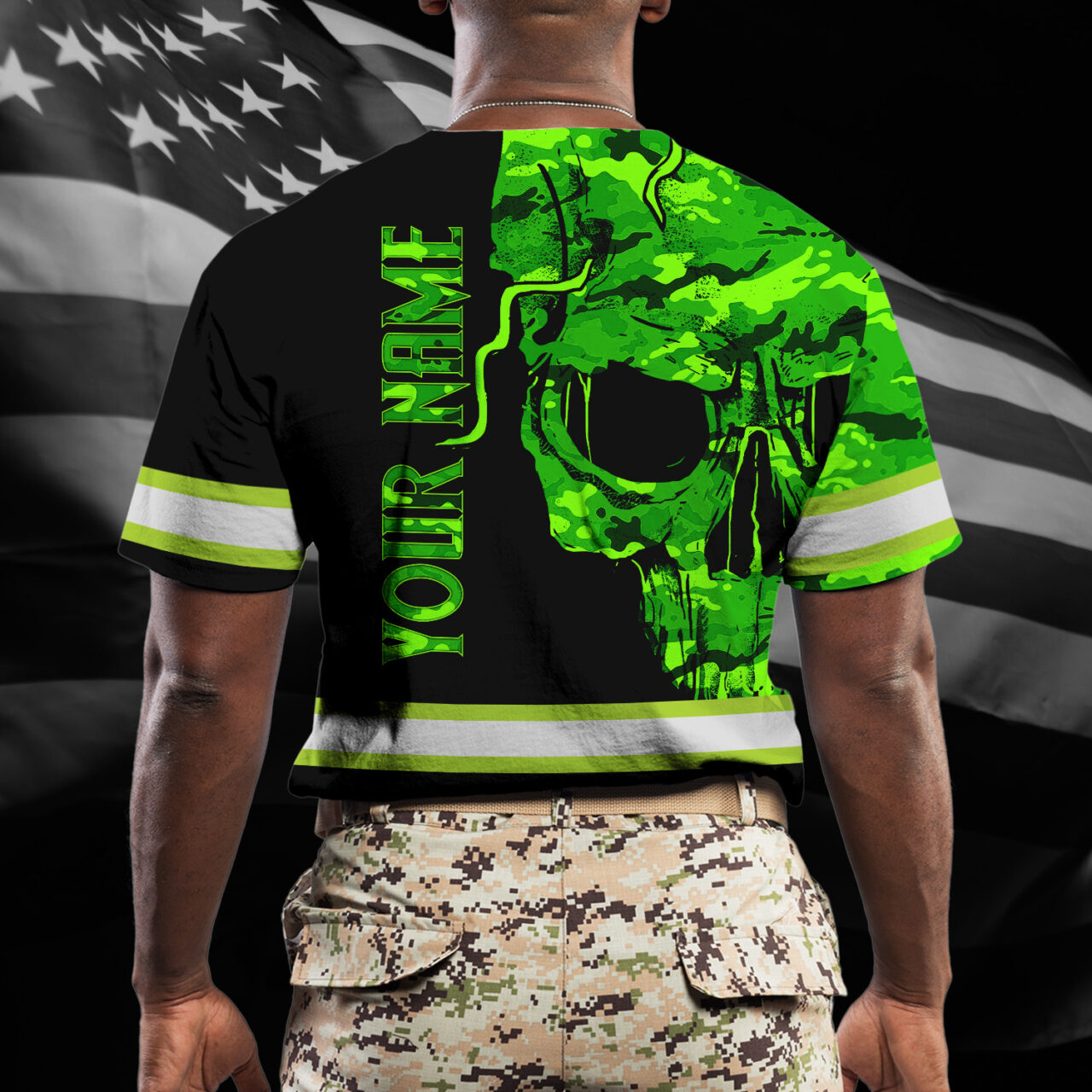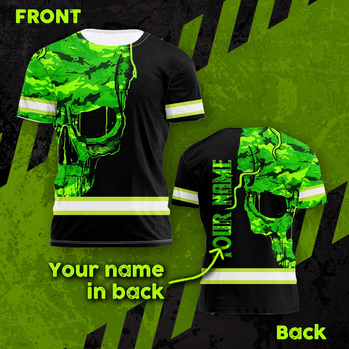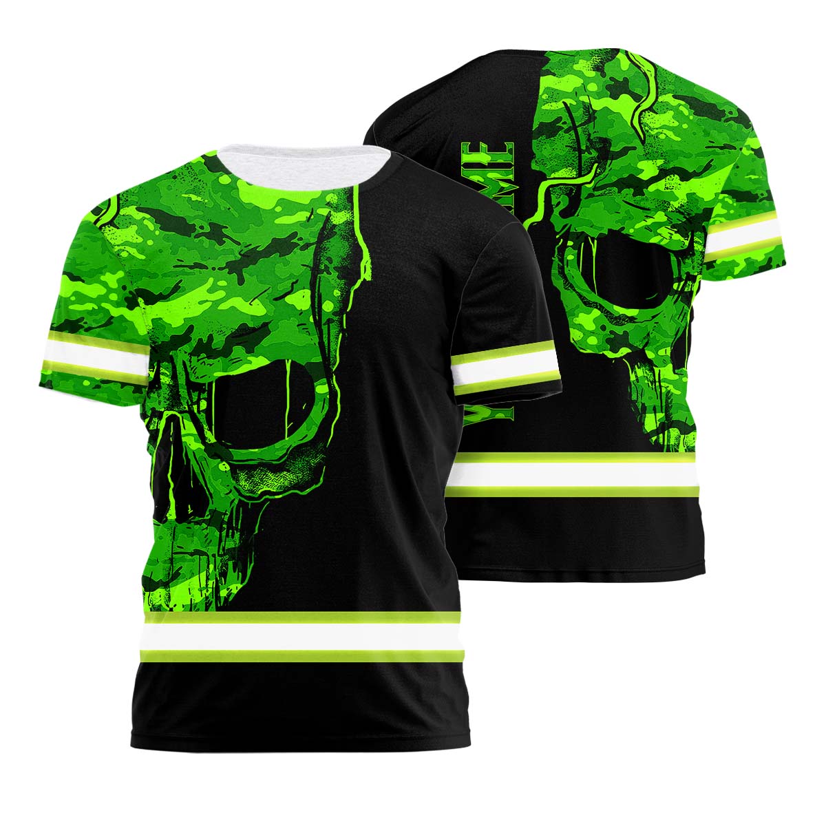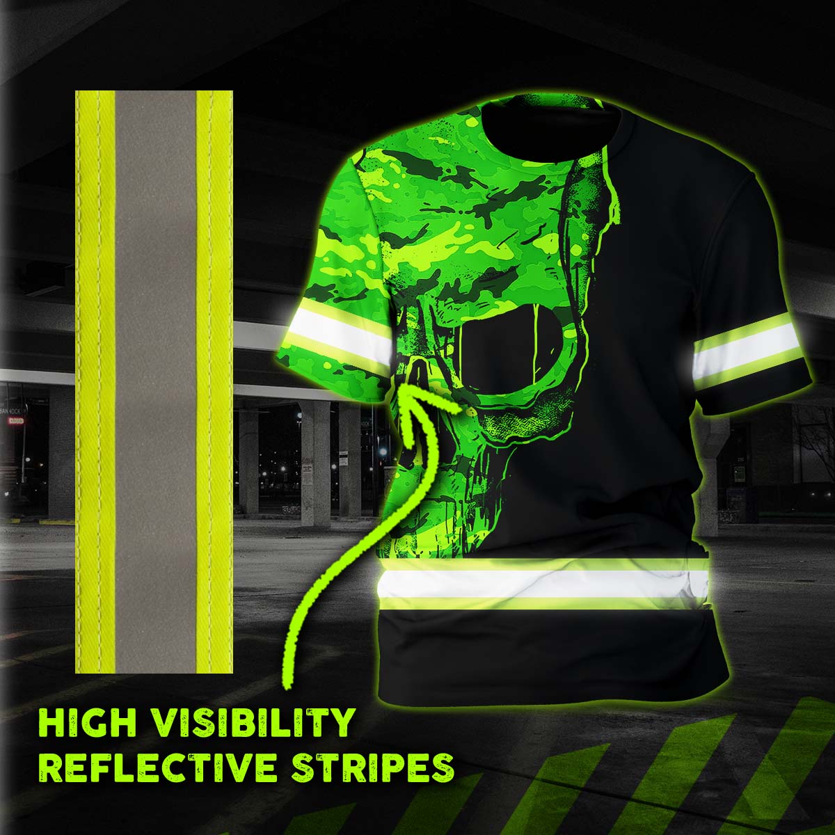 Hi Vis Shirt Reflective Tapes Green Neon Camo Skull Custom Name Safety Workwear For Workers, Operator, Cyclists, Patriotic