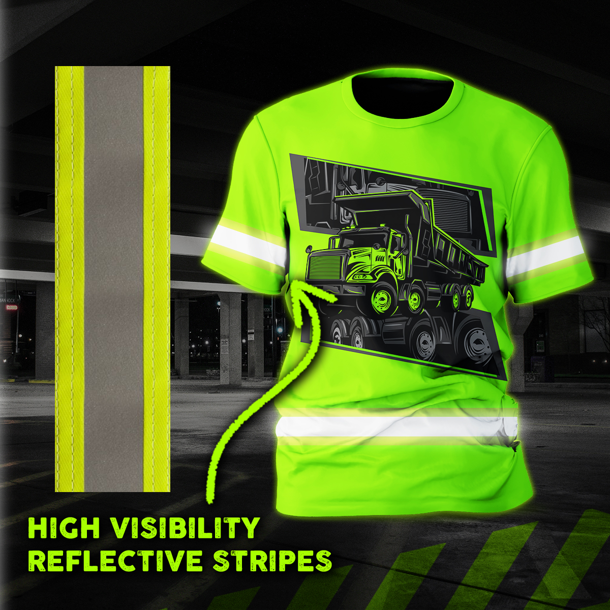 Hi Vis Shirt Reflective Tapes Green Neon Dump Truck Custom Name Safety Workwear For Workers, Truckers, Operator, Cyclists, Patriotic
