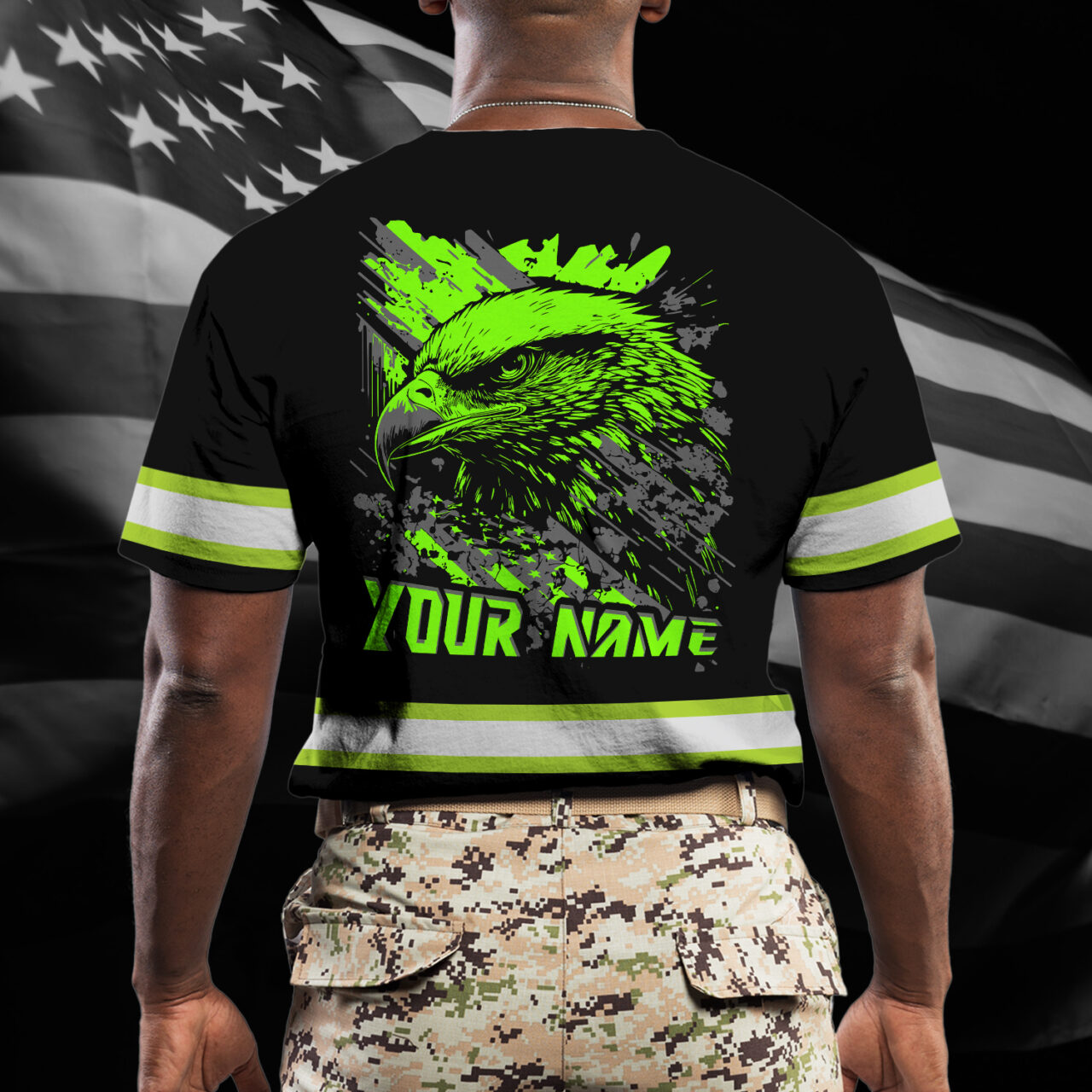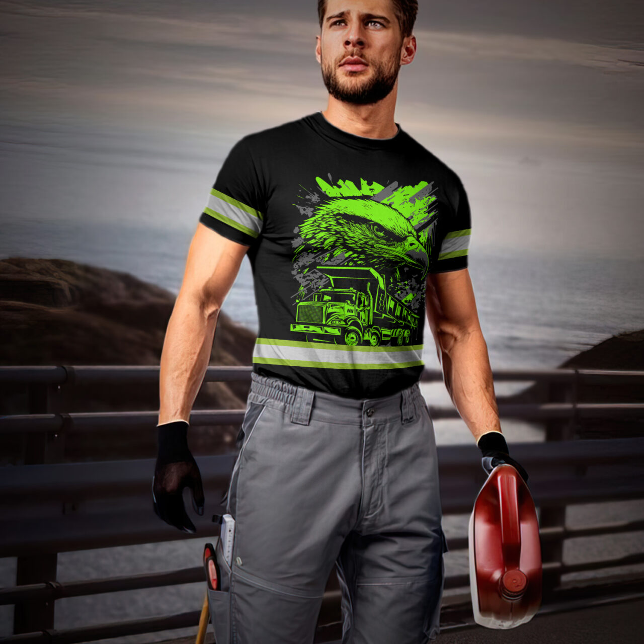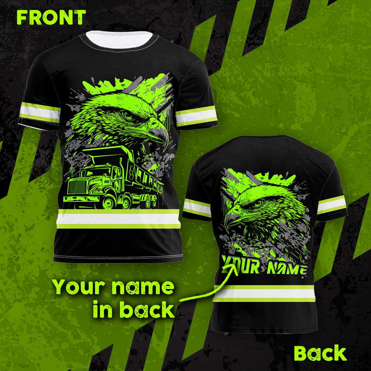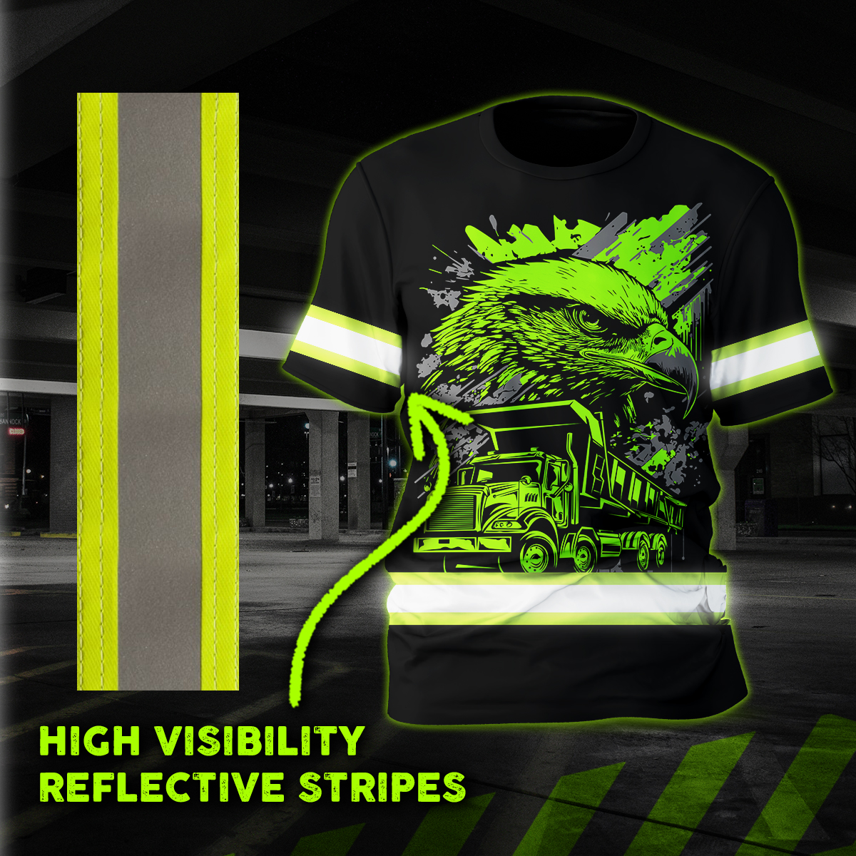Hi Vis Shirt Reflective Tapes Green Neon Eagle Dump Truck Custom Name Safety Workwear For Truckers, Workers, Operator, Cyclists, Patriotic