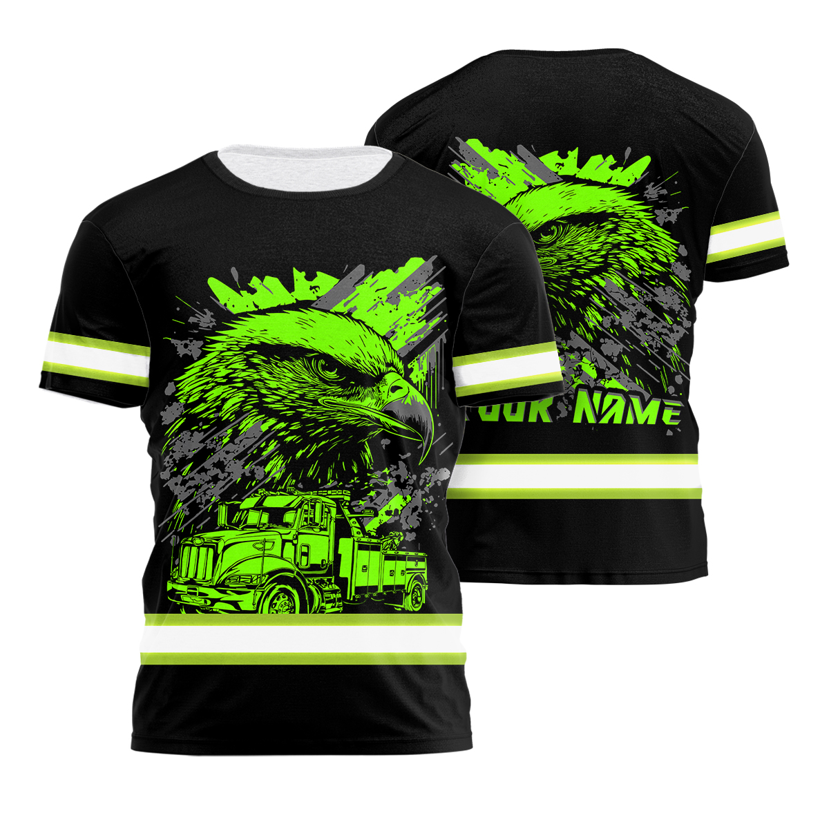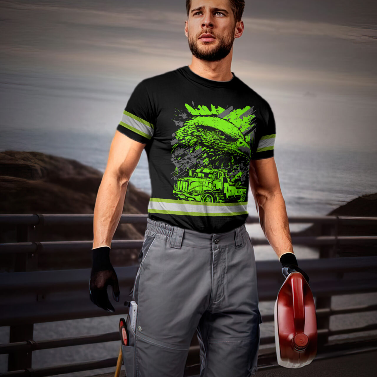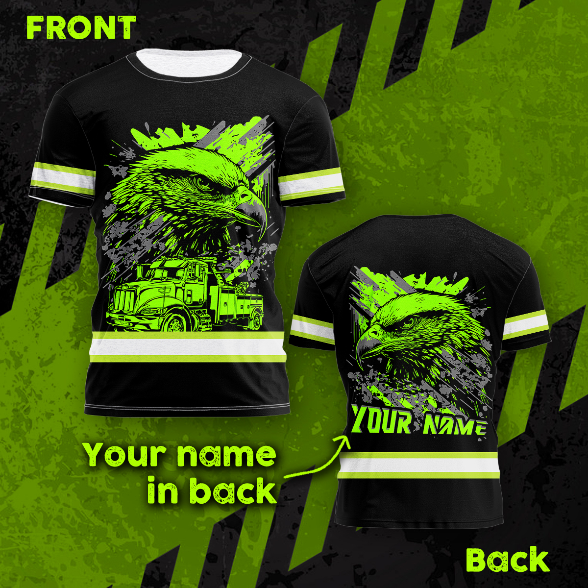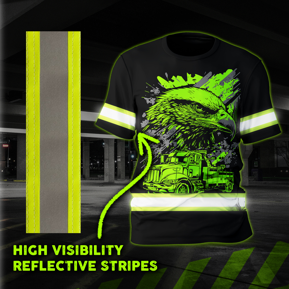Hi Vis Shirt Reflective Tapes Green Neon Eagle Tow Truck Custom Name Safety Workwear For Truckers, Workers, Operator, Cyclists, Patriotic