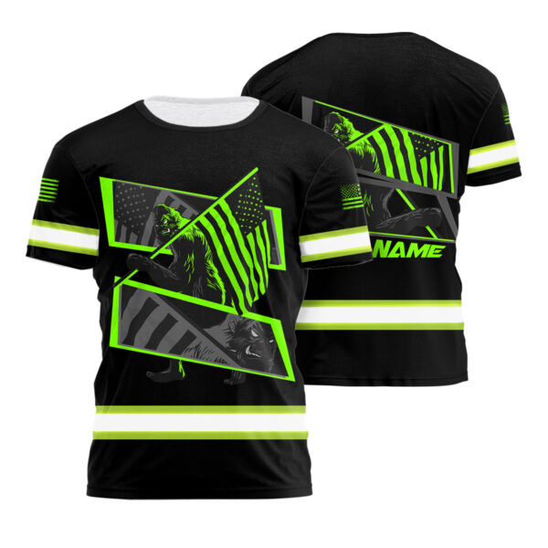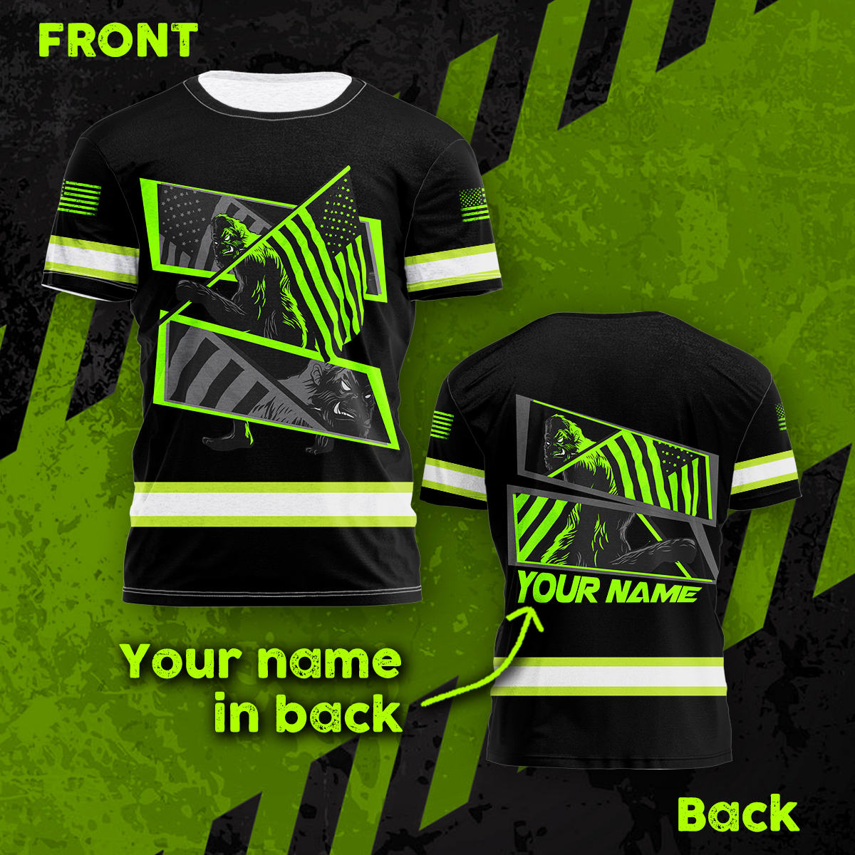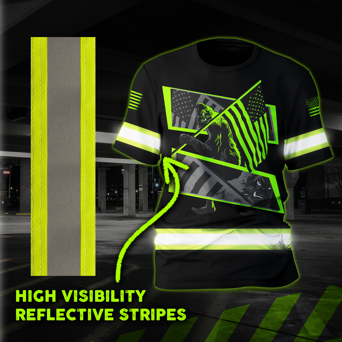Hi Vis Shirt Reflective Tapes Green Neon Outdoor Gorillas US Flag Custom Name Safety Workwear For Workers, Operator, Cyclists, Patriotic