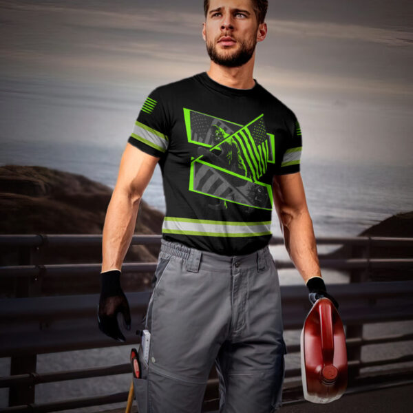 Hi Vis Shirt Reflective Tapes Green Neon US Flag Half Scratch Custom Name Safety Workwear For Workers, Operator, Cyclists, Patriotic