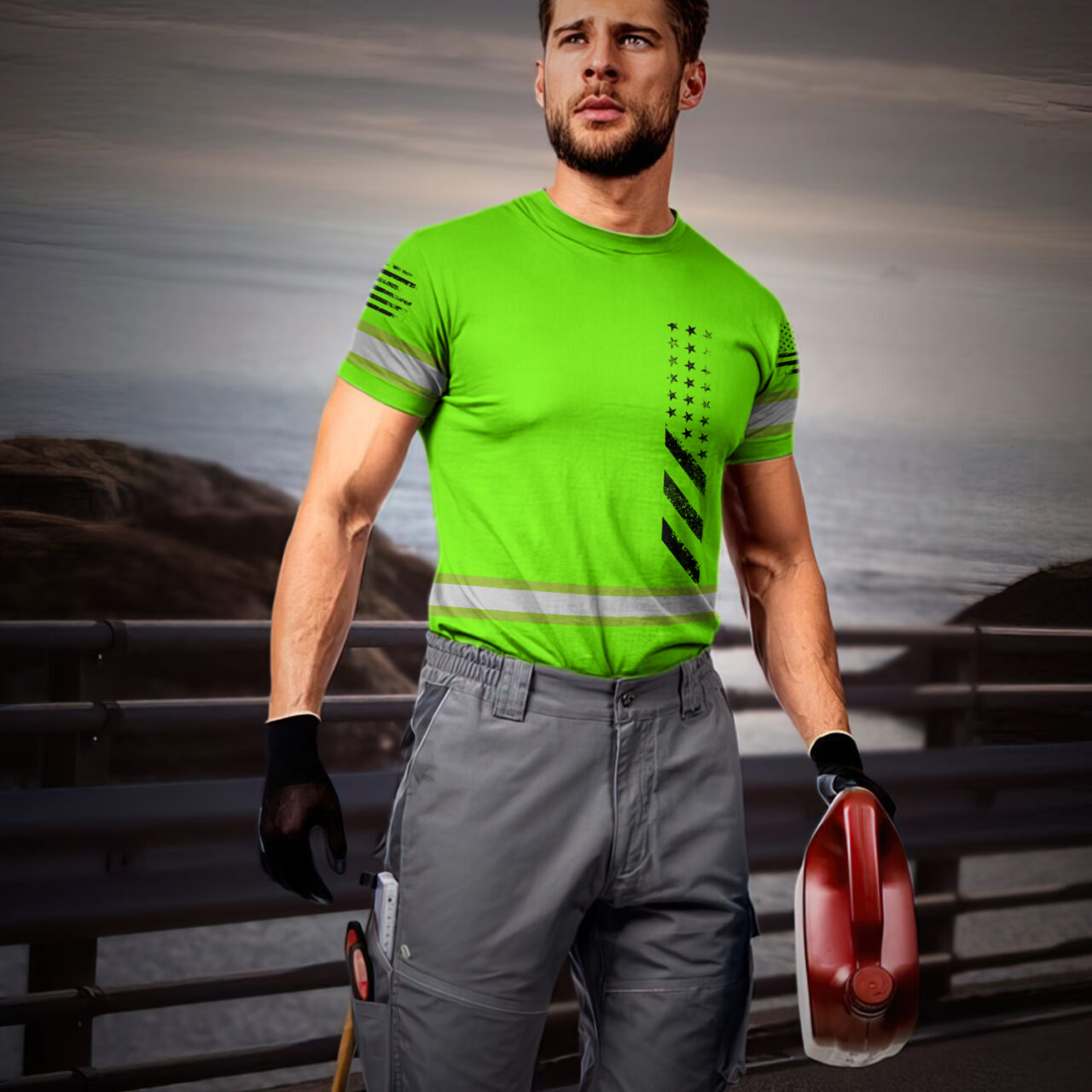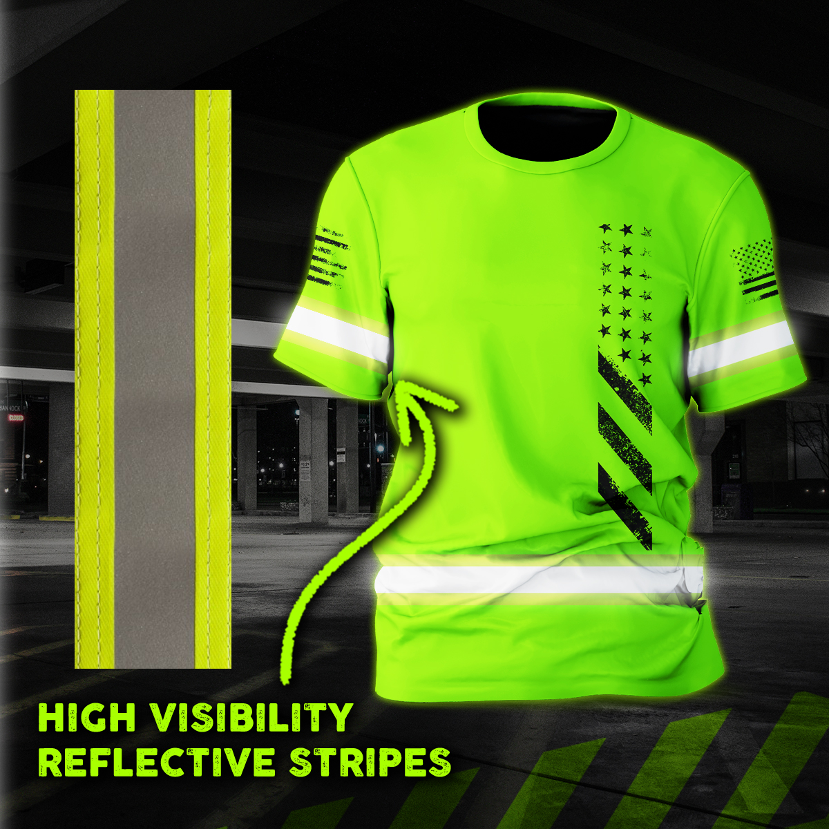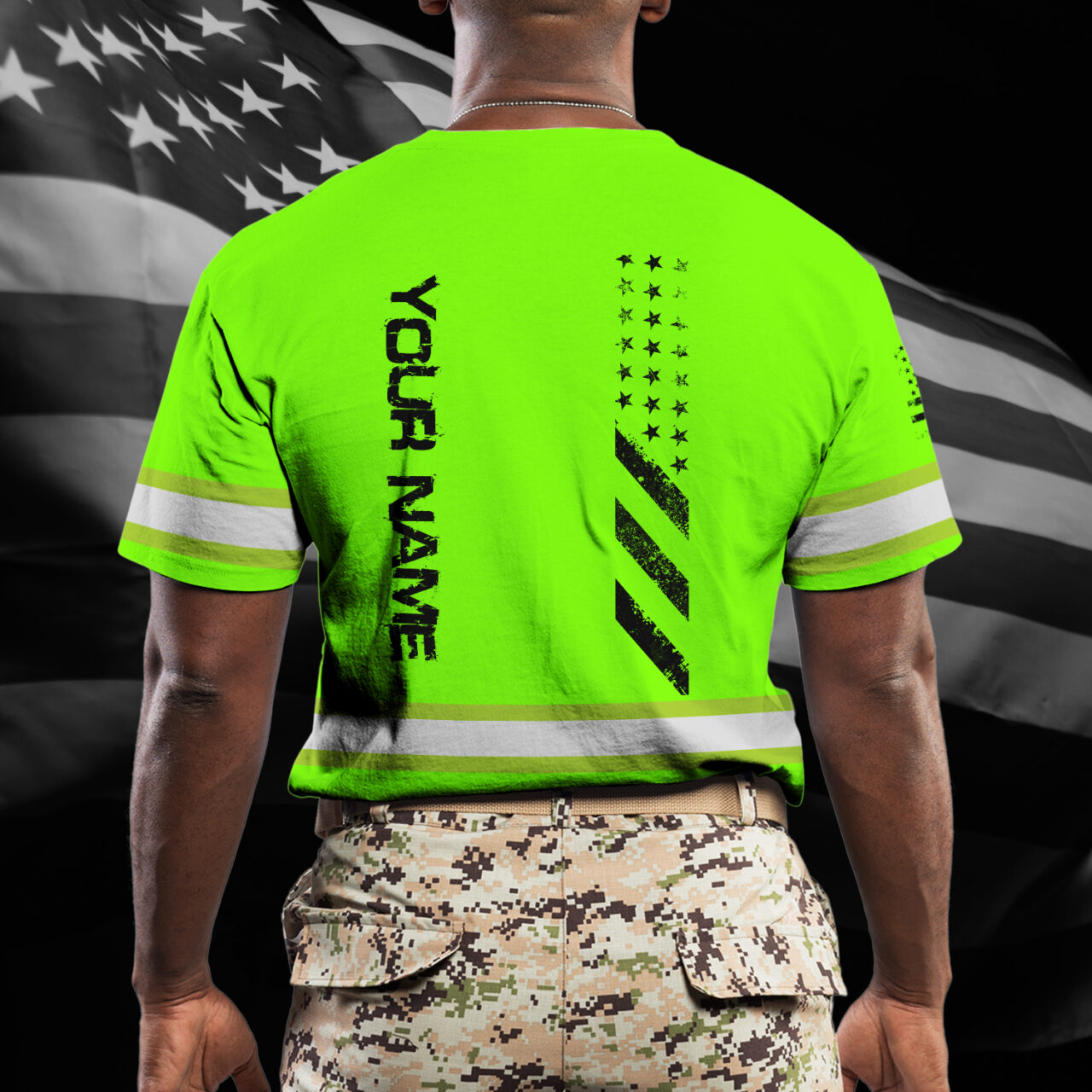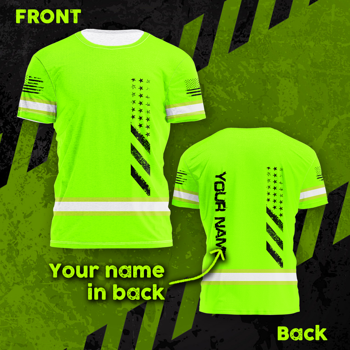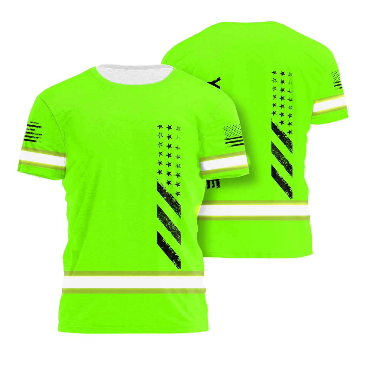 Hi Vis Shirt Reflective Tapes Green Neon Scratch US Flag Custom Name Safety Workwear For Truckers, Workers, Operator, Cyclists, Patriotic