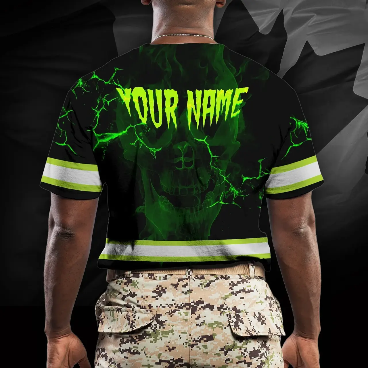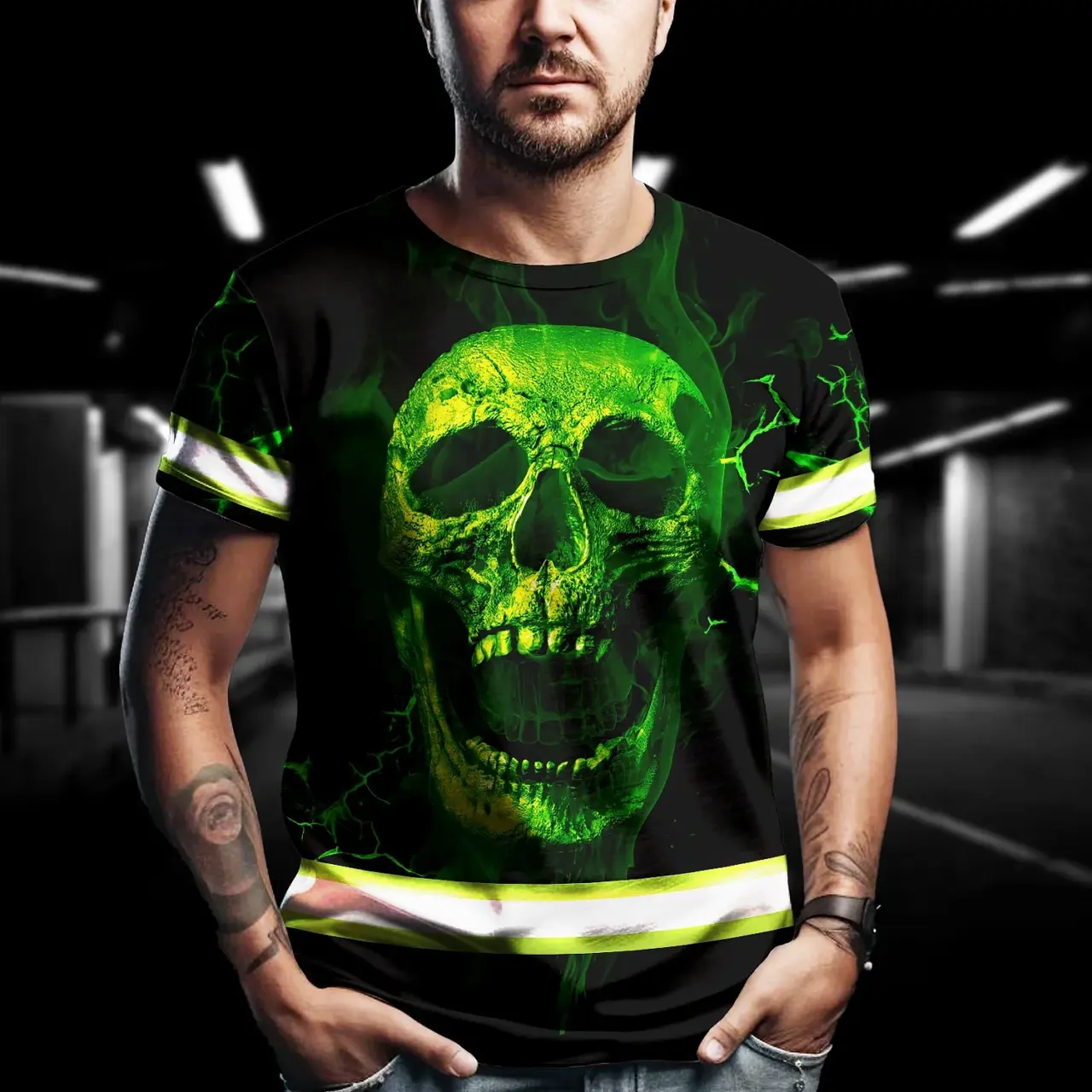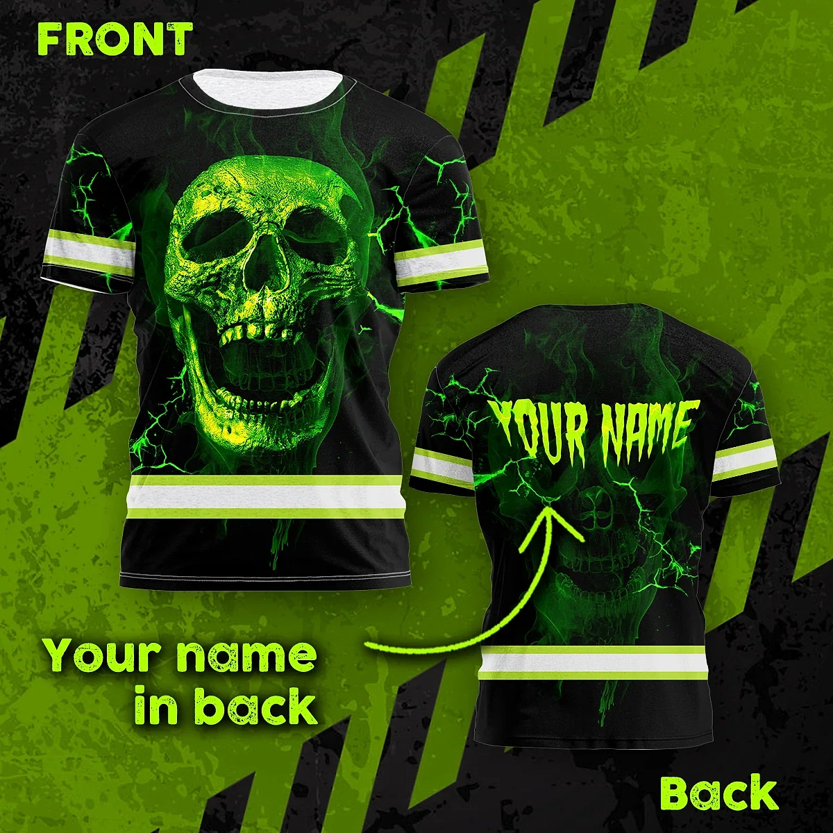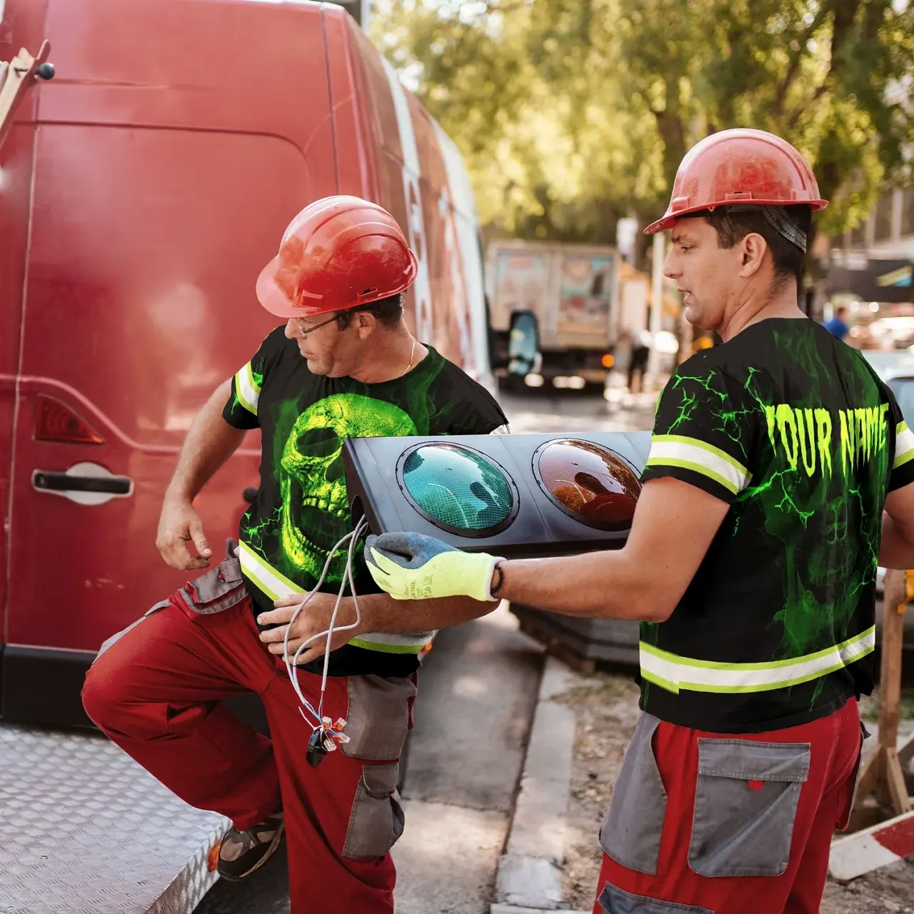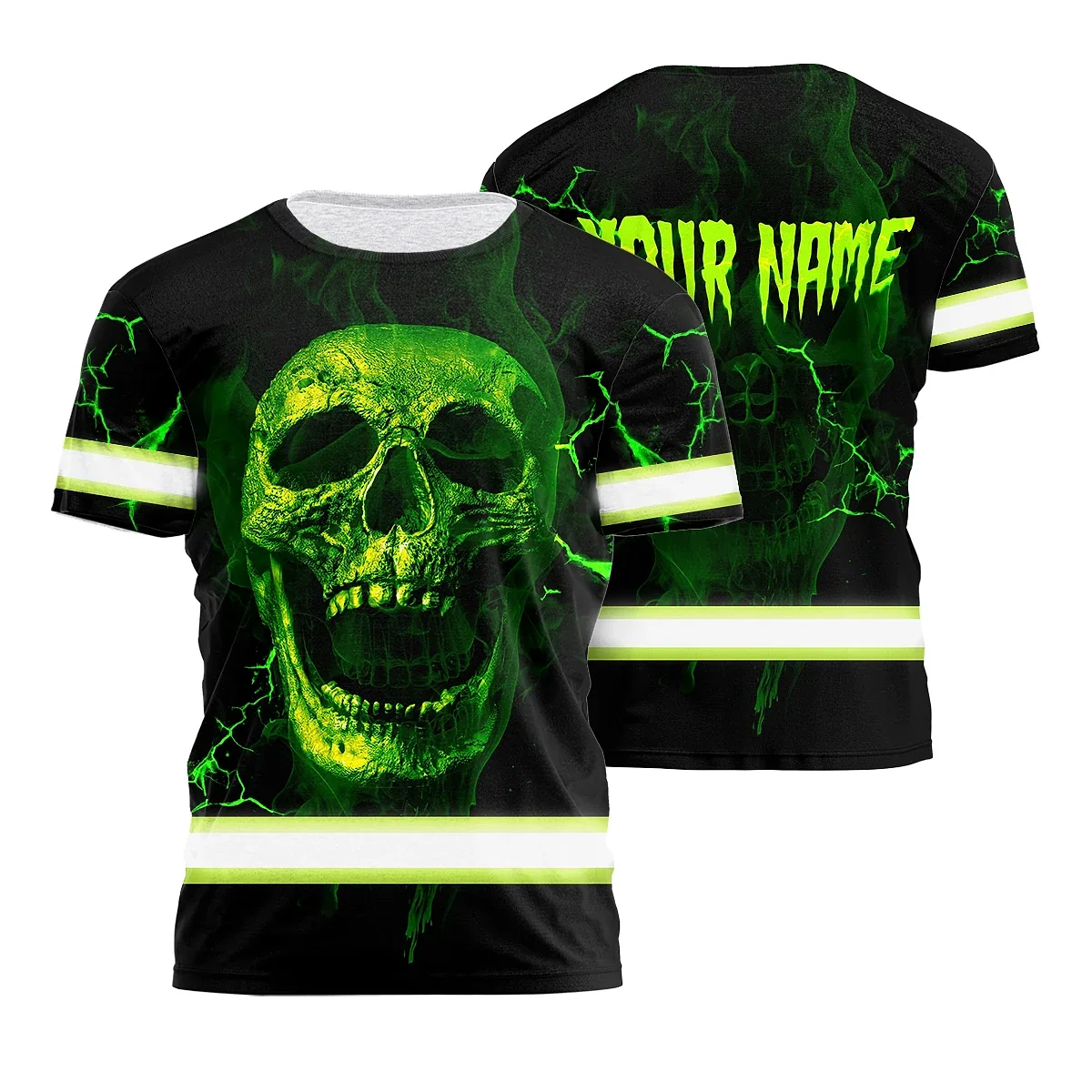 Hi Vis Shirt Reflective Tapes Green Neon Skull Custom Name Safety Workwear For Workers, Truckers, Operators