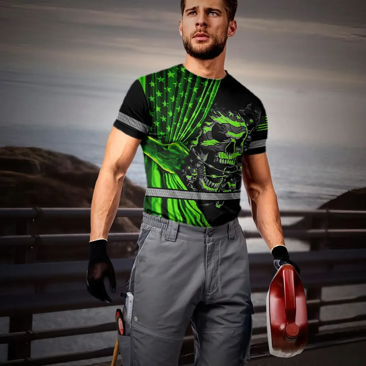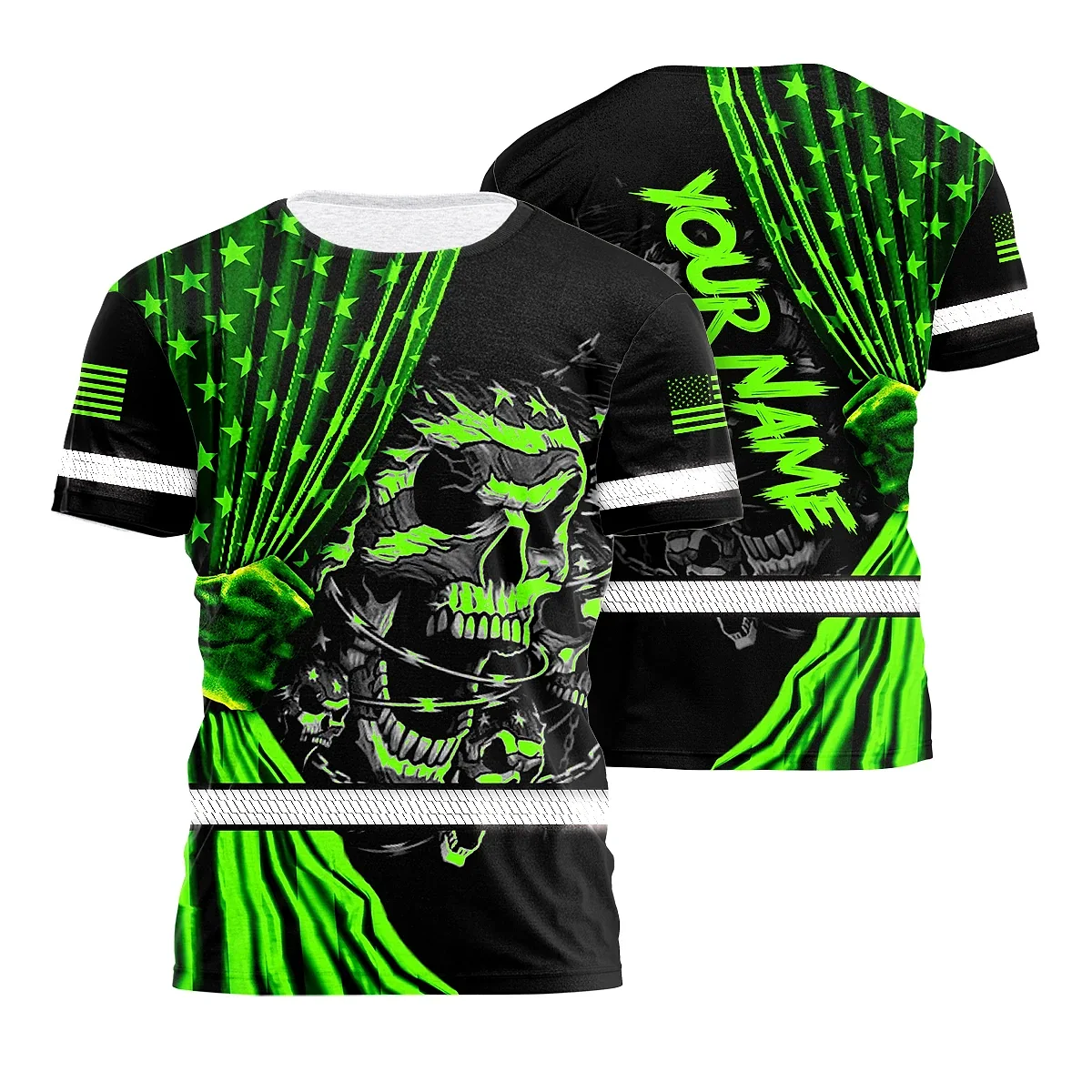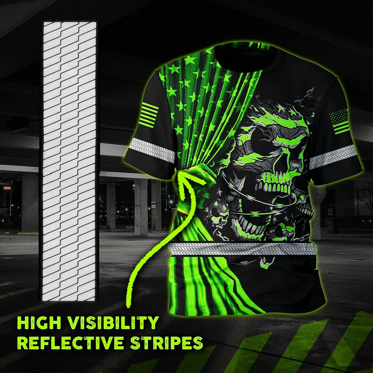 Hi Vis Shirt Reflective Tapes Green Neon Skull Us Flag Patriotic Safety Workwear For Workers, Truckers, Operators