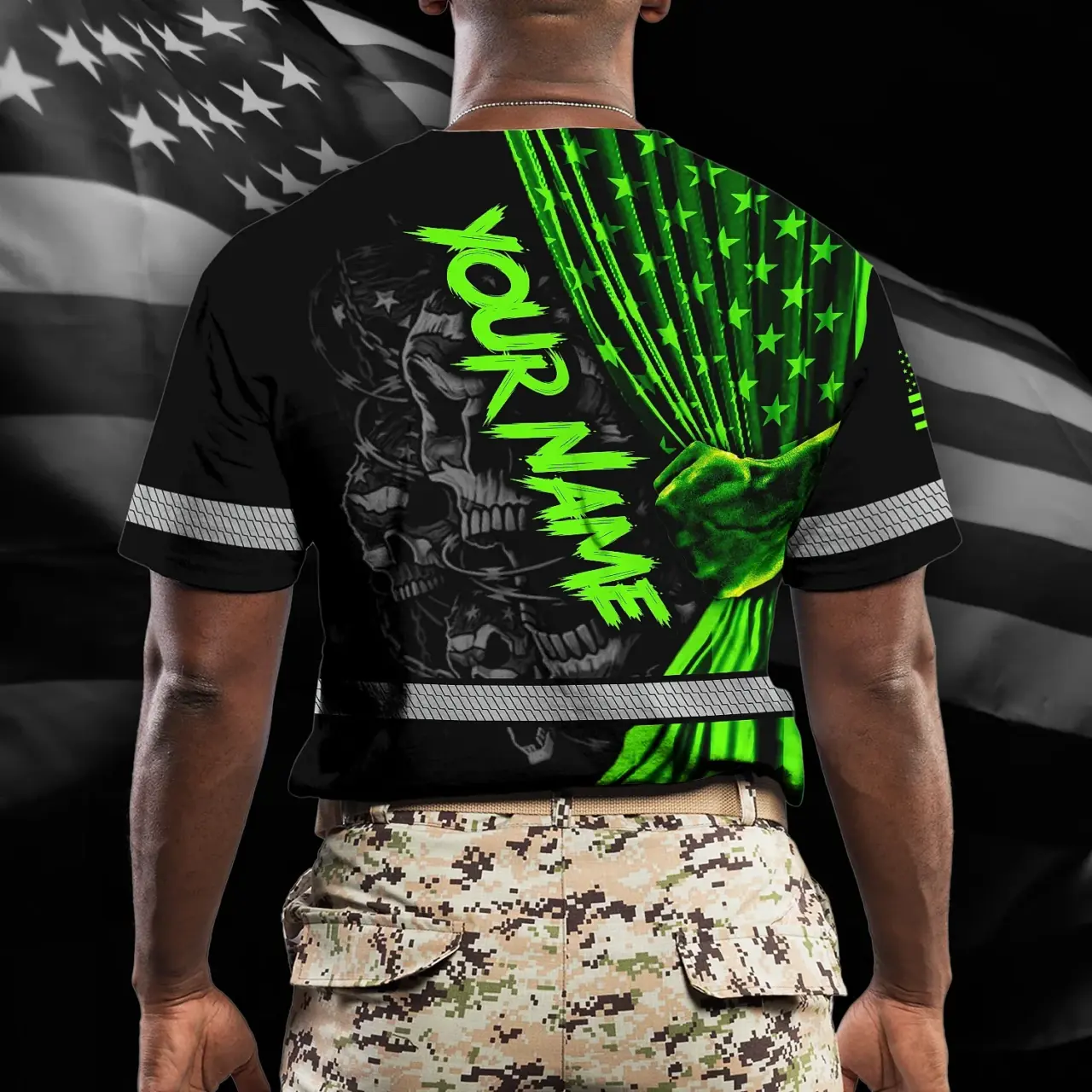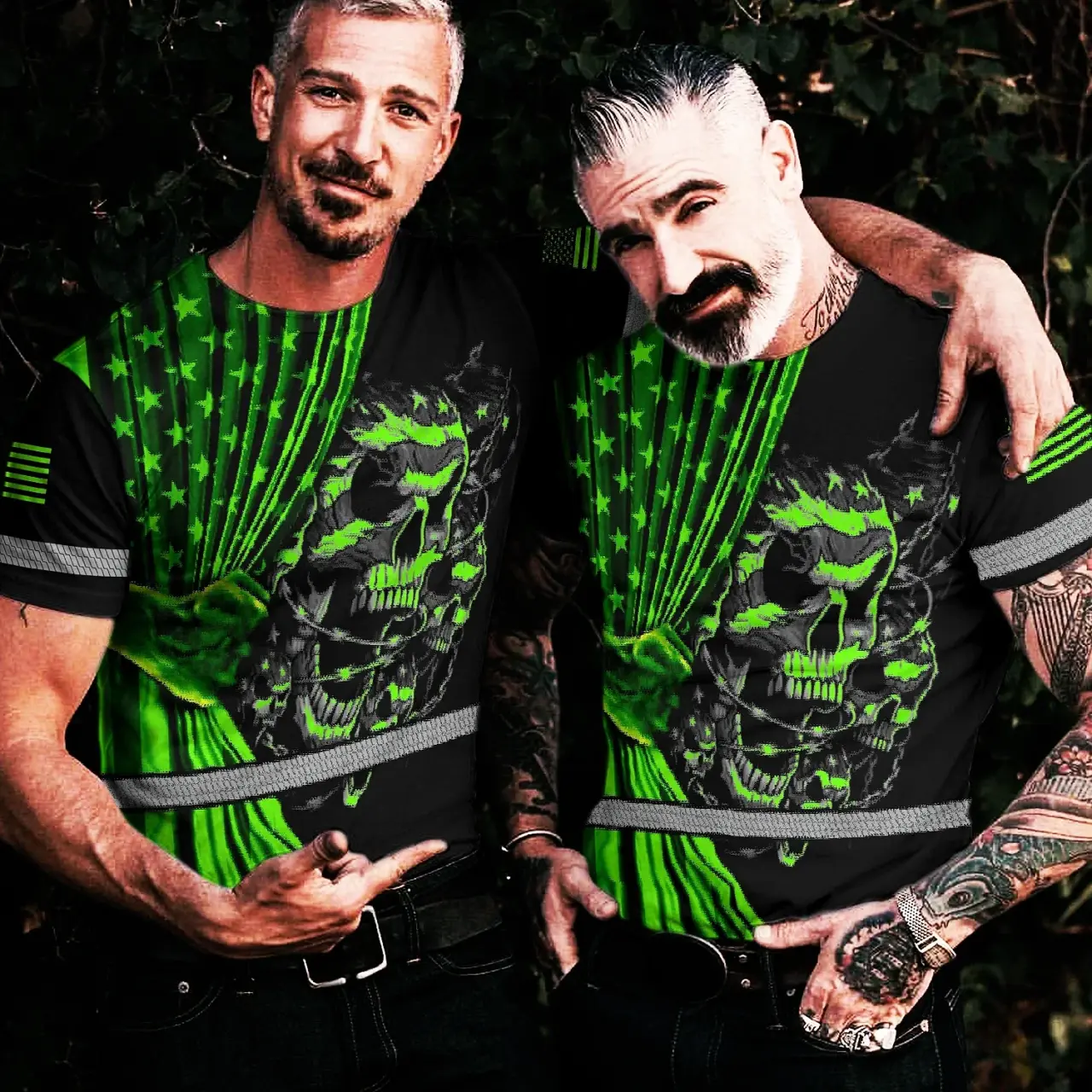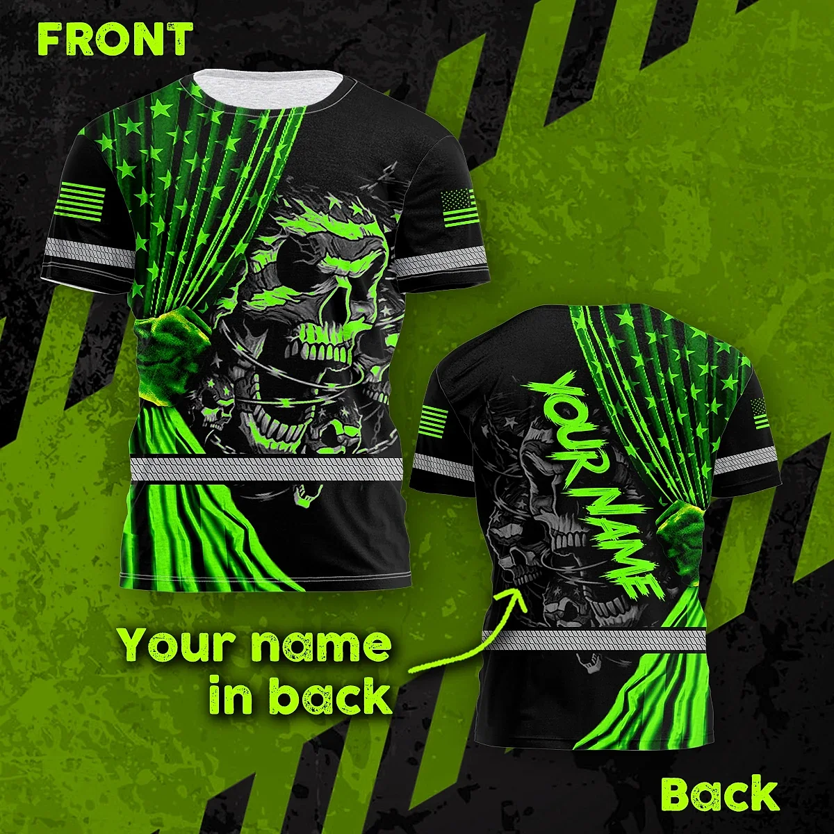 Hi Vis Shirt Reflective Tapes Green Neon Skull Us Flag Patriotic Safety Workwear For Workers, Truckers, Operators