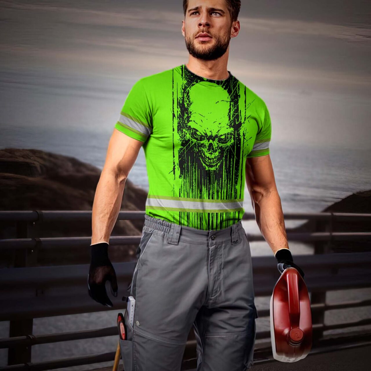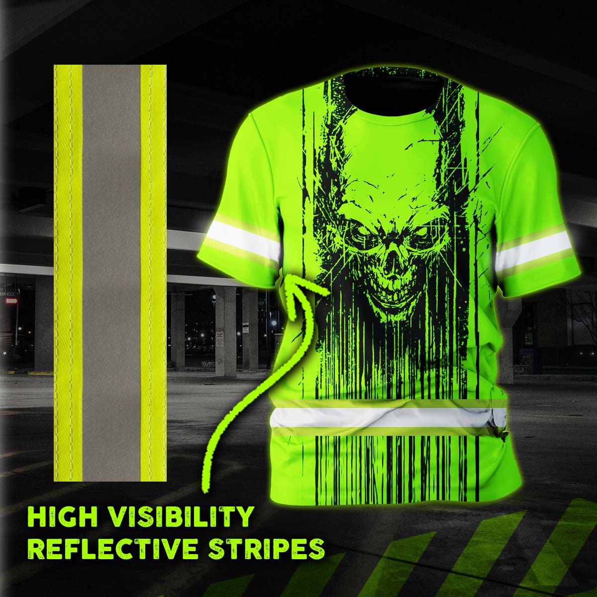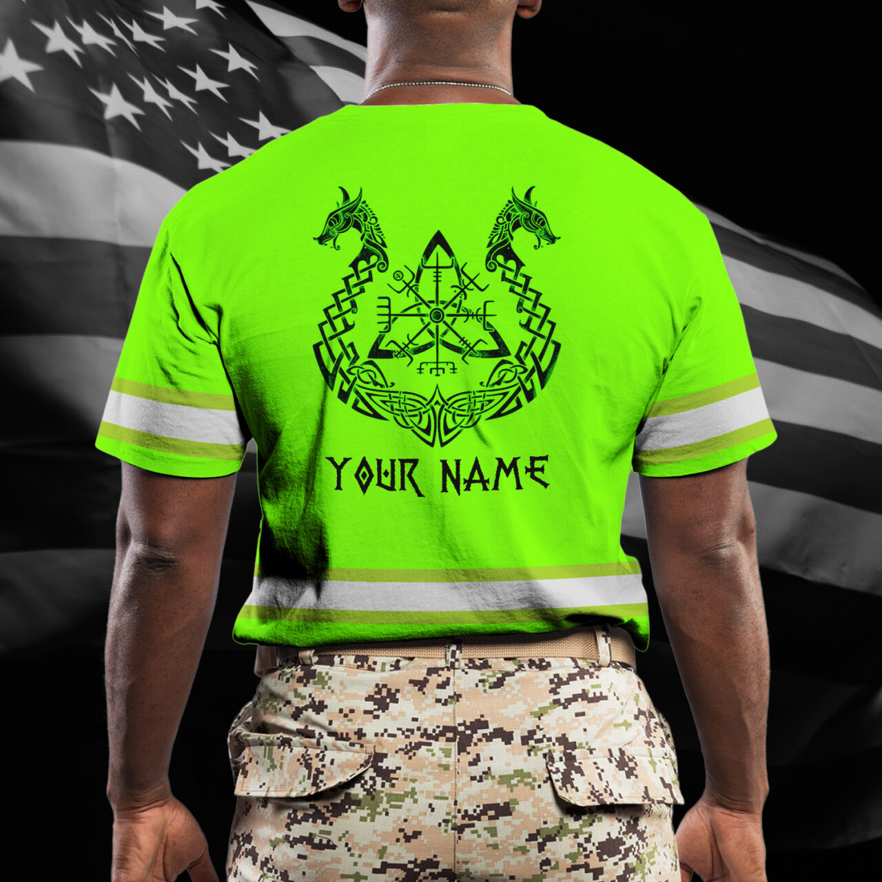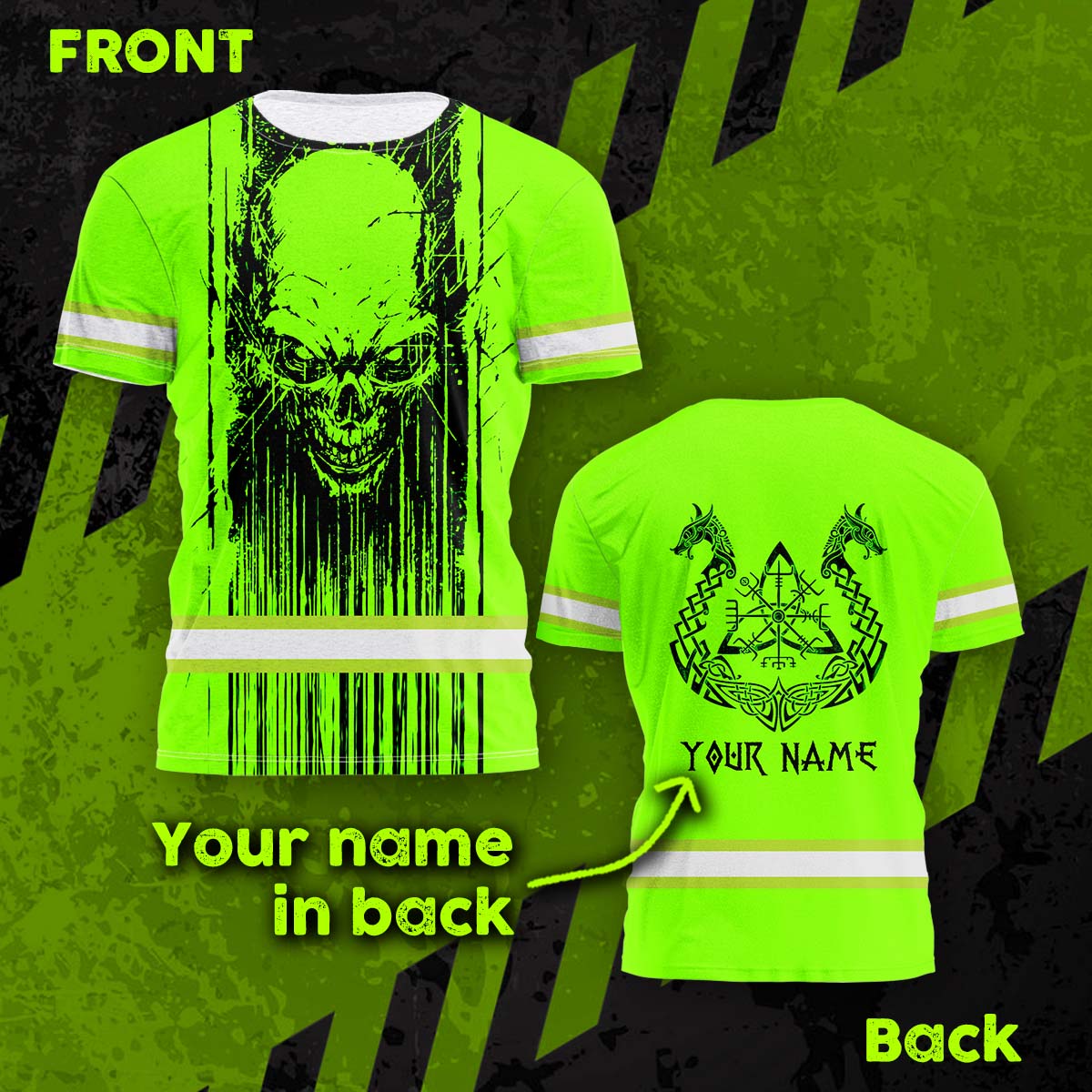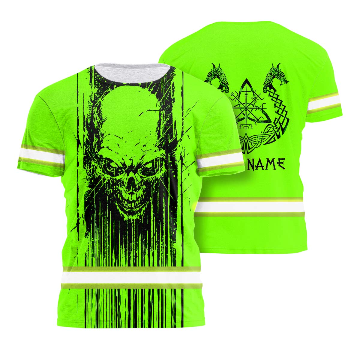 Hi Vis Shirt Reflective Tapes Green Neon Skull Viking Symbol Custom Name Safety Workwear For Workers, Runners, Cyclists