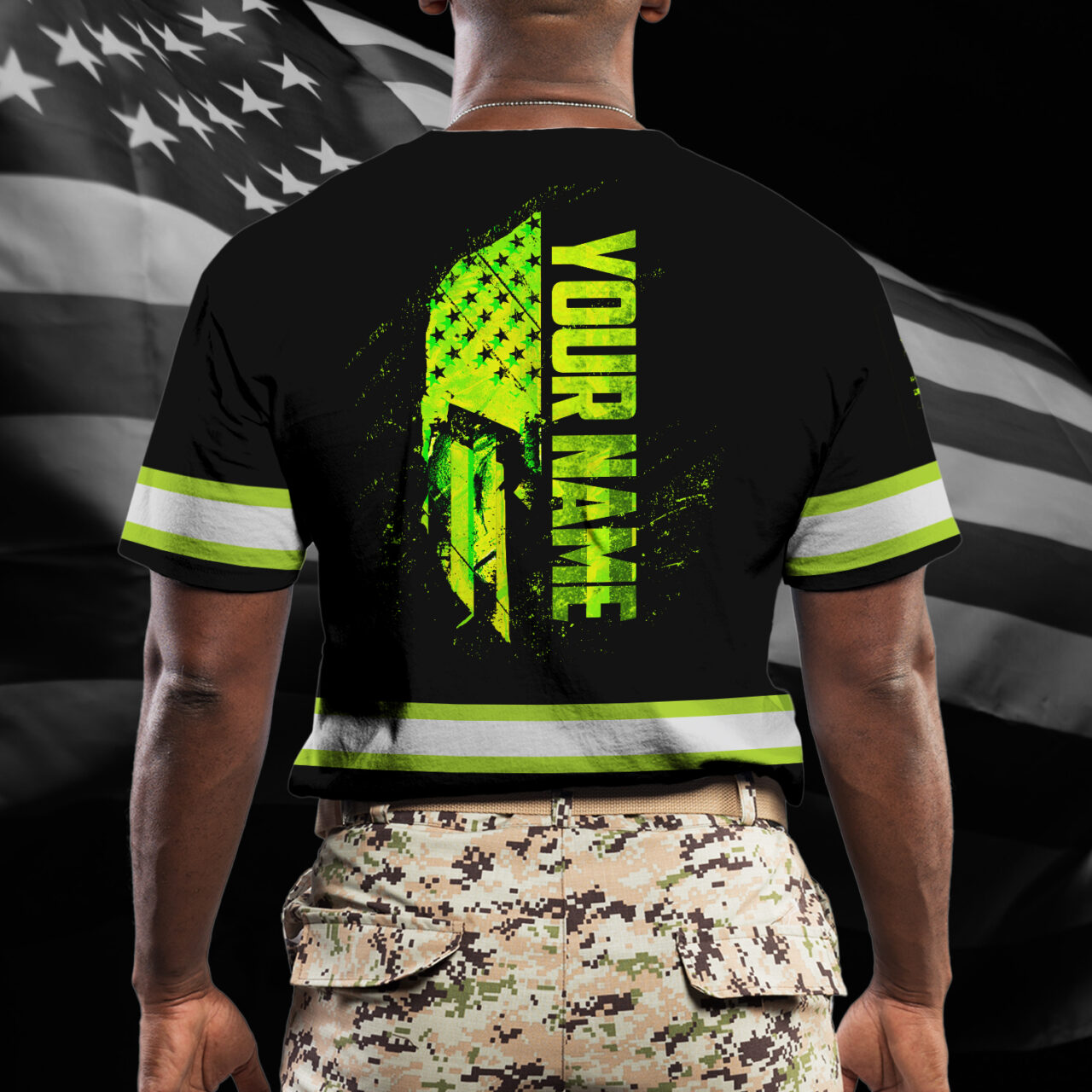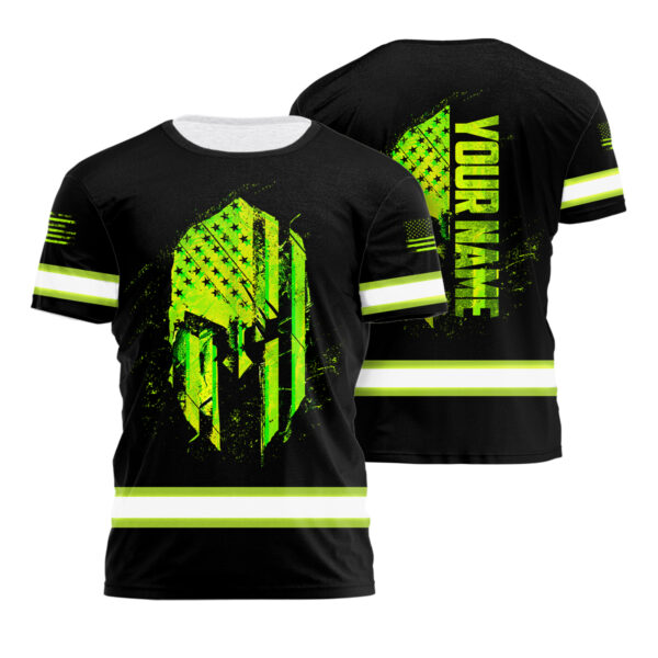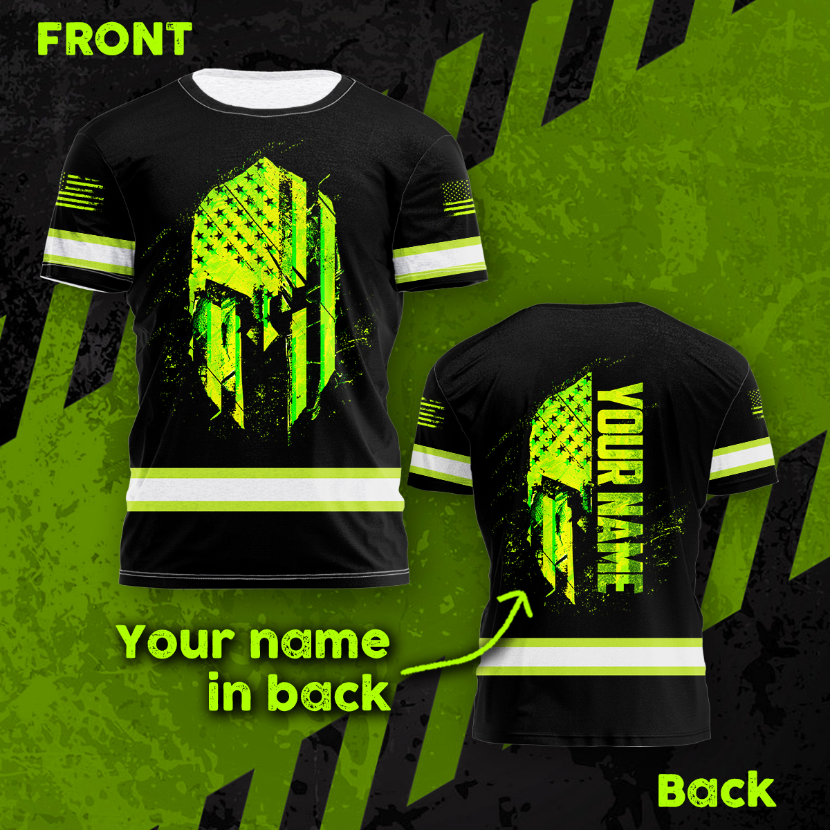 Hi Vis Shirt Reflective Tapes Green Neon Strong Mask US Flag Custom Name Safety Workwear For Workers, Operator, Cyclists, Patriotic