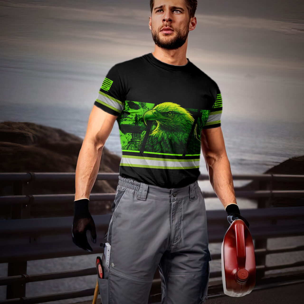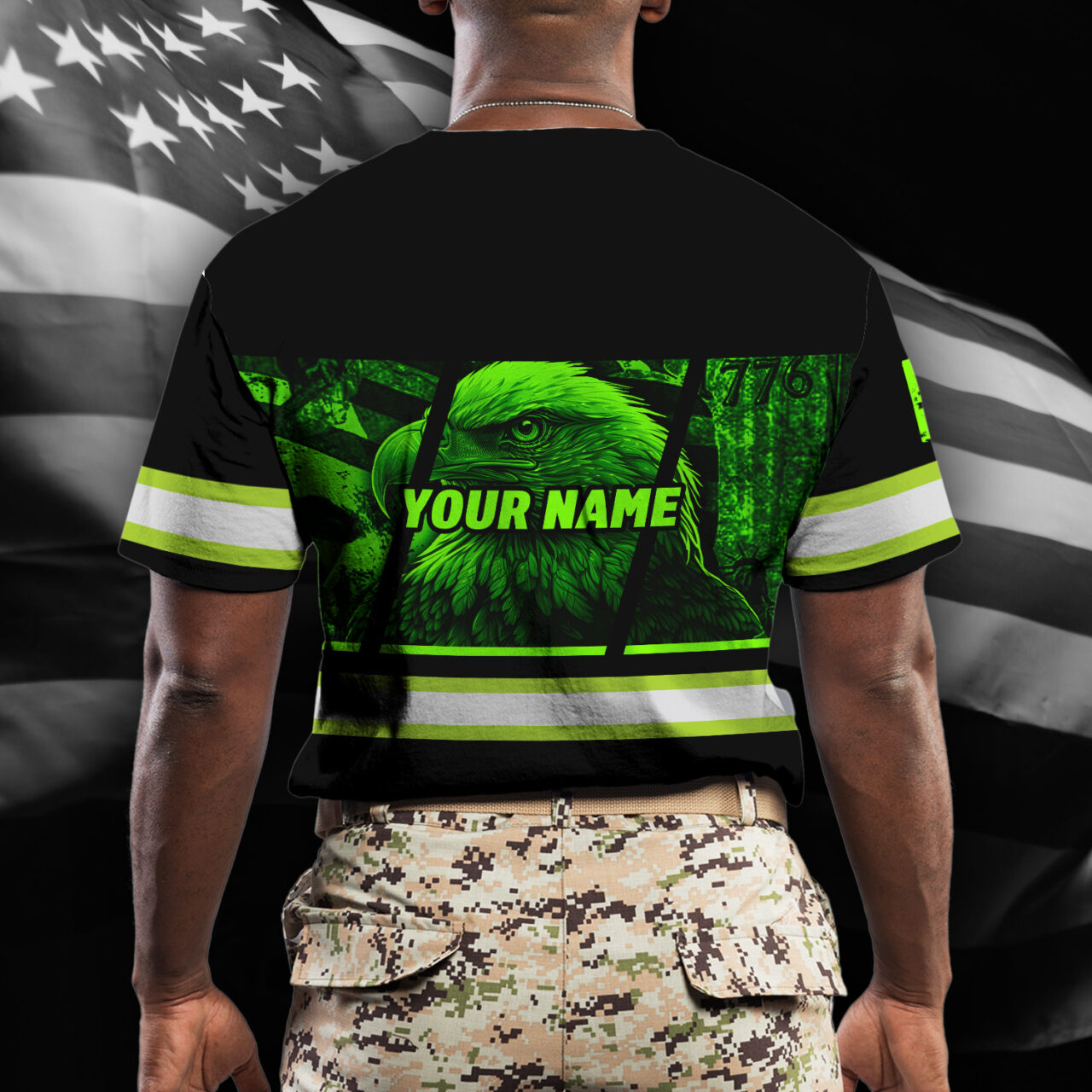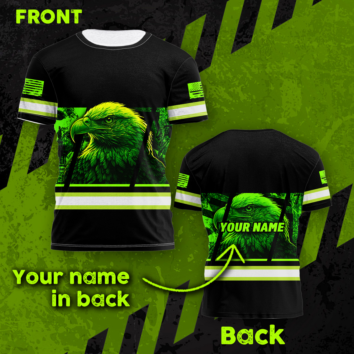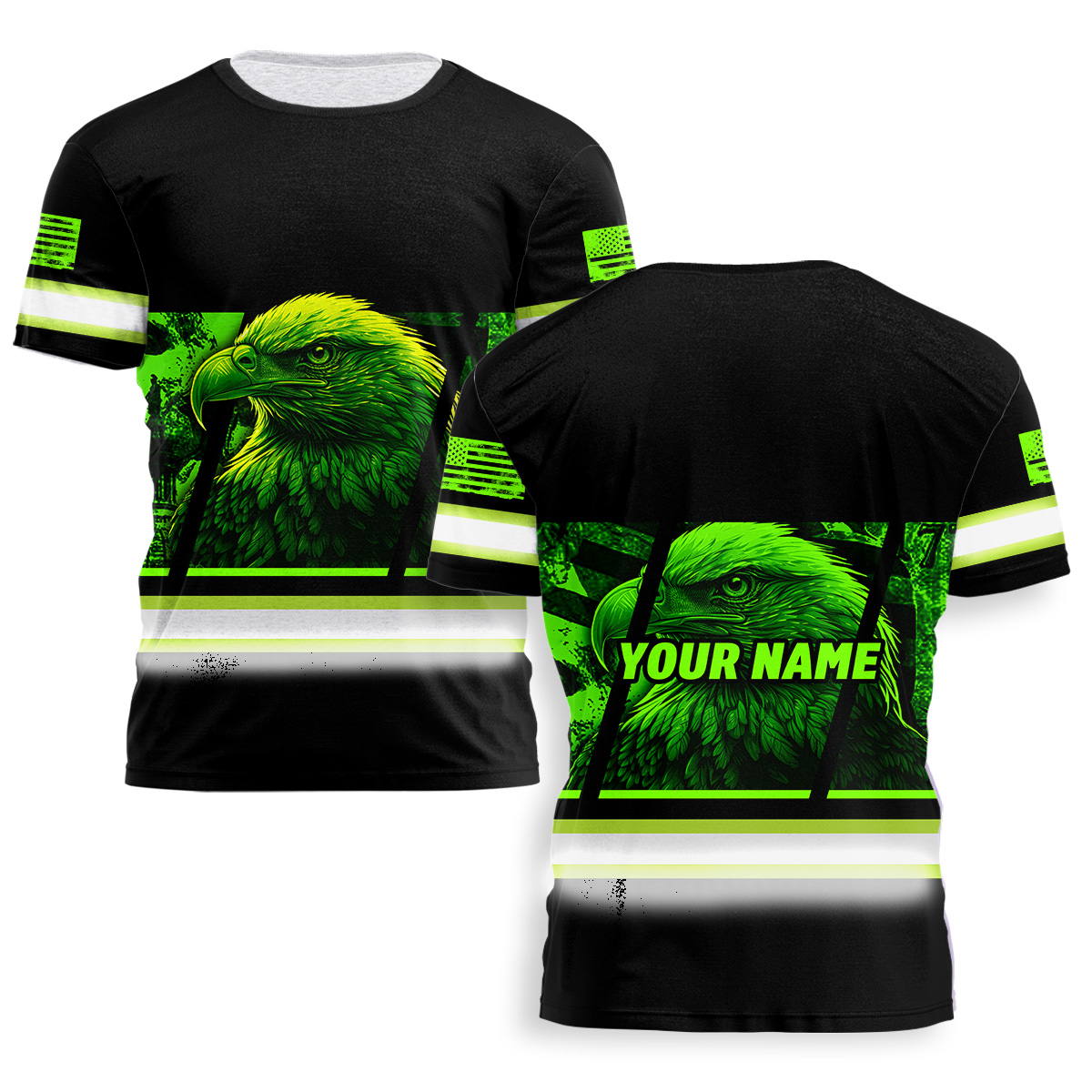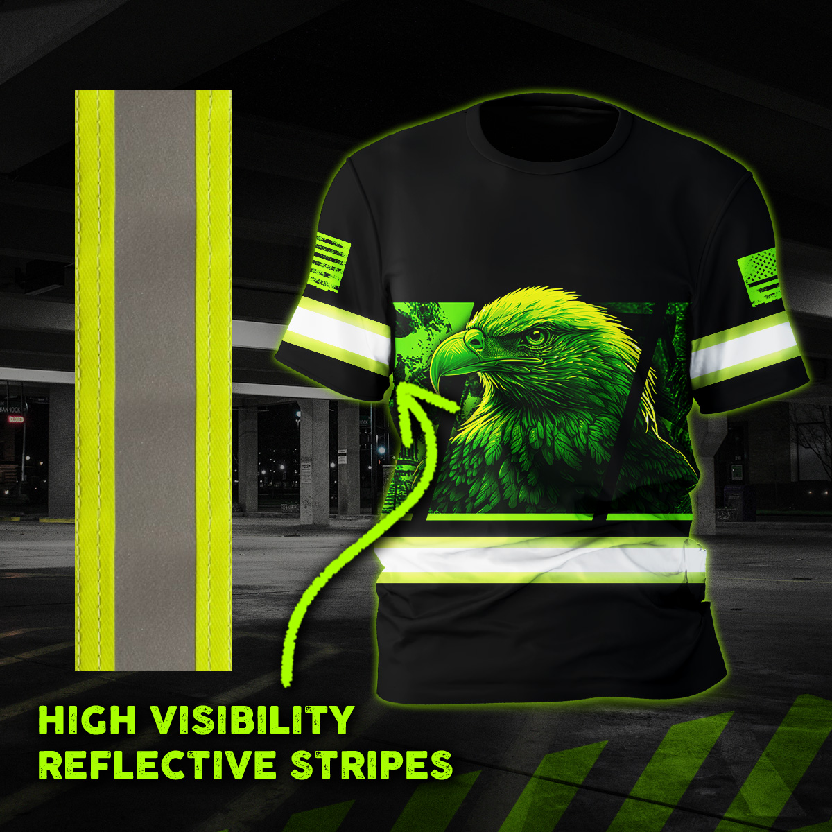 Hi Vis Shirt Reflective Tapes Green Neon Strong US Eagle Custom Name Safety Workwear For Workers, Operator, Cyclists, Patriotic