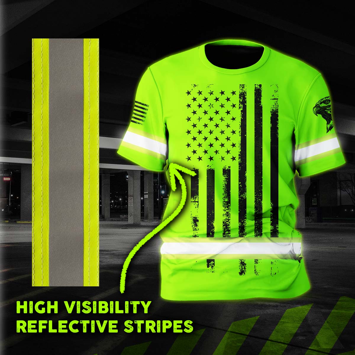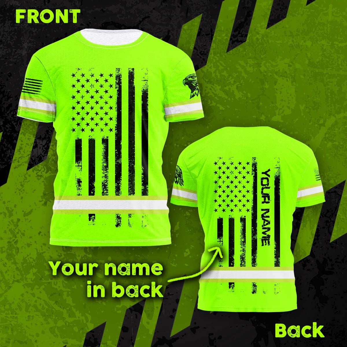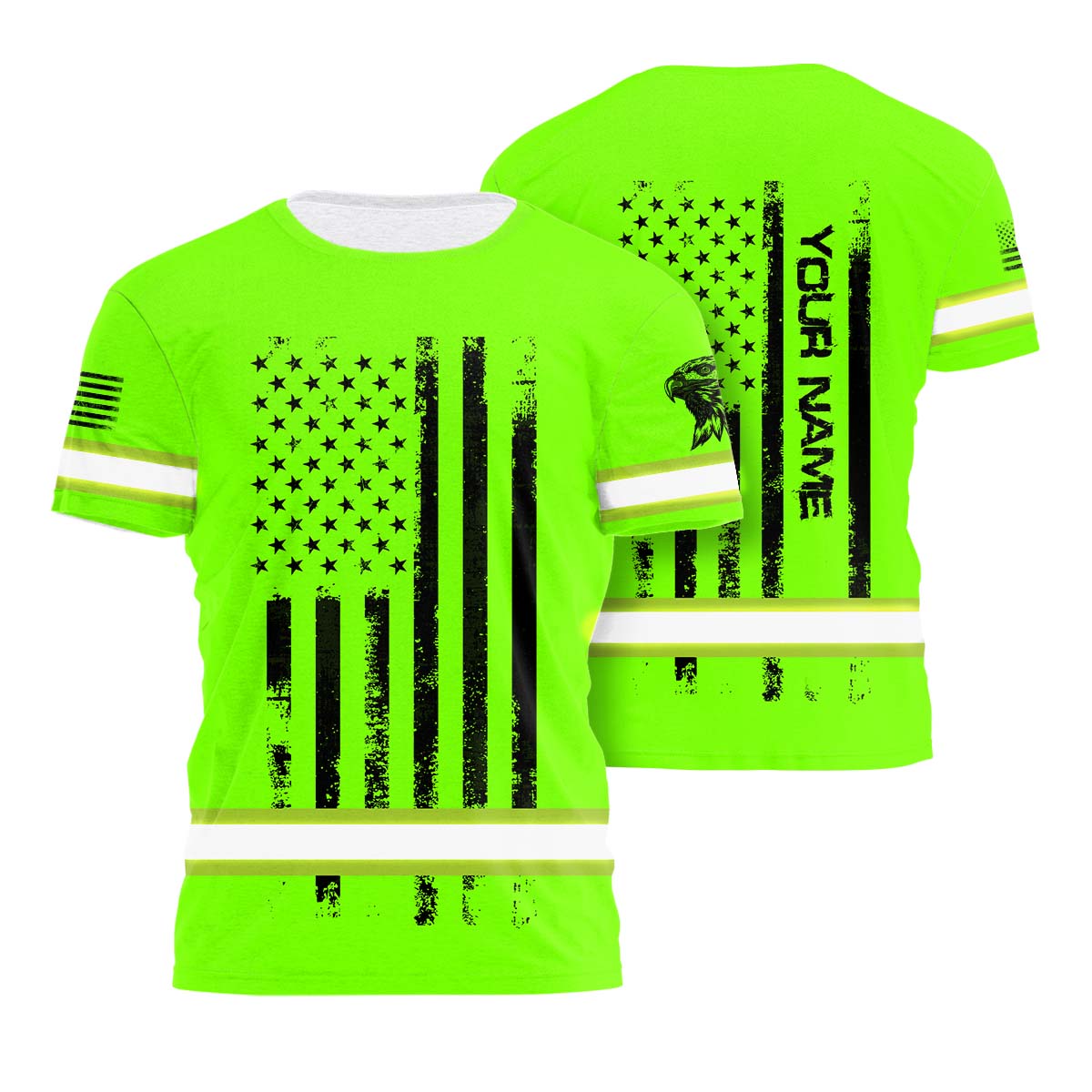 Hi Vis Shirt Reflective Tapes Green Neon US Eagle Flag Custom Name Safety Workwear For Workers, Operator, Cyclists, Patriotic