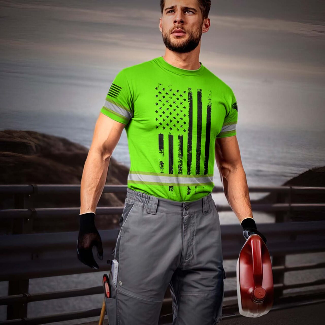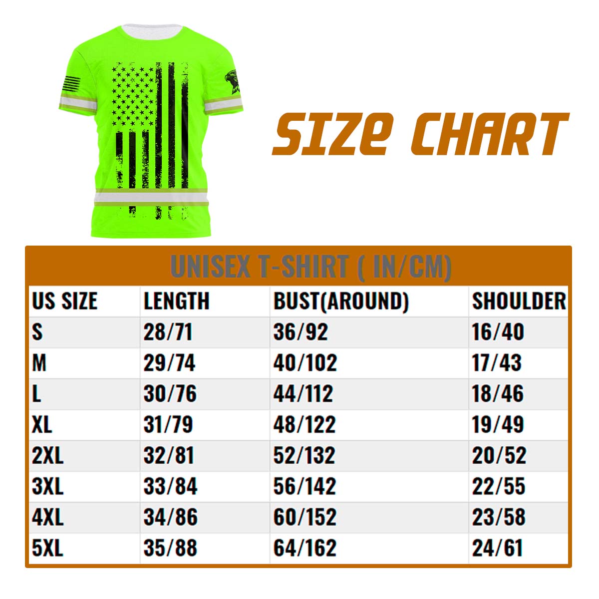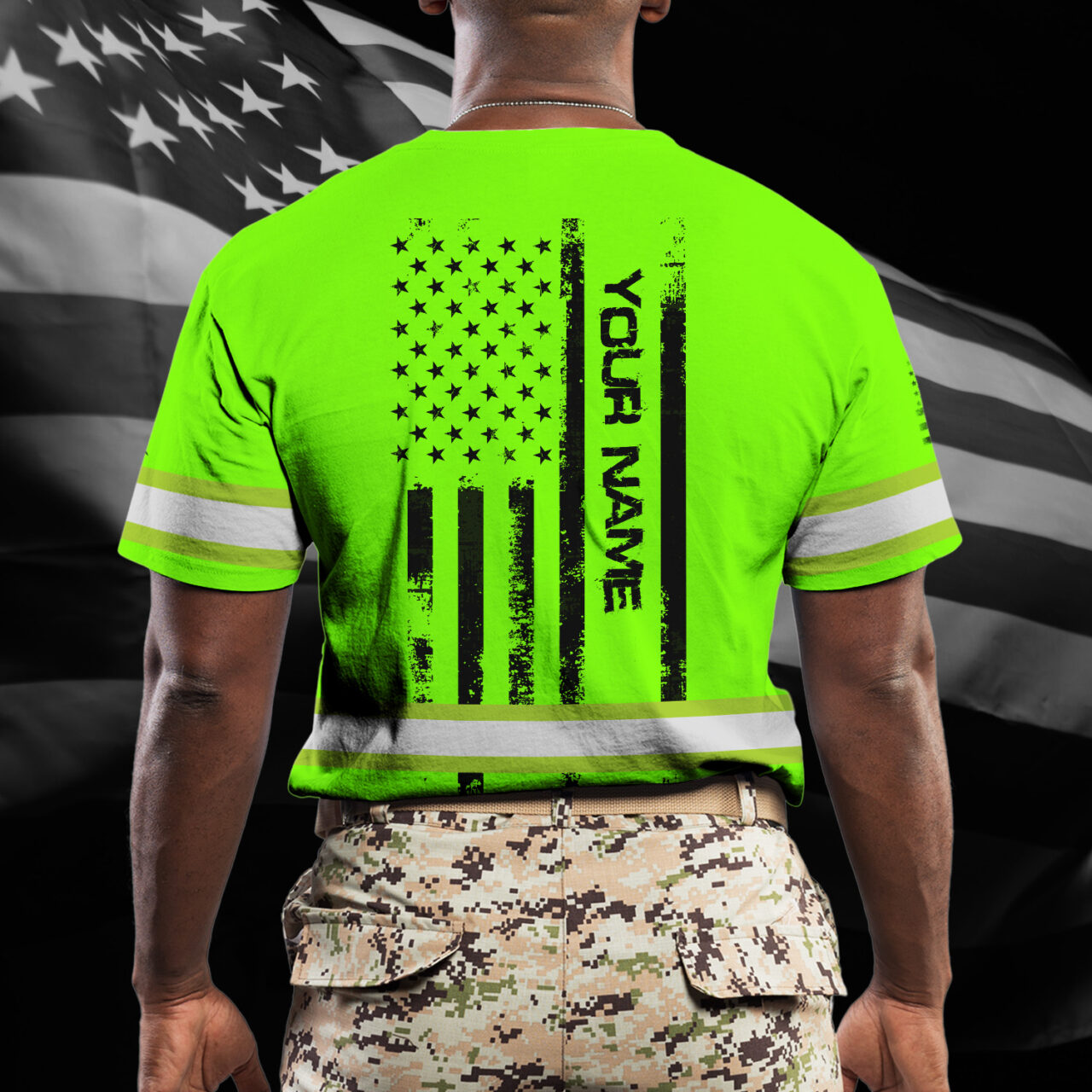 Hi Vis Shirt Reflective Tapes Green Neon US Eagle Flag Custom Name Safety Workwear For Workers, Operator, Cyclists, Patriotic