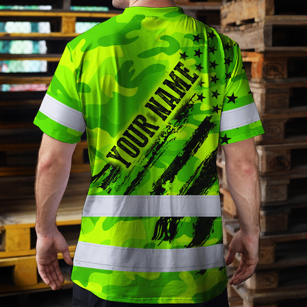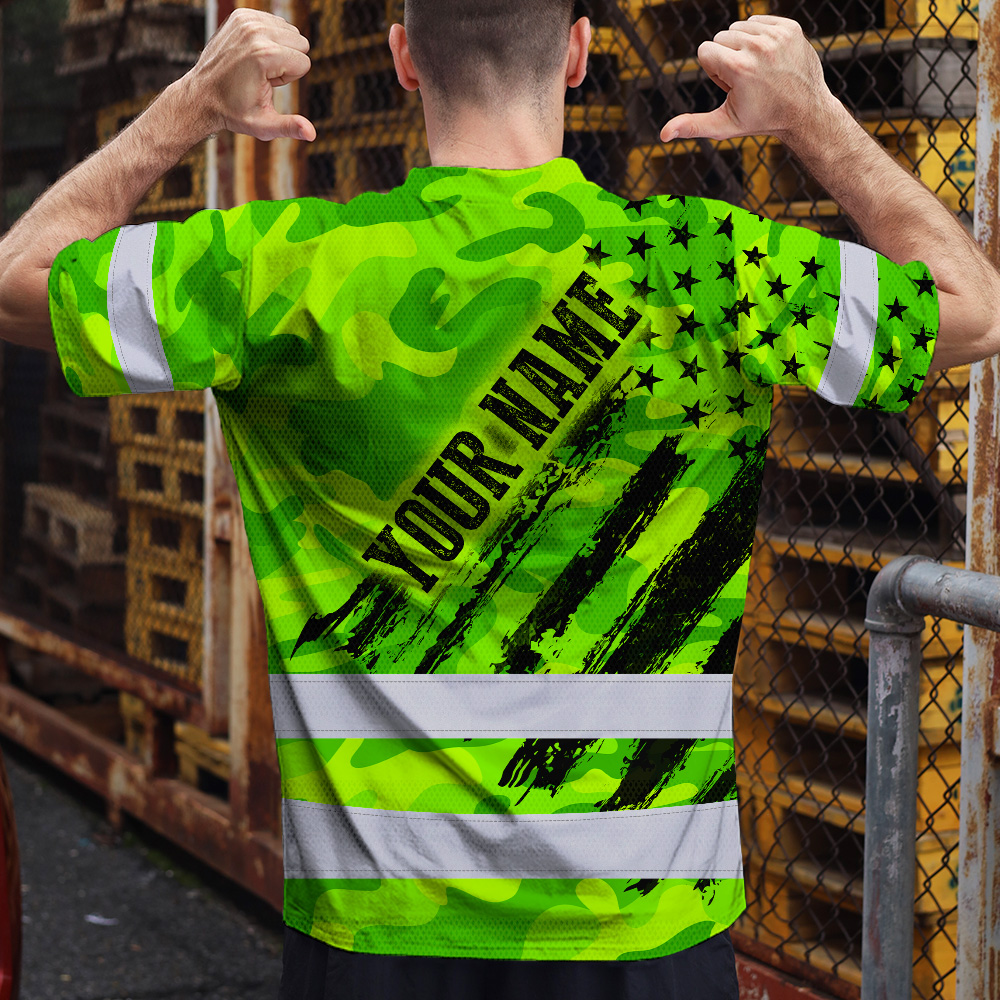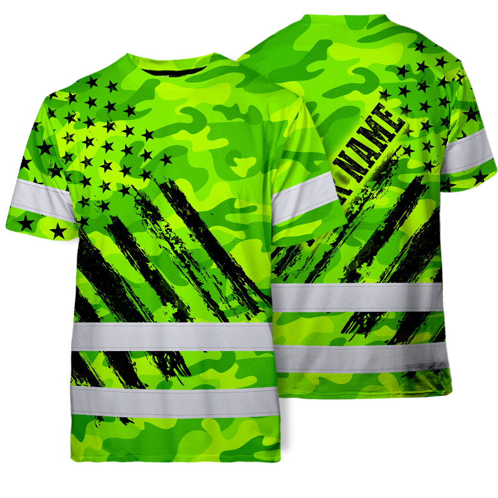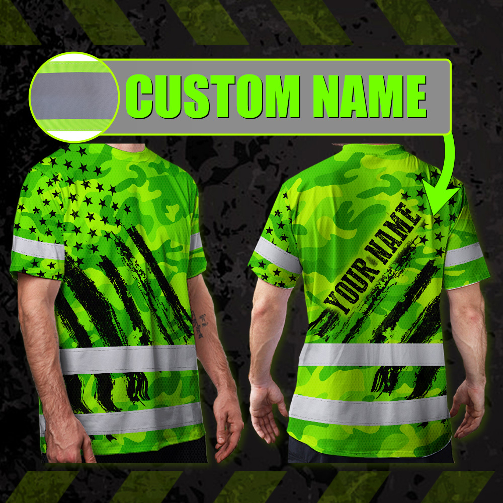 Hi Vis Shirt Reflective Tapes Green Neon US Flag Custom Name Safety Workwear