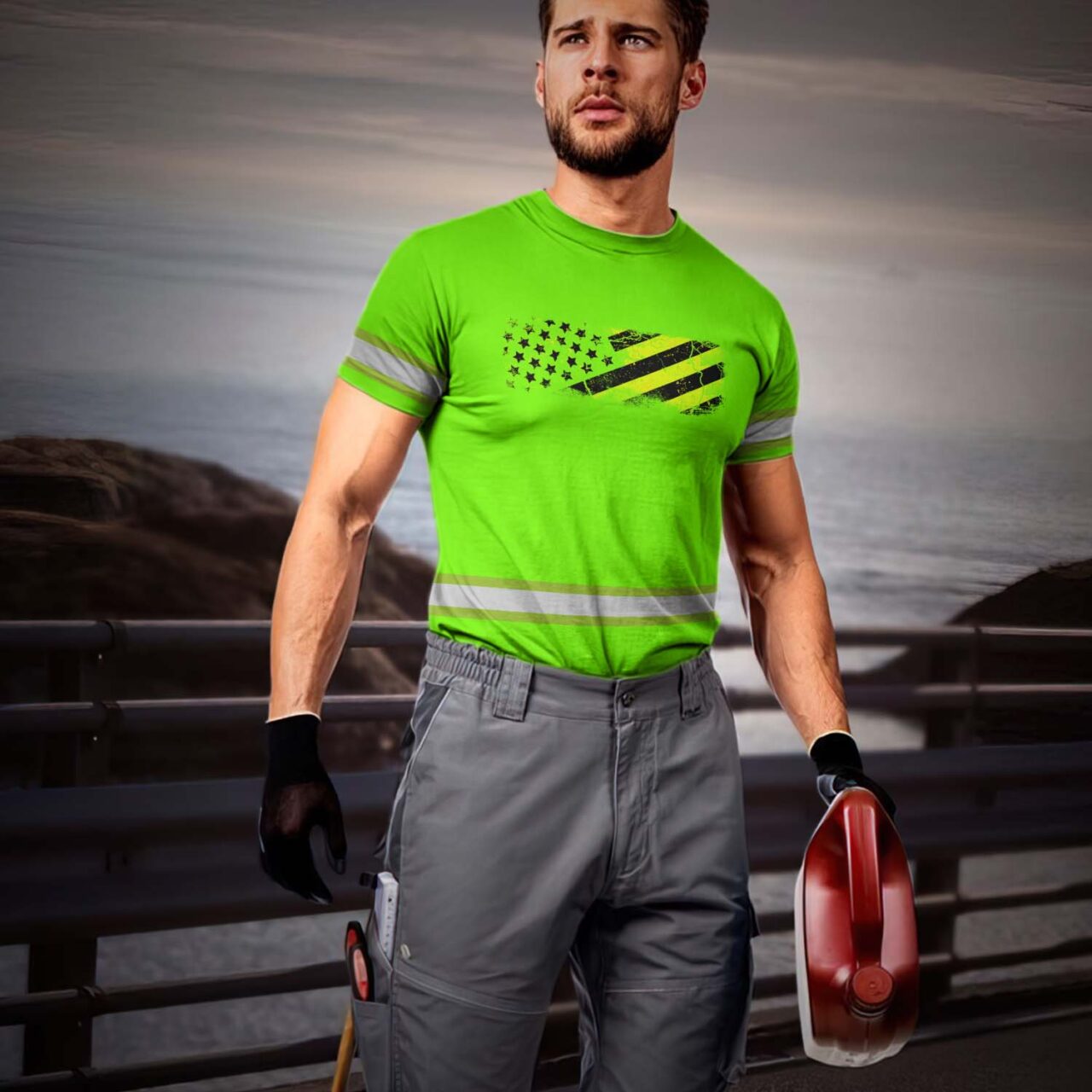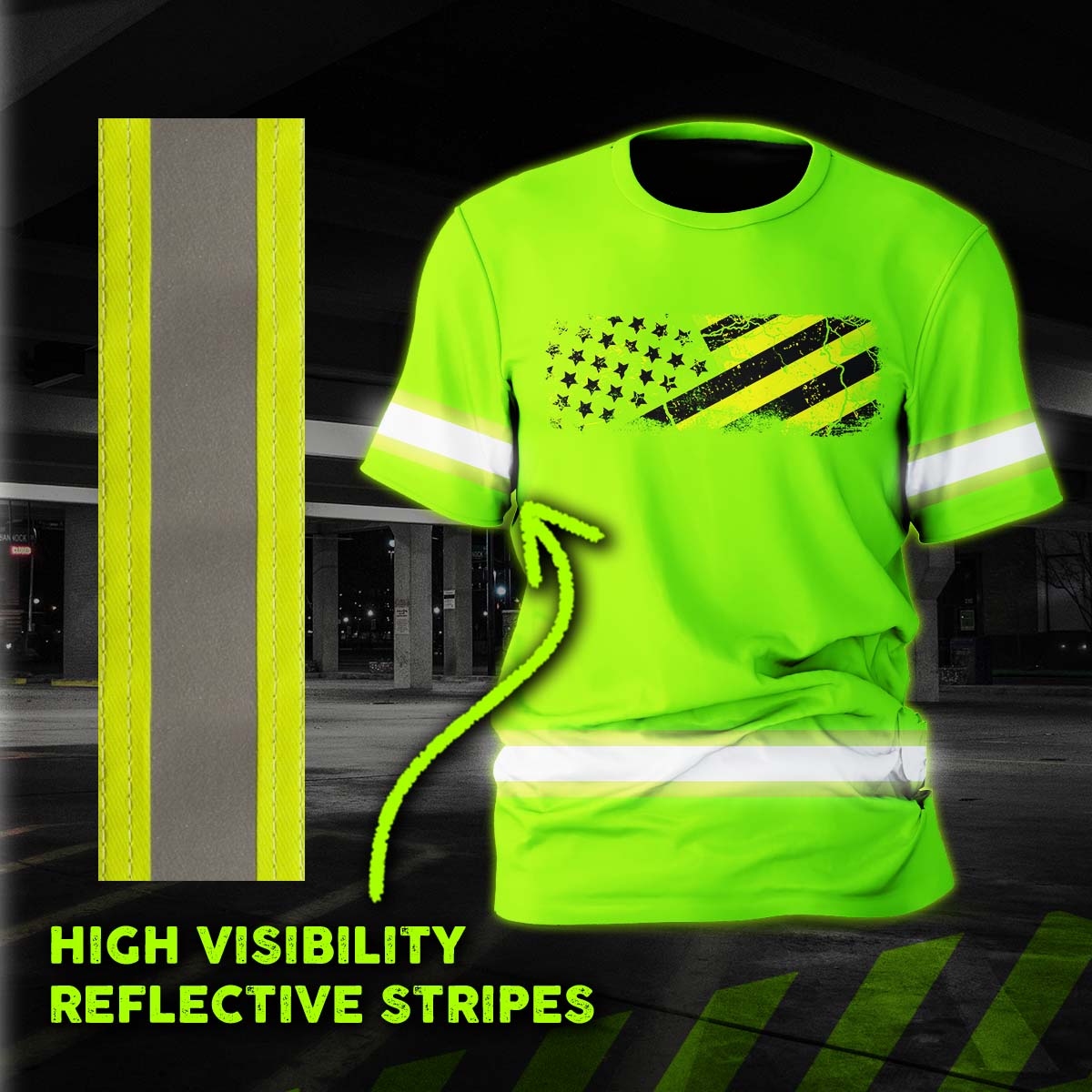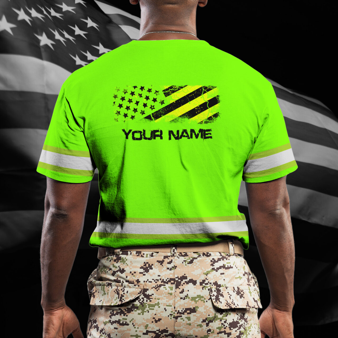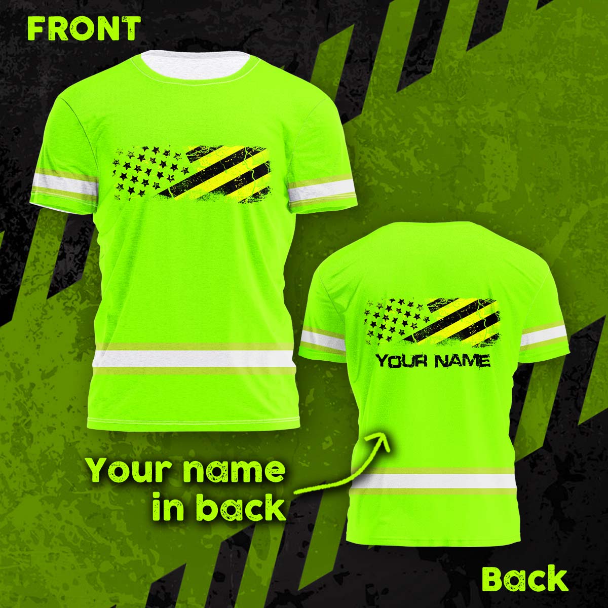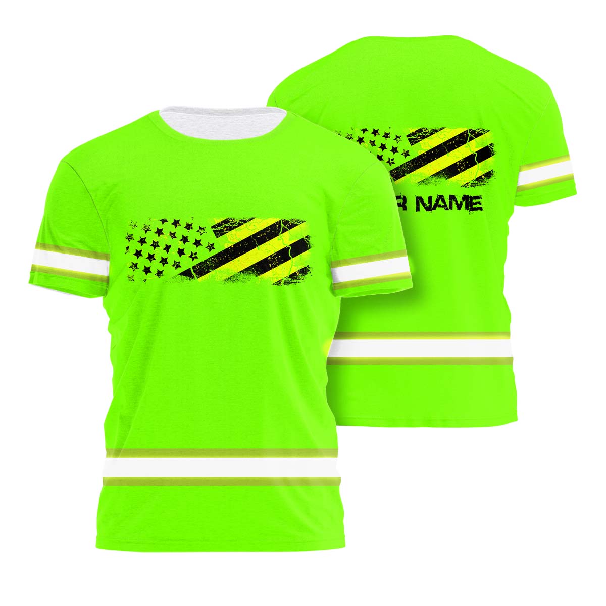 Hi Vis Shirt Reflective Tapes Green Neon US Flag Pride Custom Name Safety Workwear For Workers, Operator, Cyclists, Patriotic