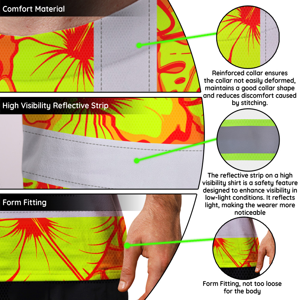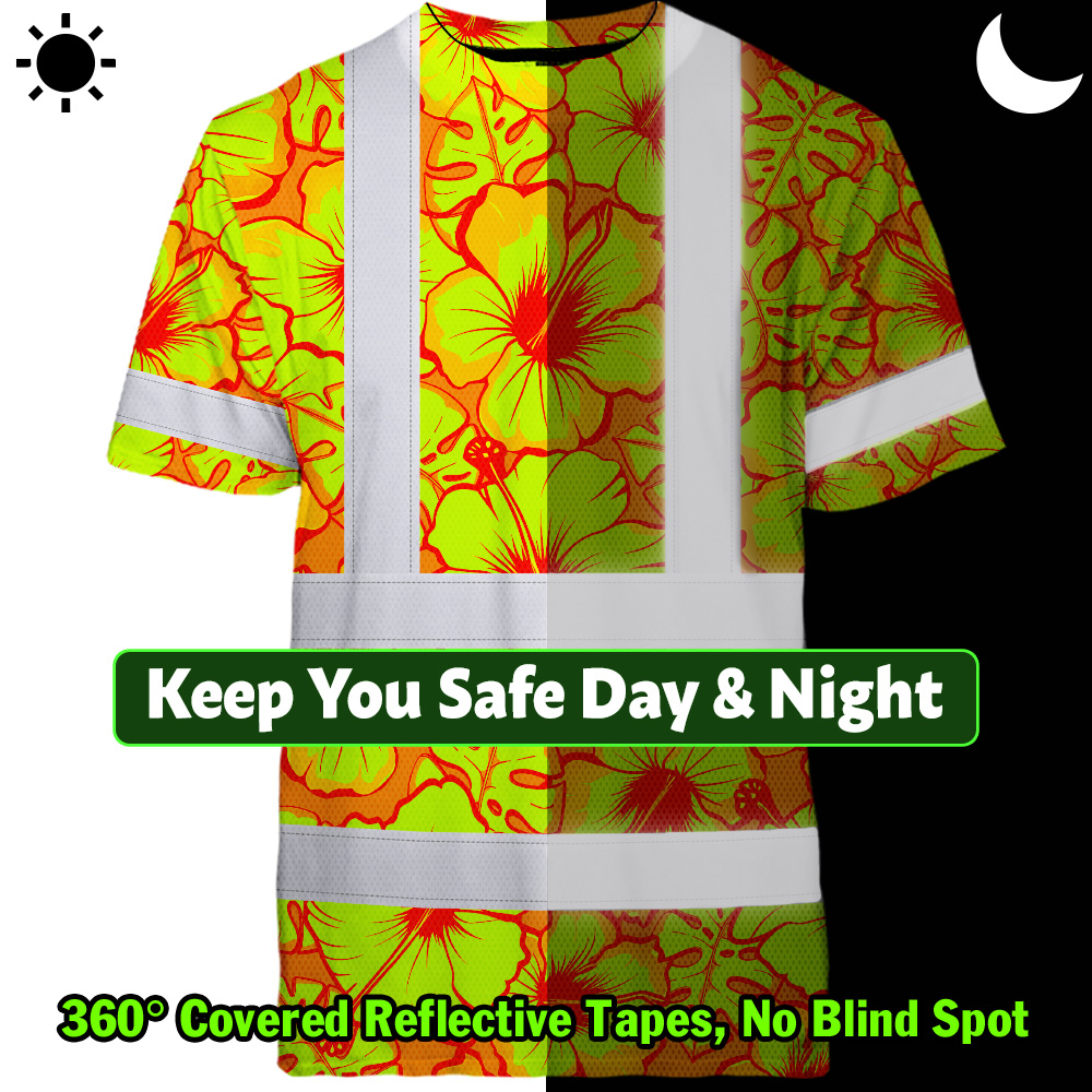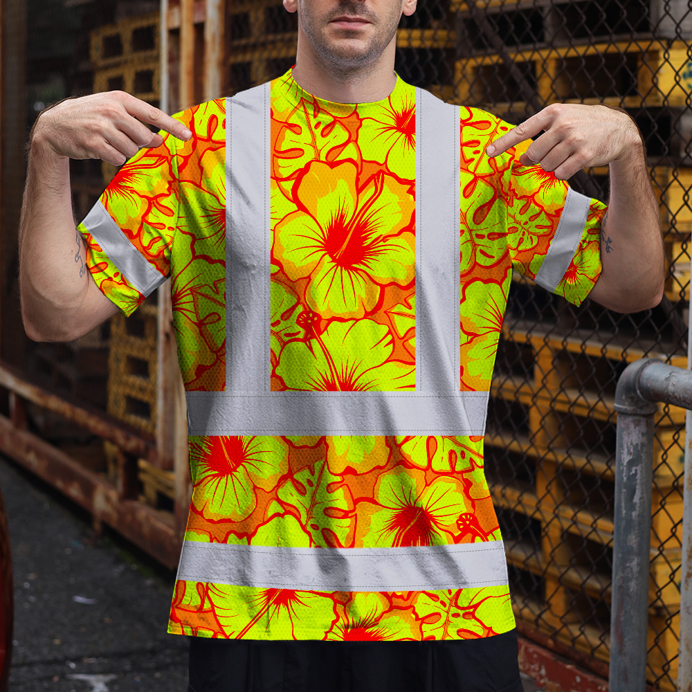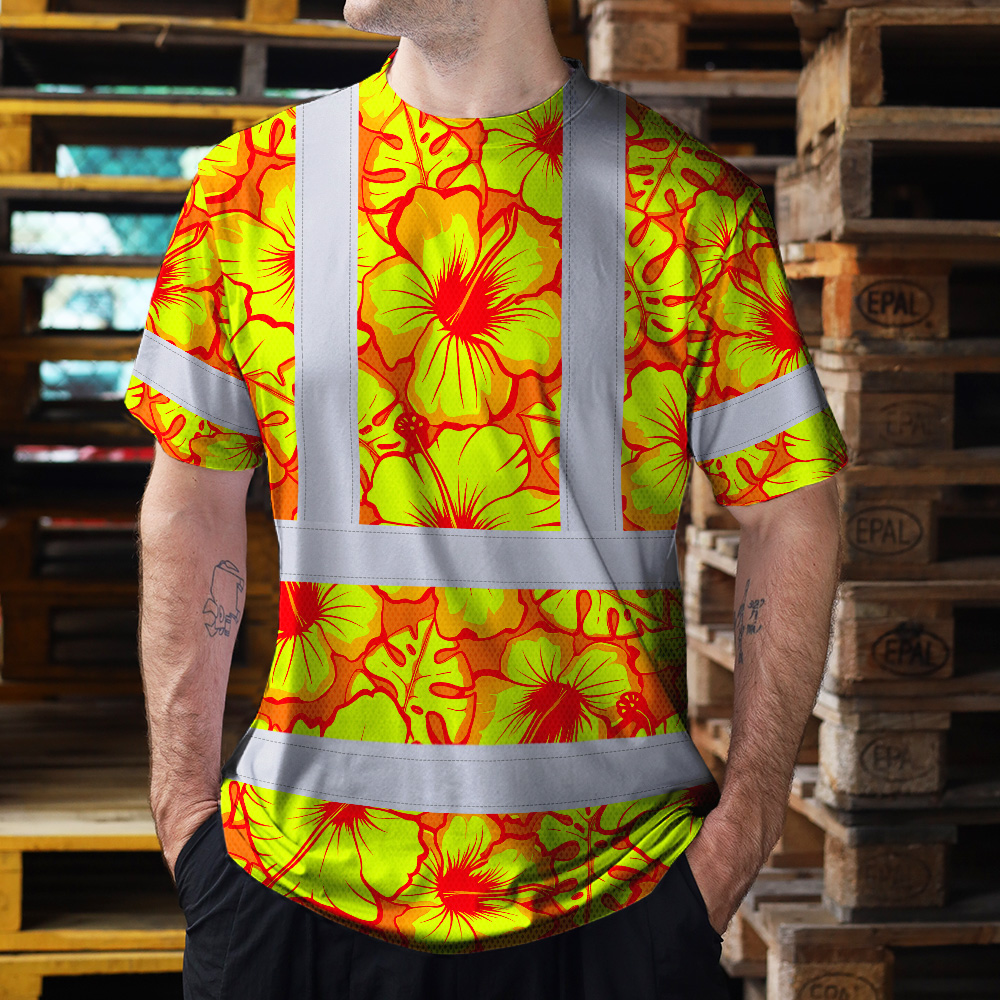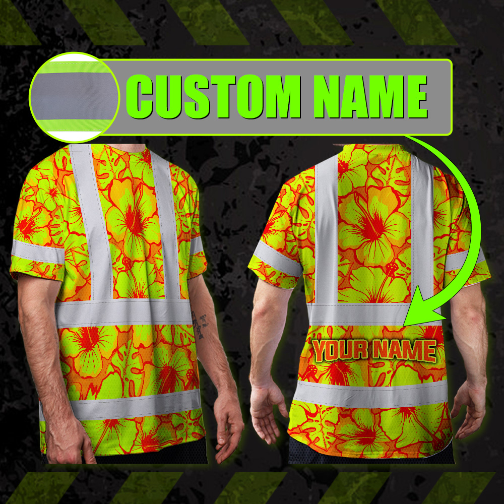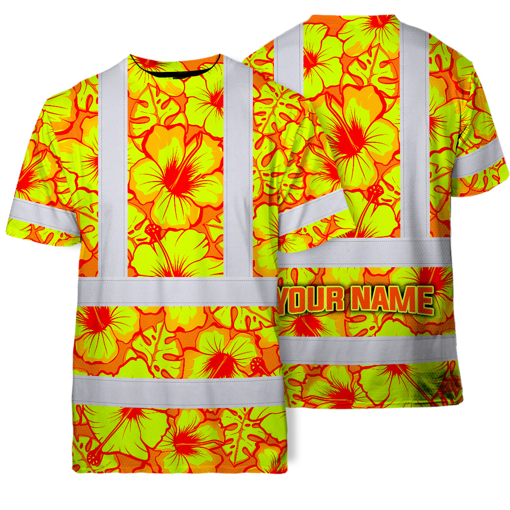 Hi Vis Shirt Reflective Tapes Orange Neon And Yellow Flowers Custom Name Safety Workwear For Workers, Truckers, Operators