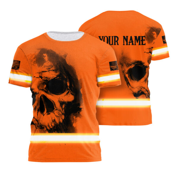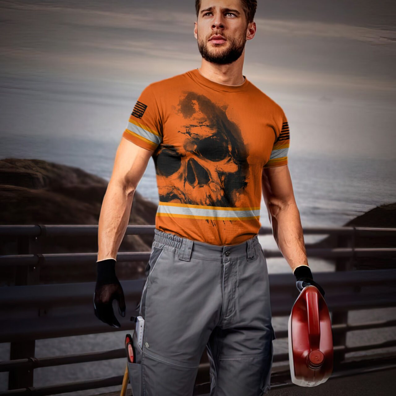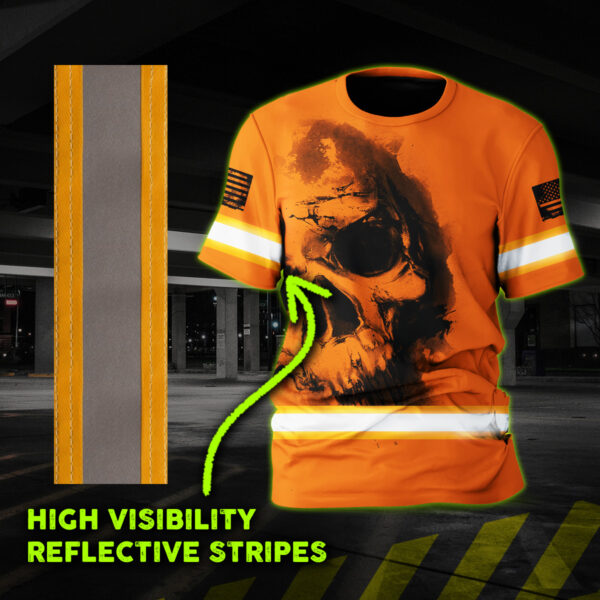Hi Vis Shirt Reflective Tapes Orange Neon Skull Custom Name Safety Workwear For Workers, Runners, Cyclists, Patriotic