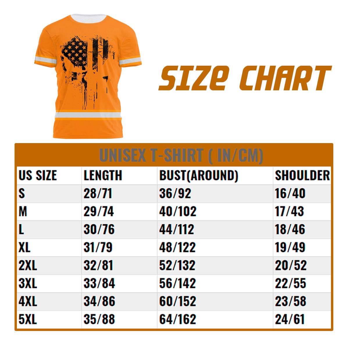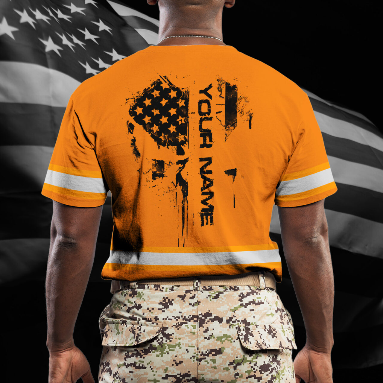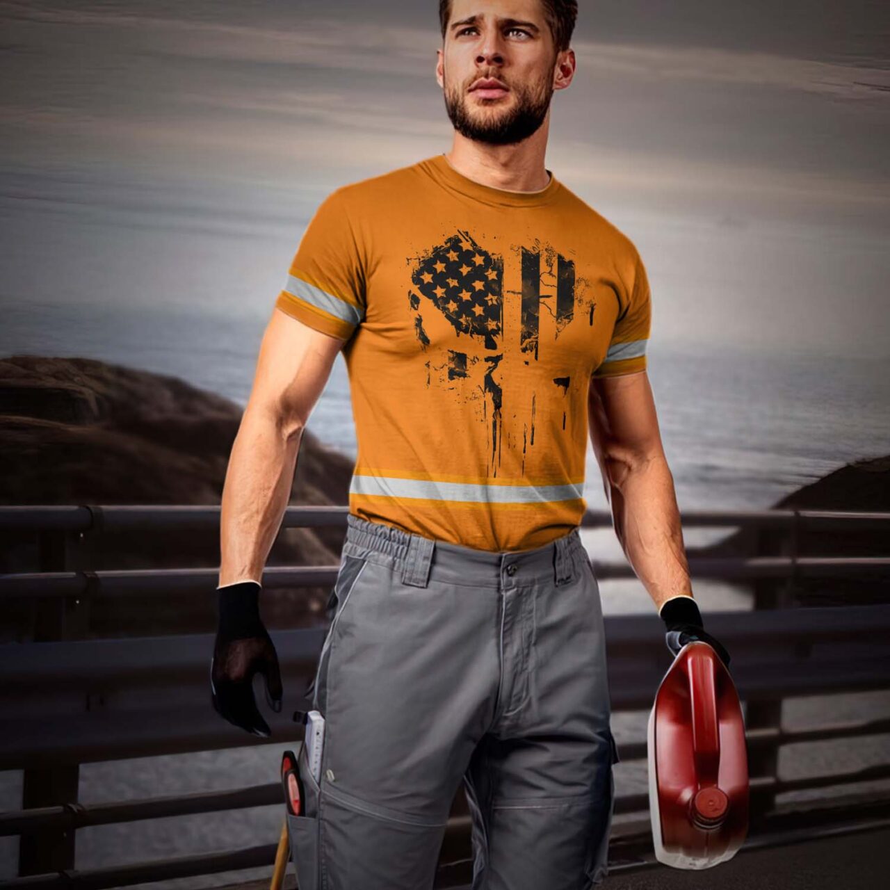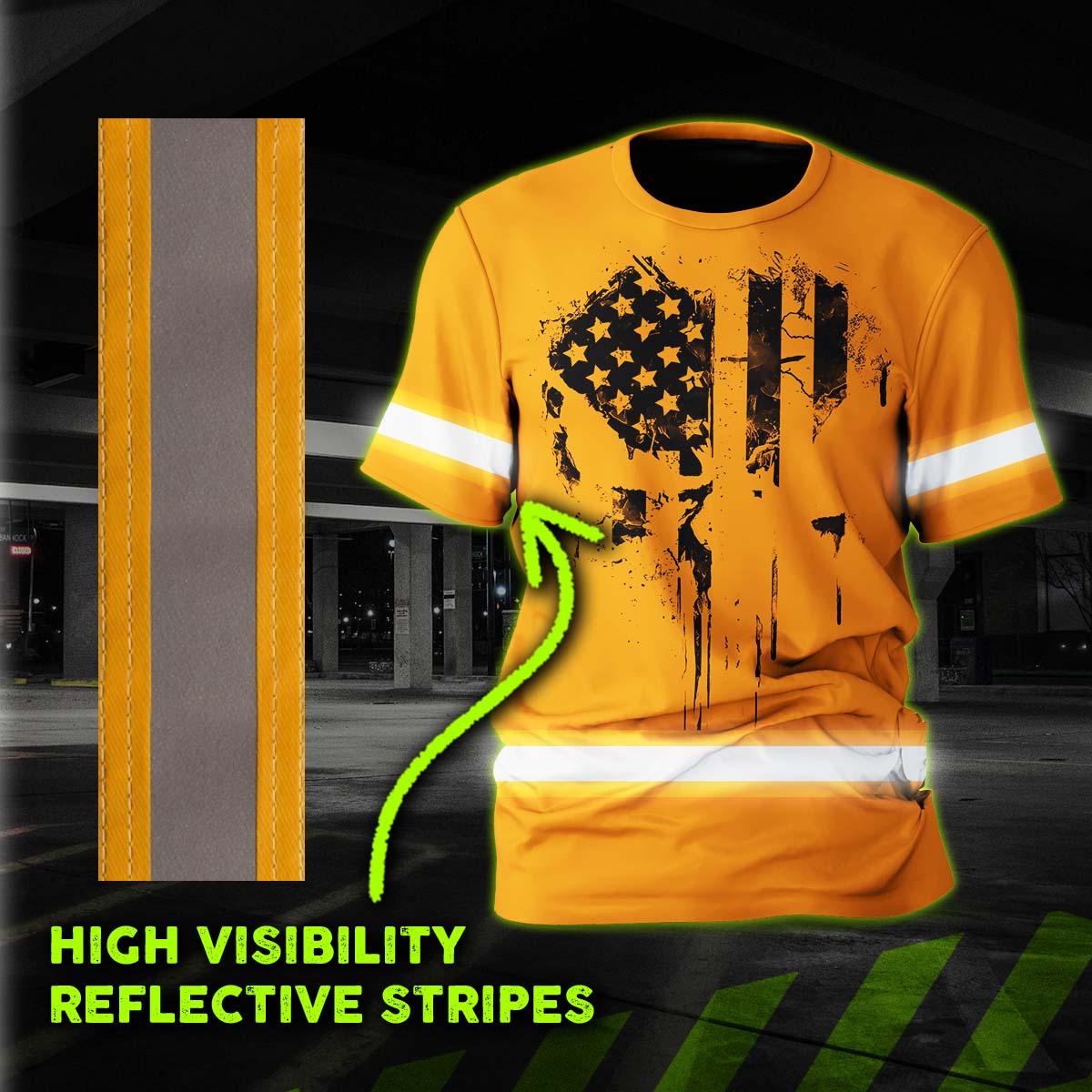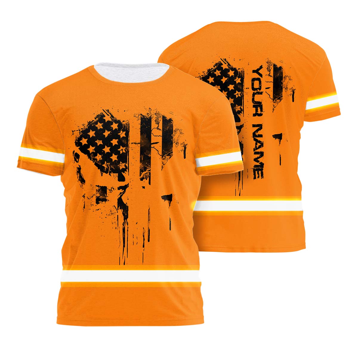Hi Vis Shirt Reflective Tapes Orange Neon USA Flag Skull Custom Name Safety Workwear For Truckers, Workers, Operator, Cyclists, Patriotic