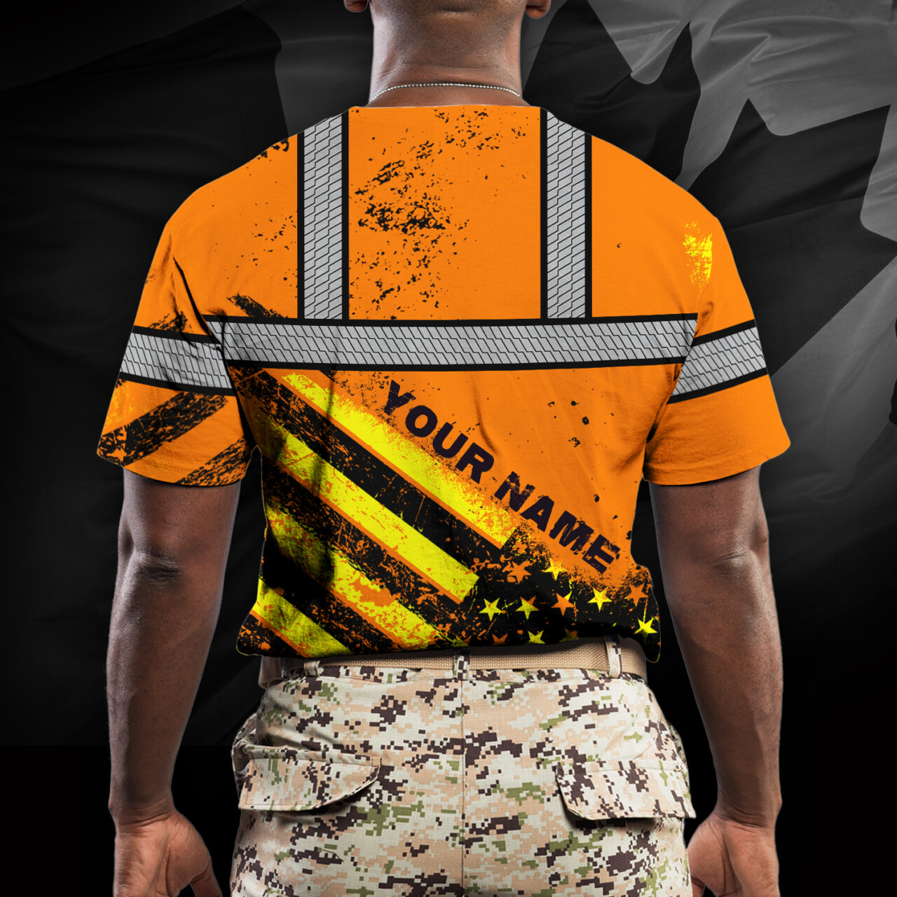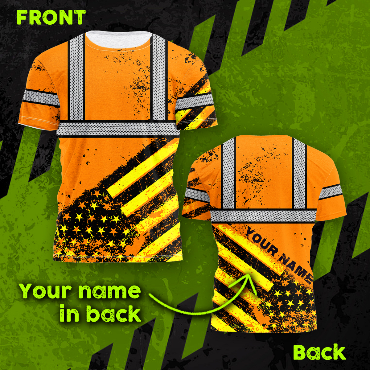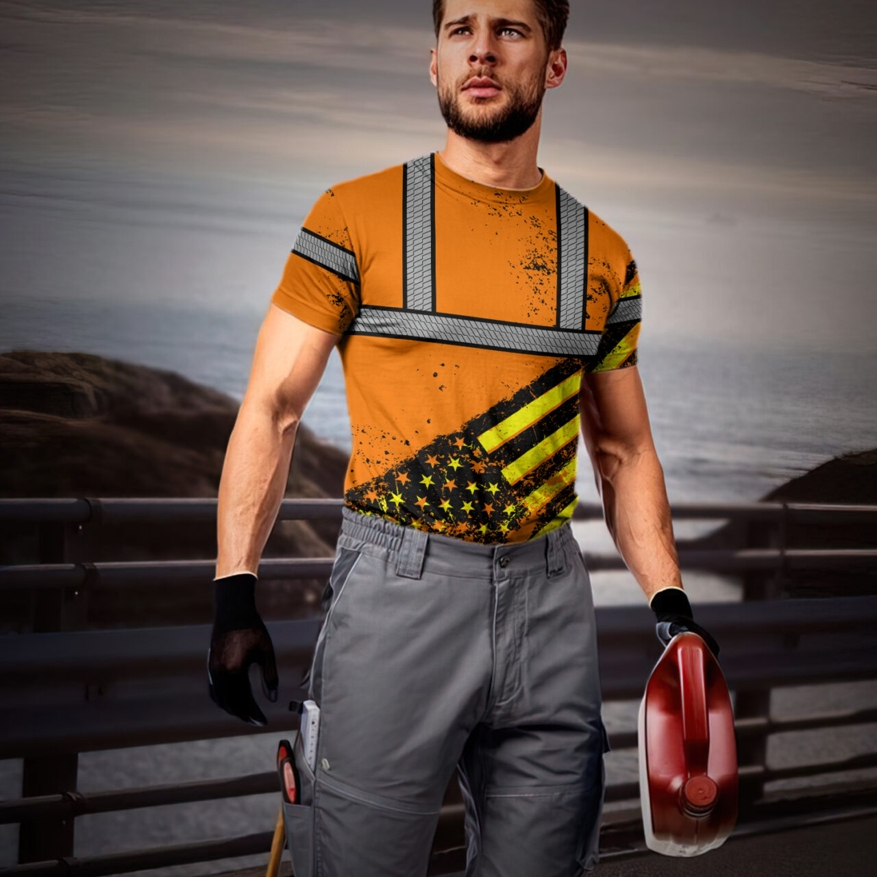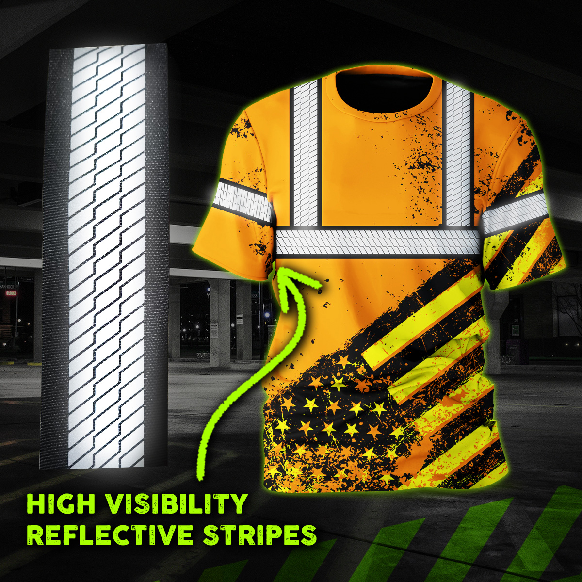 Hi Vis Shirt Reflective Tapes Orange USA Flag Safety Workwear For Workers, Runners, Cyclists, Patriotic