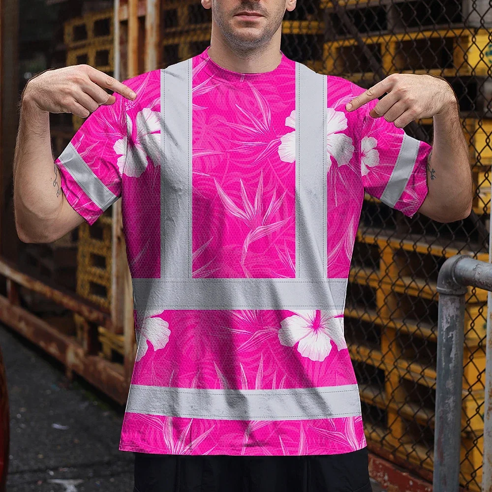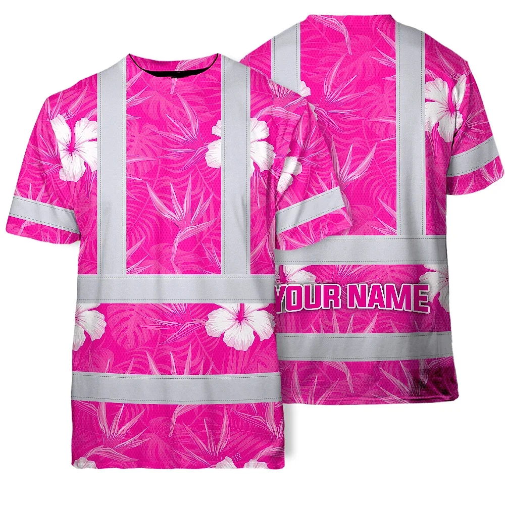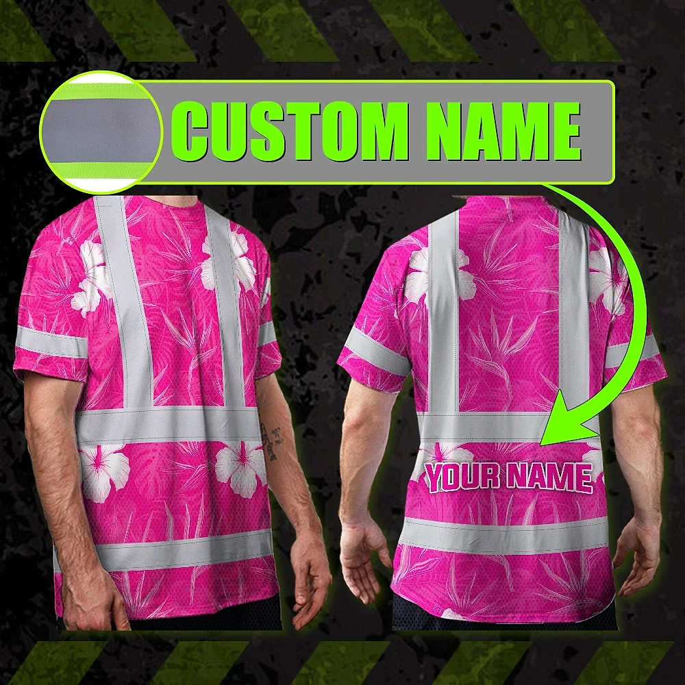 Hi Vis Shirt Reflective Tapes Pink Neon Flowers Custom Name Safety Workwear For Workers, Truckers, Operators