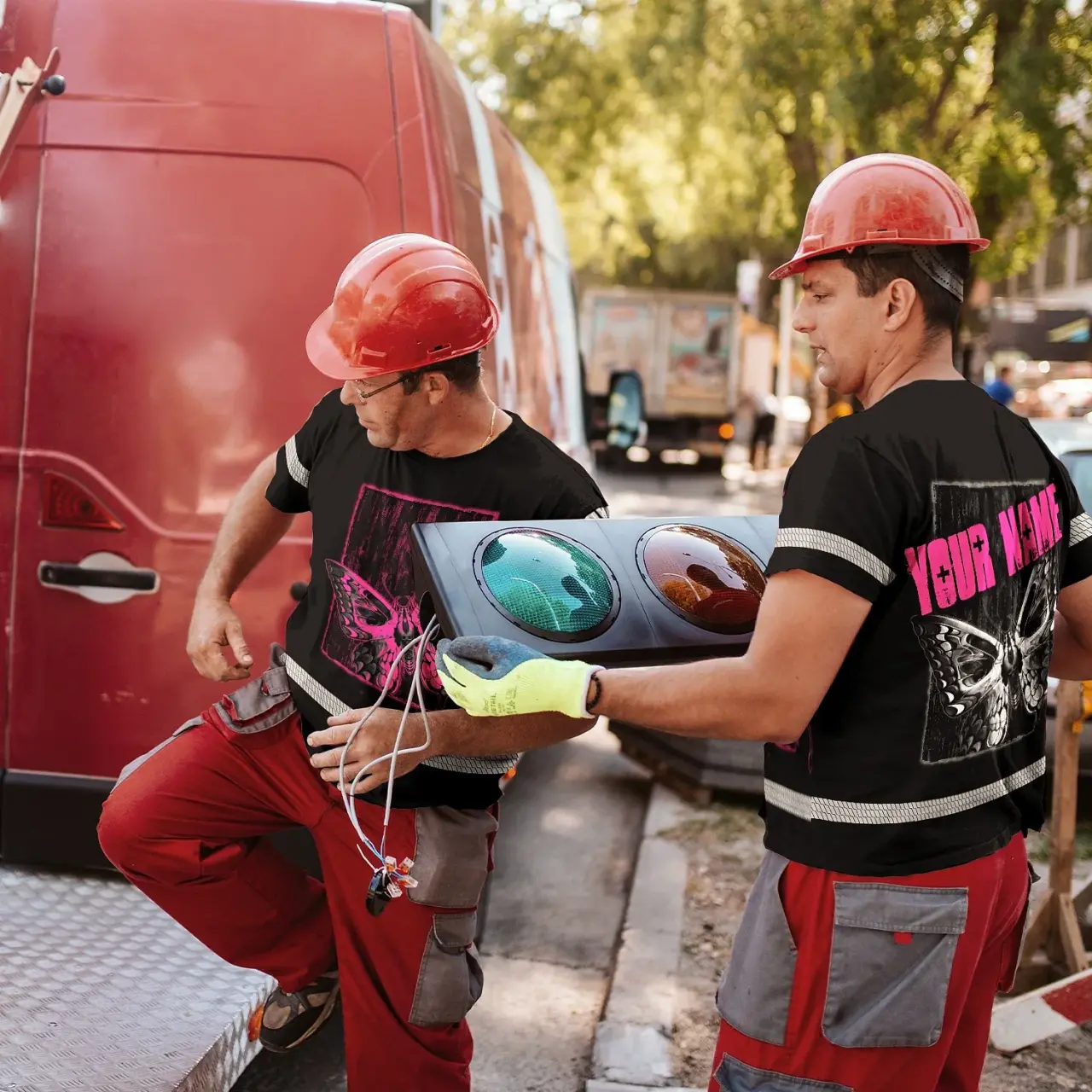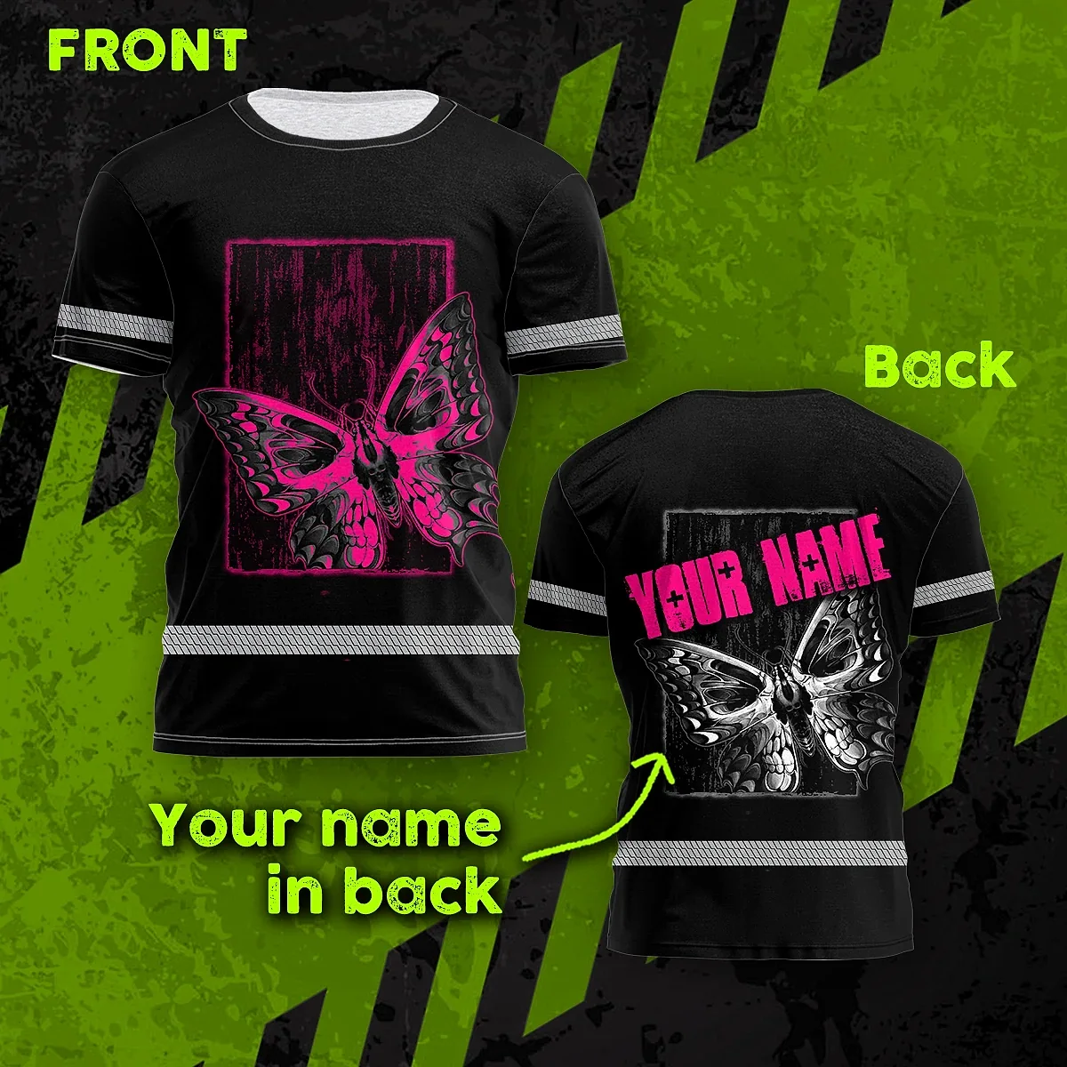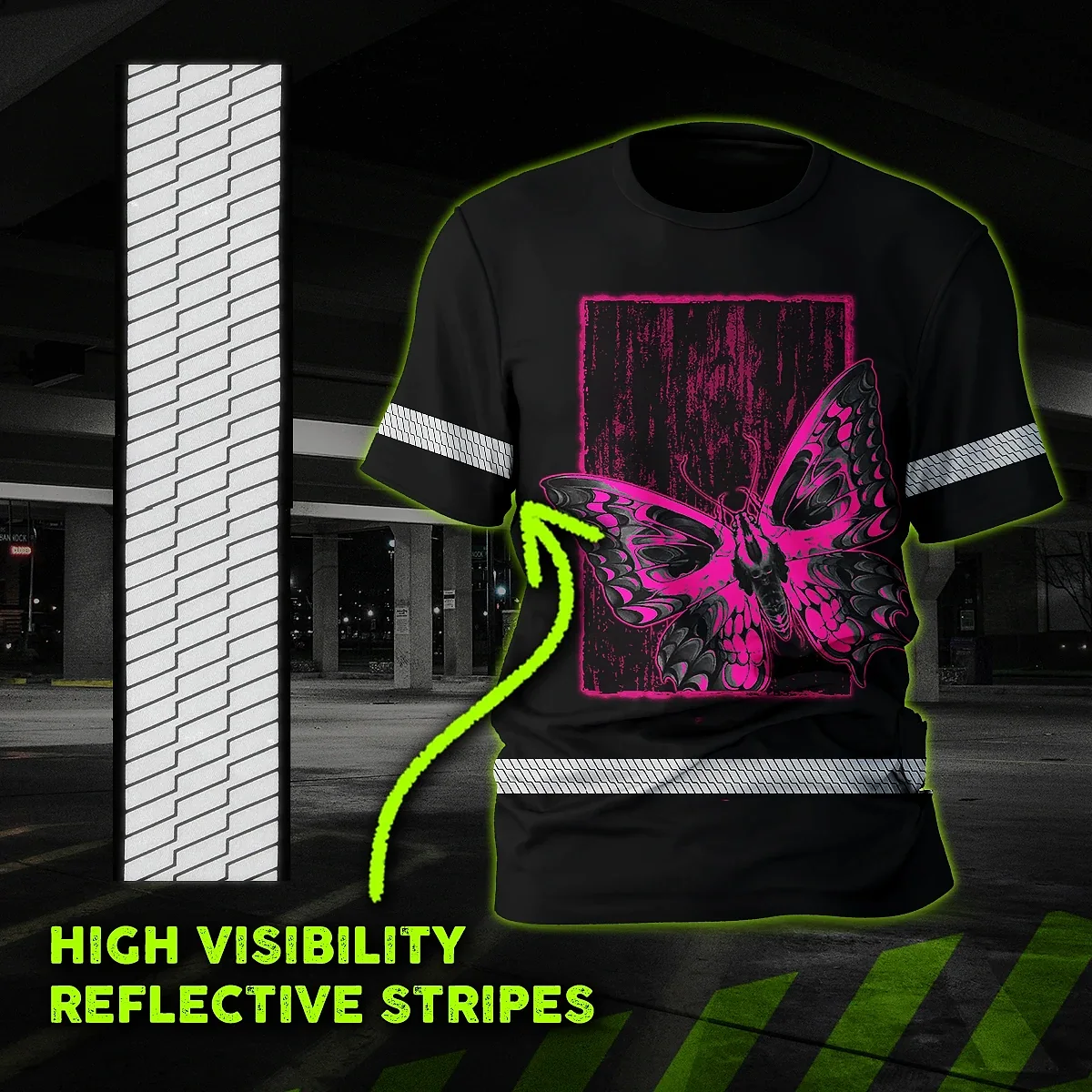 Hi Vis Shirt Reflective Tapes Pink Neon Skull Butterfly Shirt Custom Name Safety Workwear For Workers, Truckers, Operators