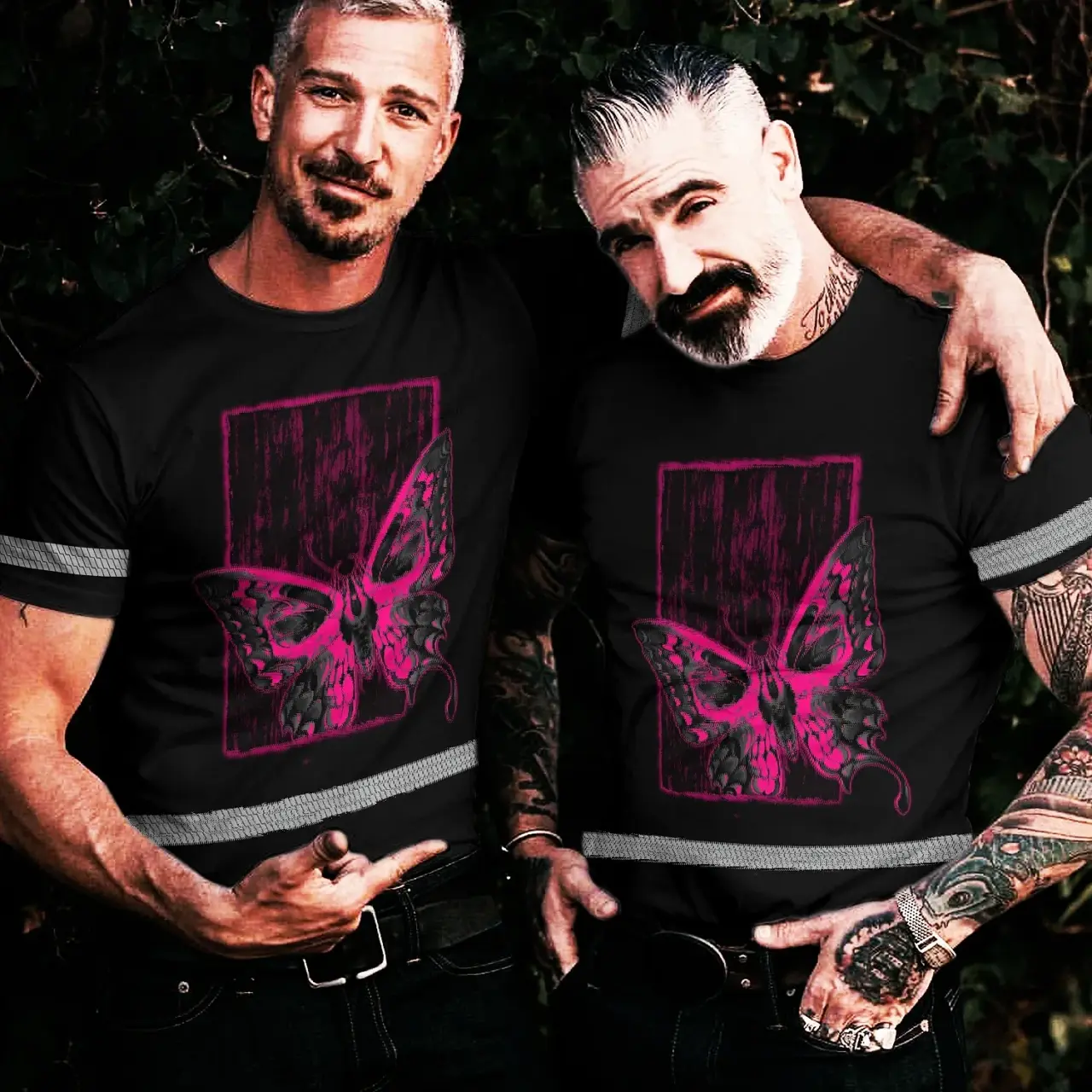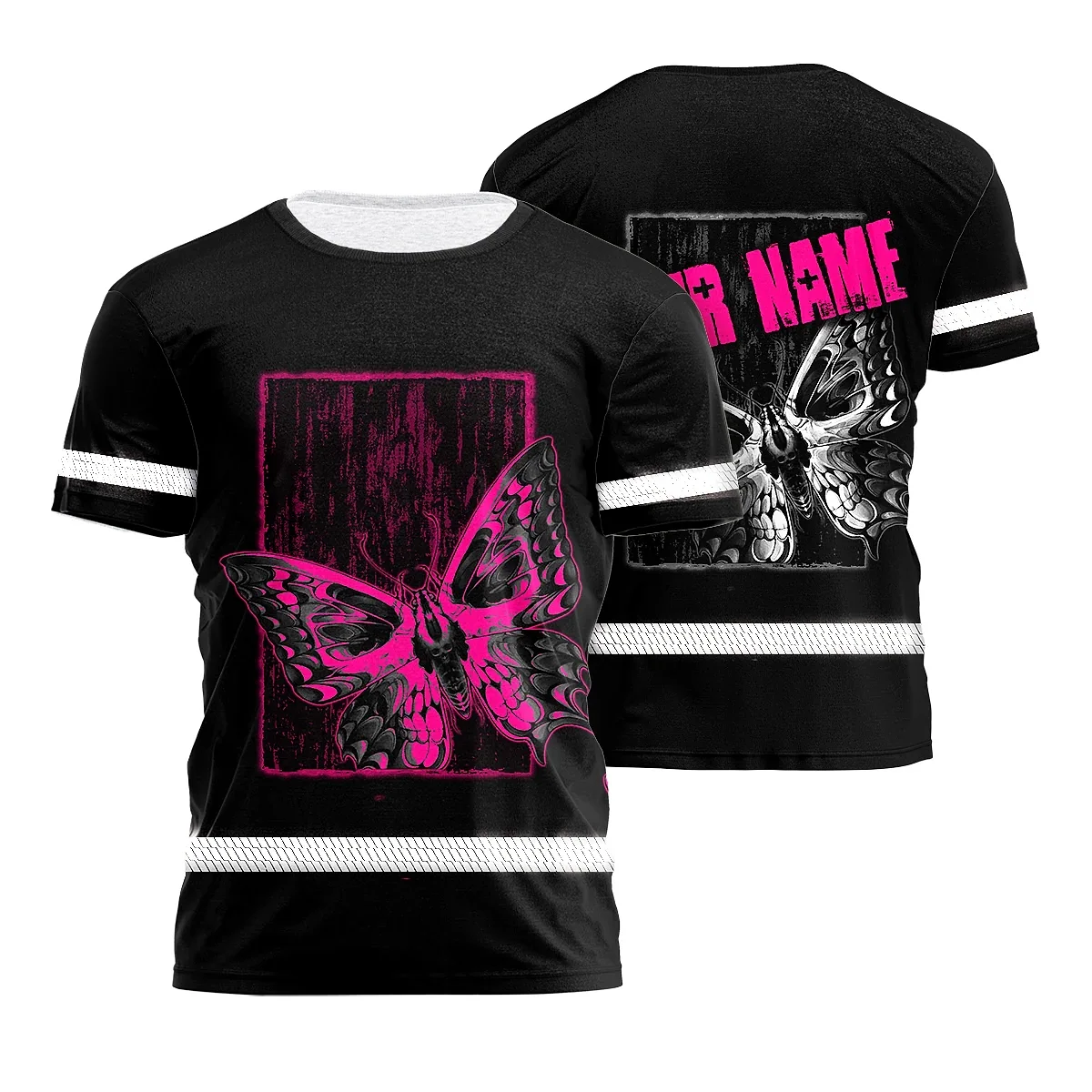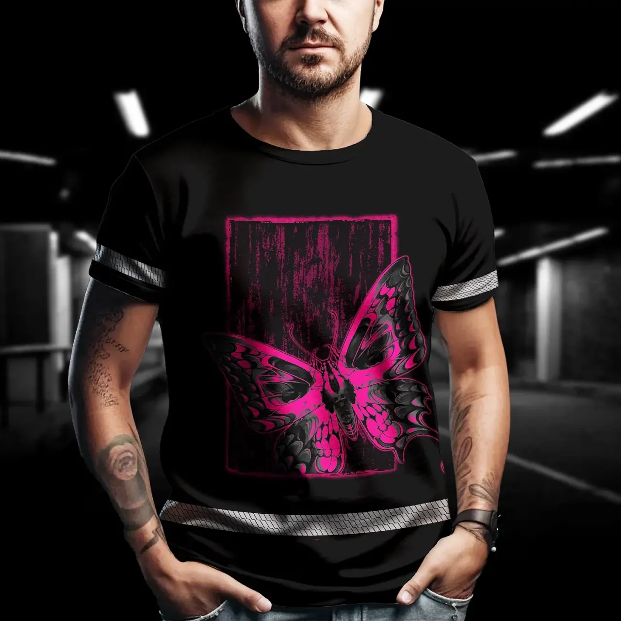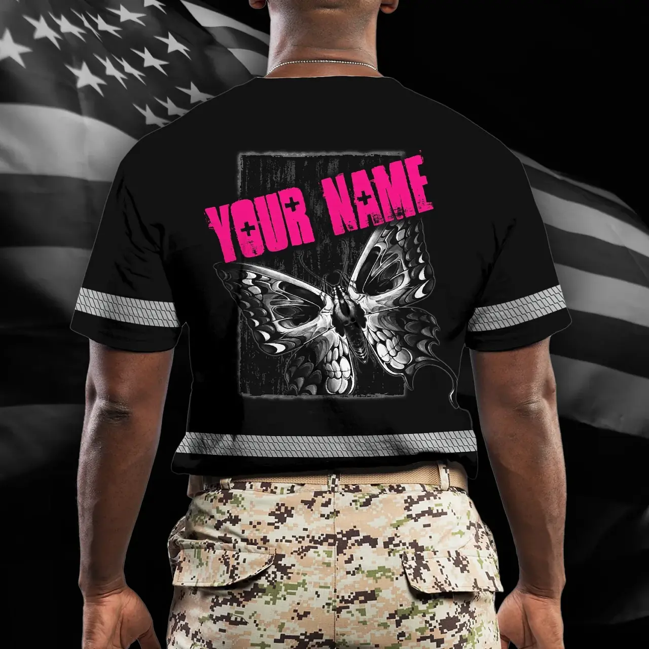 Hi Vis Shirt Reflective Tapes Pink Neon Skull Butterfly Shirt Custom Name Safety Workwear For Workers, Truckers, Operators