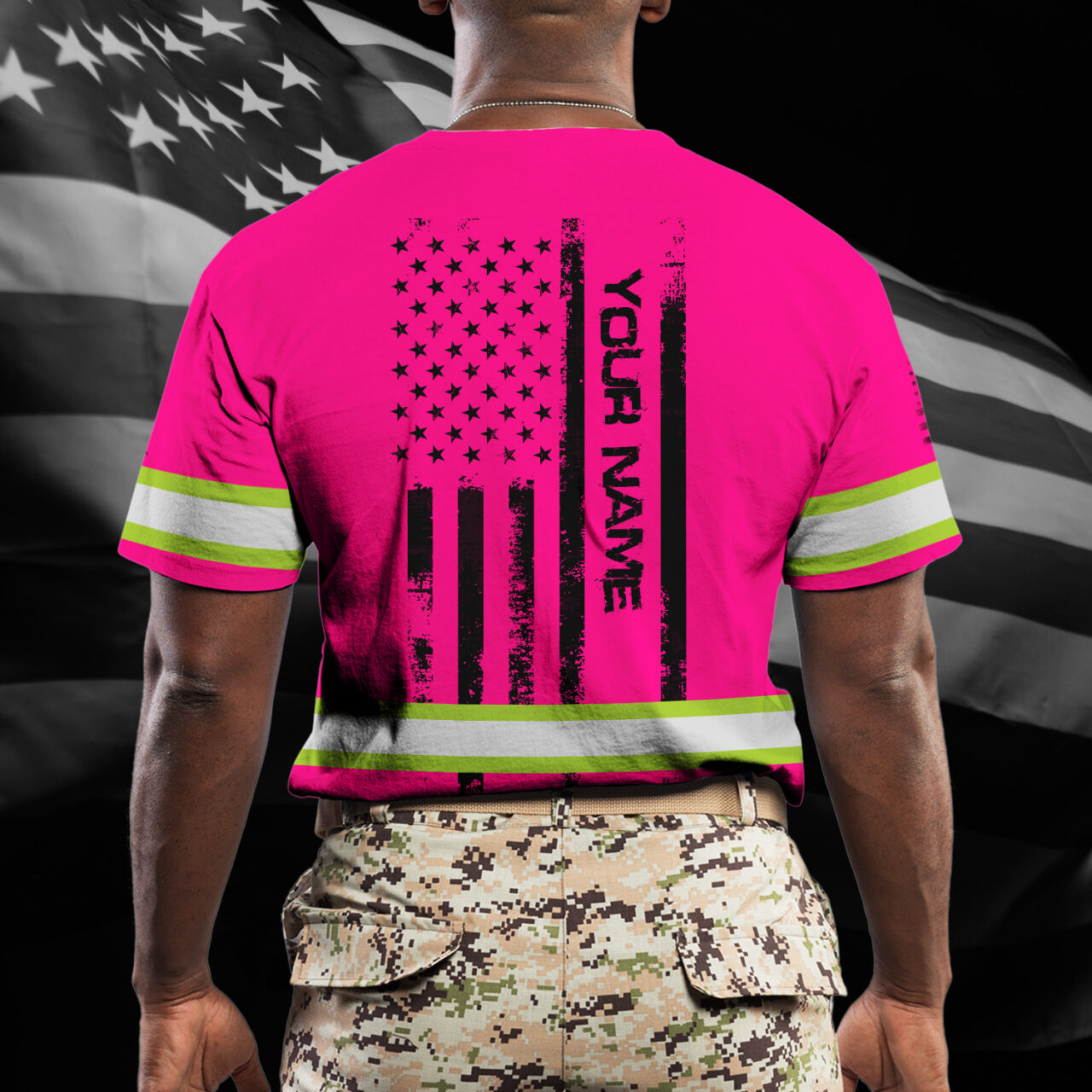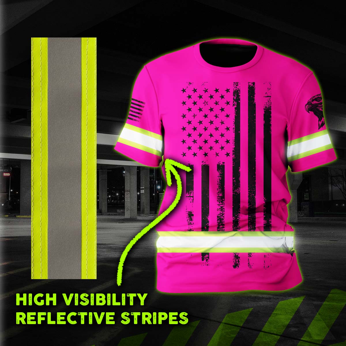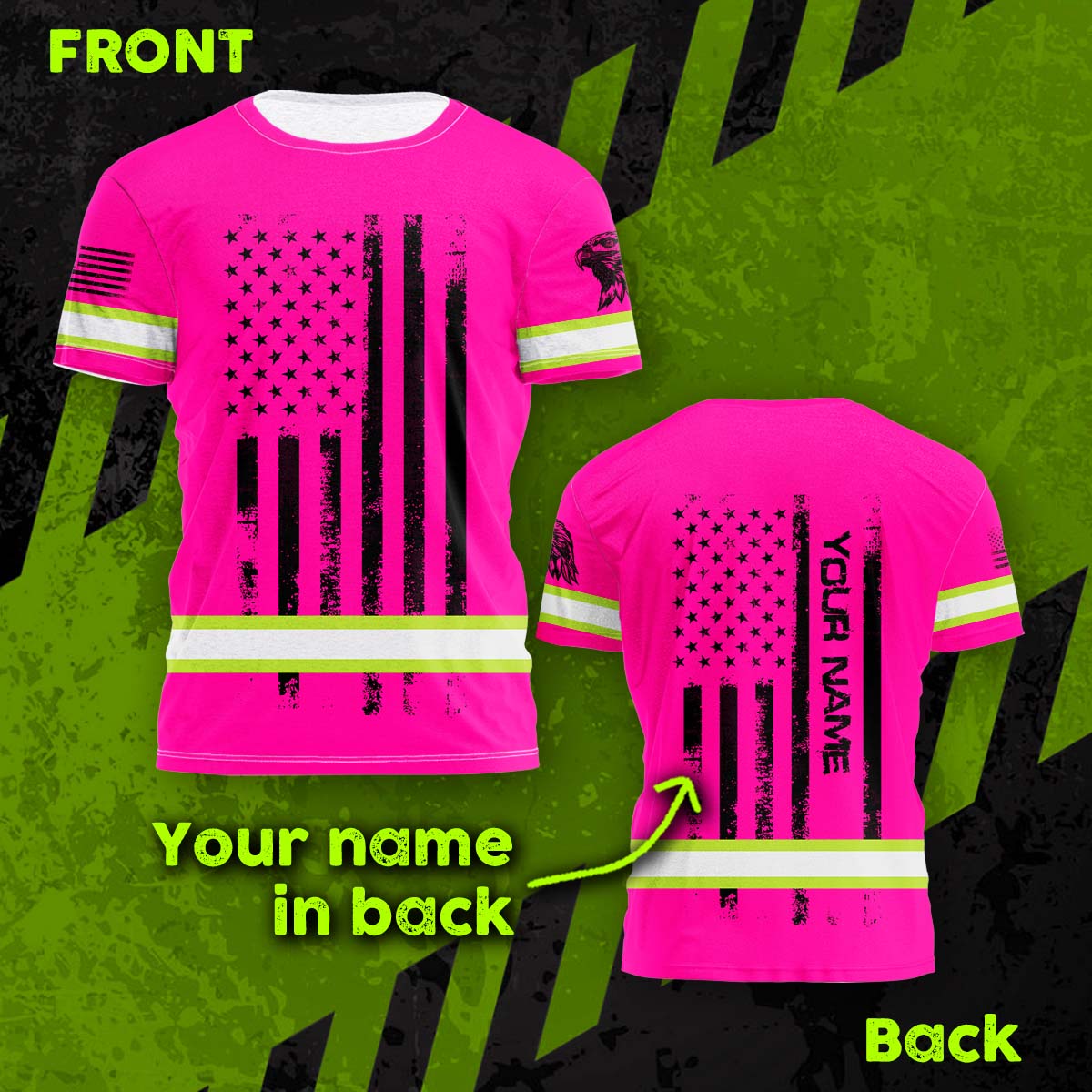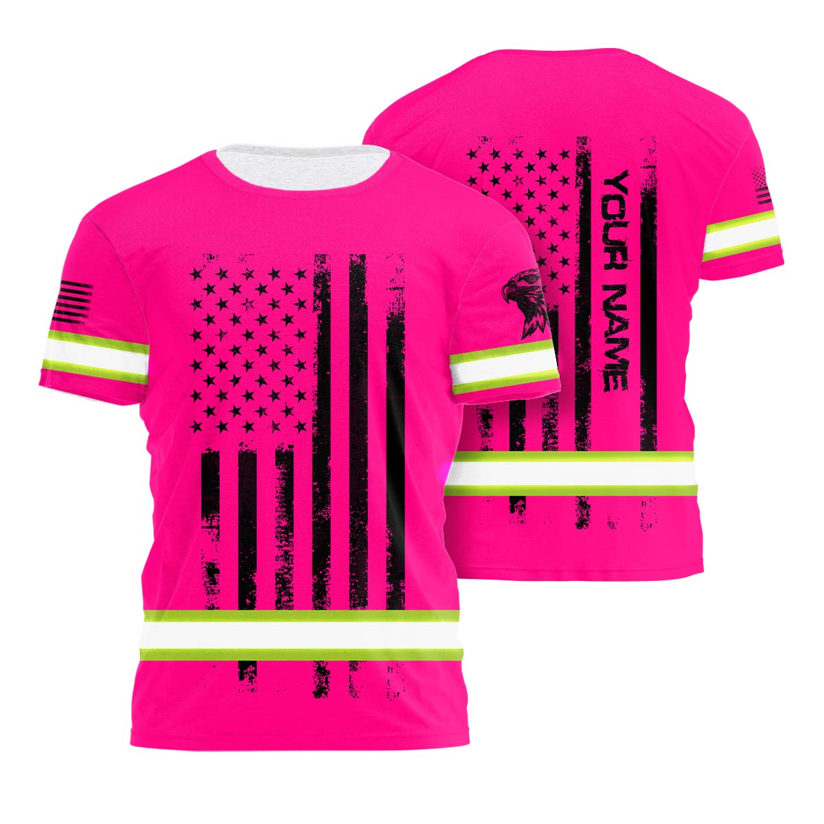 Hi Vis Shirt Reflective Tapes Pink Neon US Eagle Flag Custom Name Safety Workwear For Workers, Operator, Cyclists, Patriotic