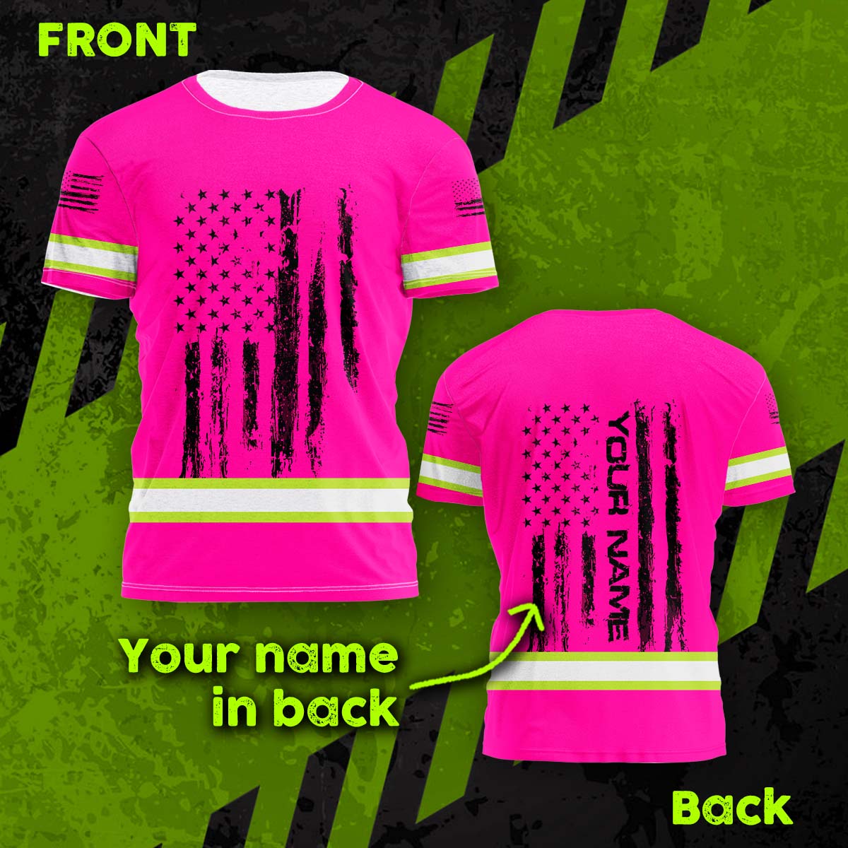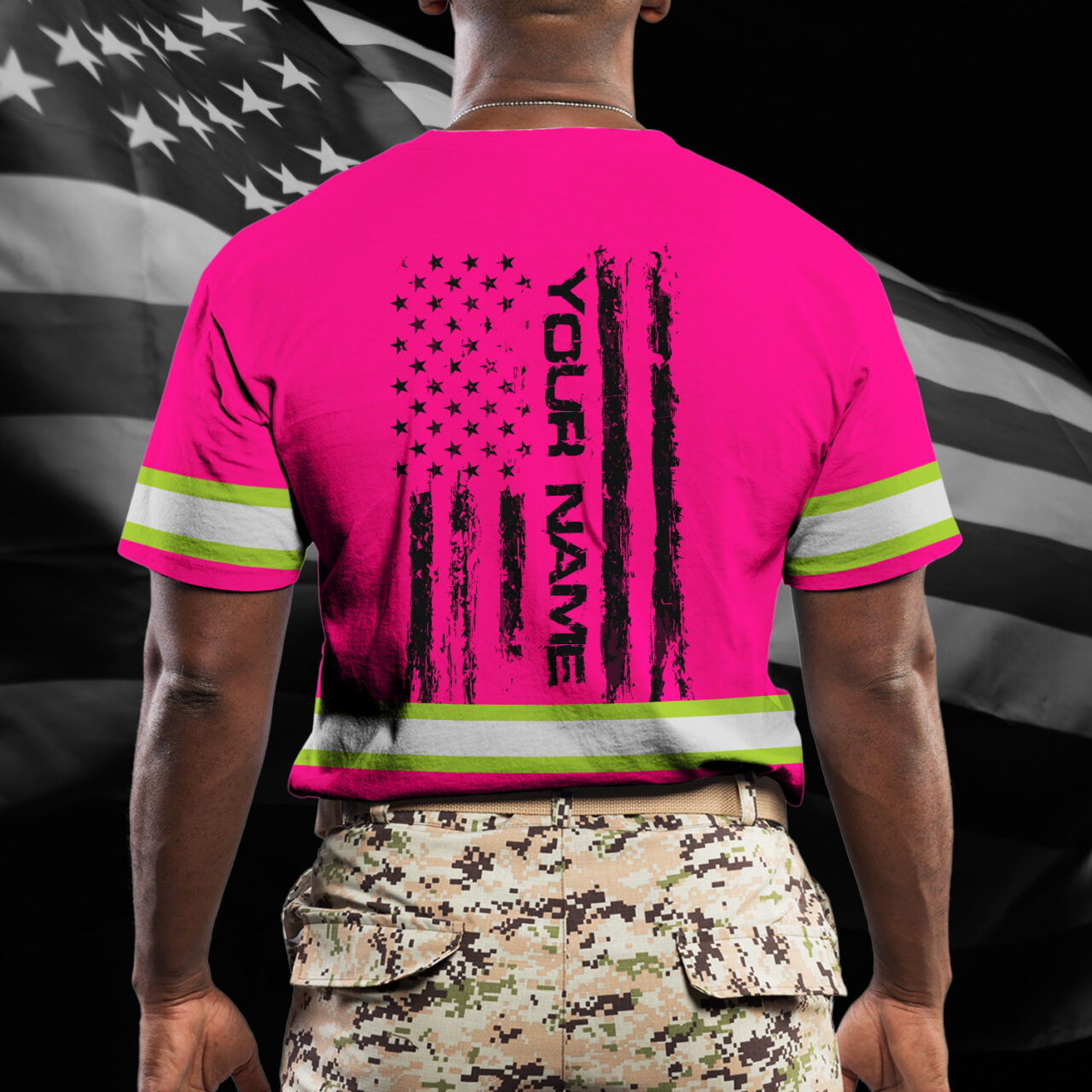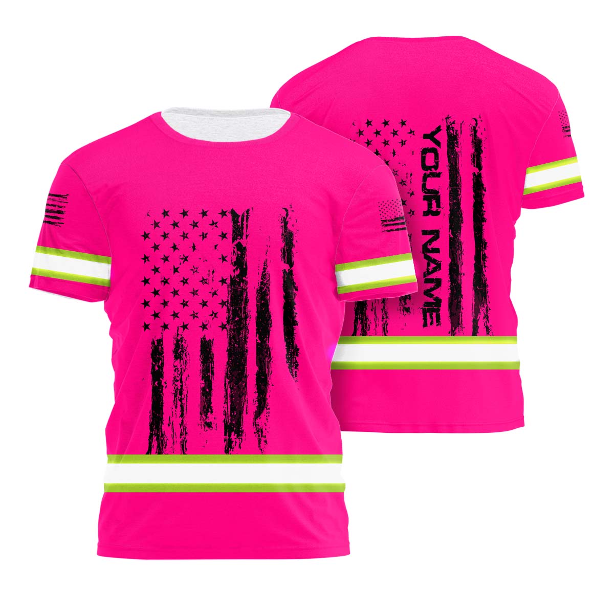 Hi Vis Shirt Reflective Tapes Pink Neon US Flag Custom Name Safety Workwear For Truckers, Workers, Operator, Cyclists, Patriotic