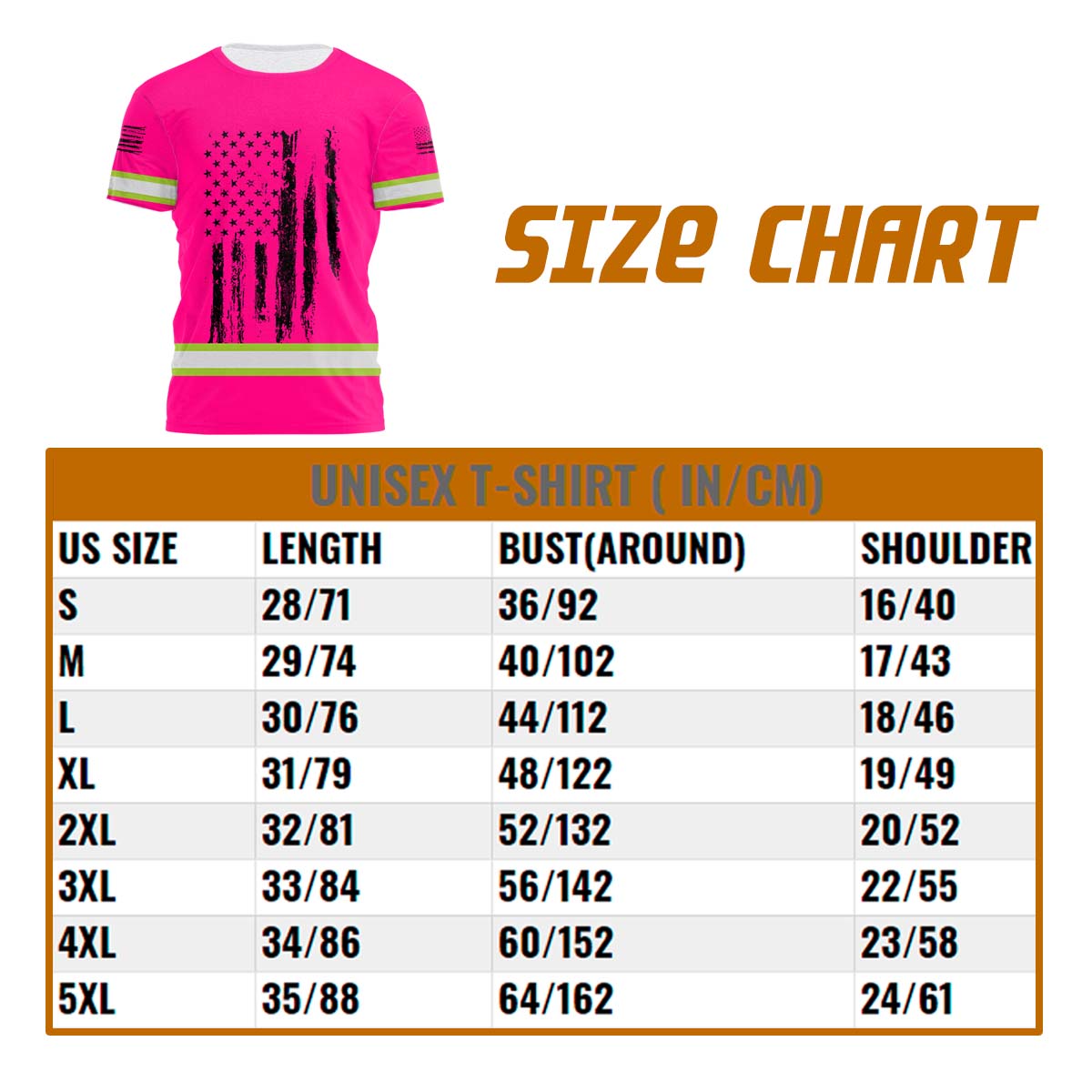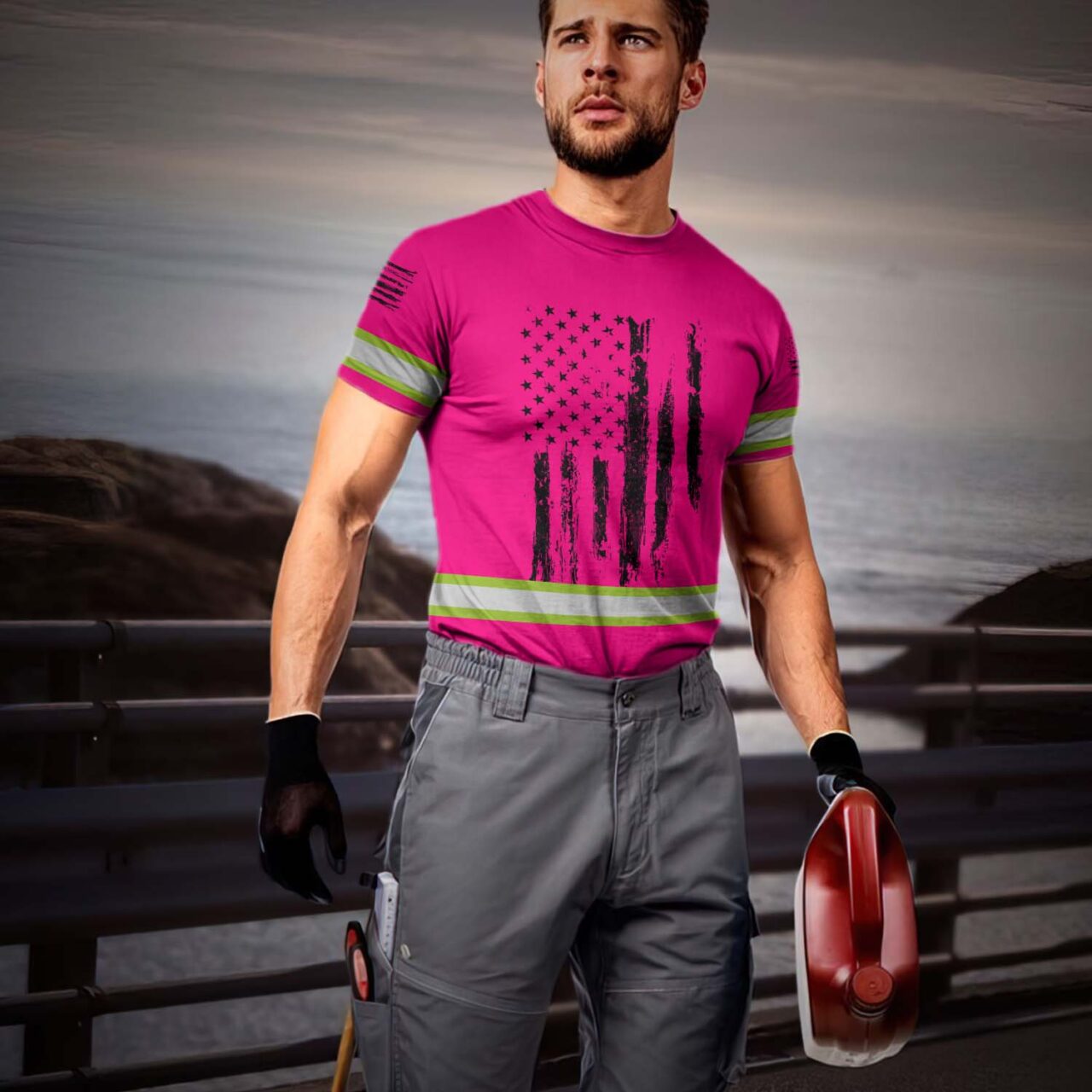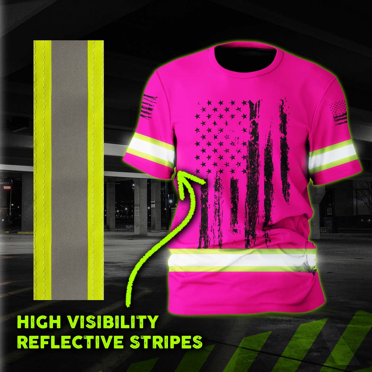 Hi Vis Shirt Reflective Tapes Pink Neon US Flag Custom Name Safety Workwear For Truckers, Workers, Operator, Cyclists, Patriotic