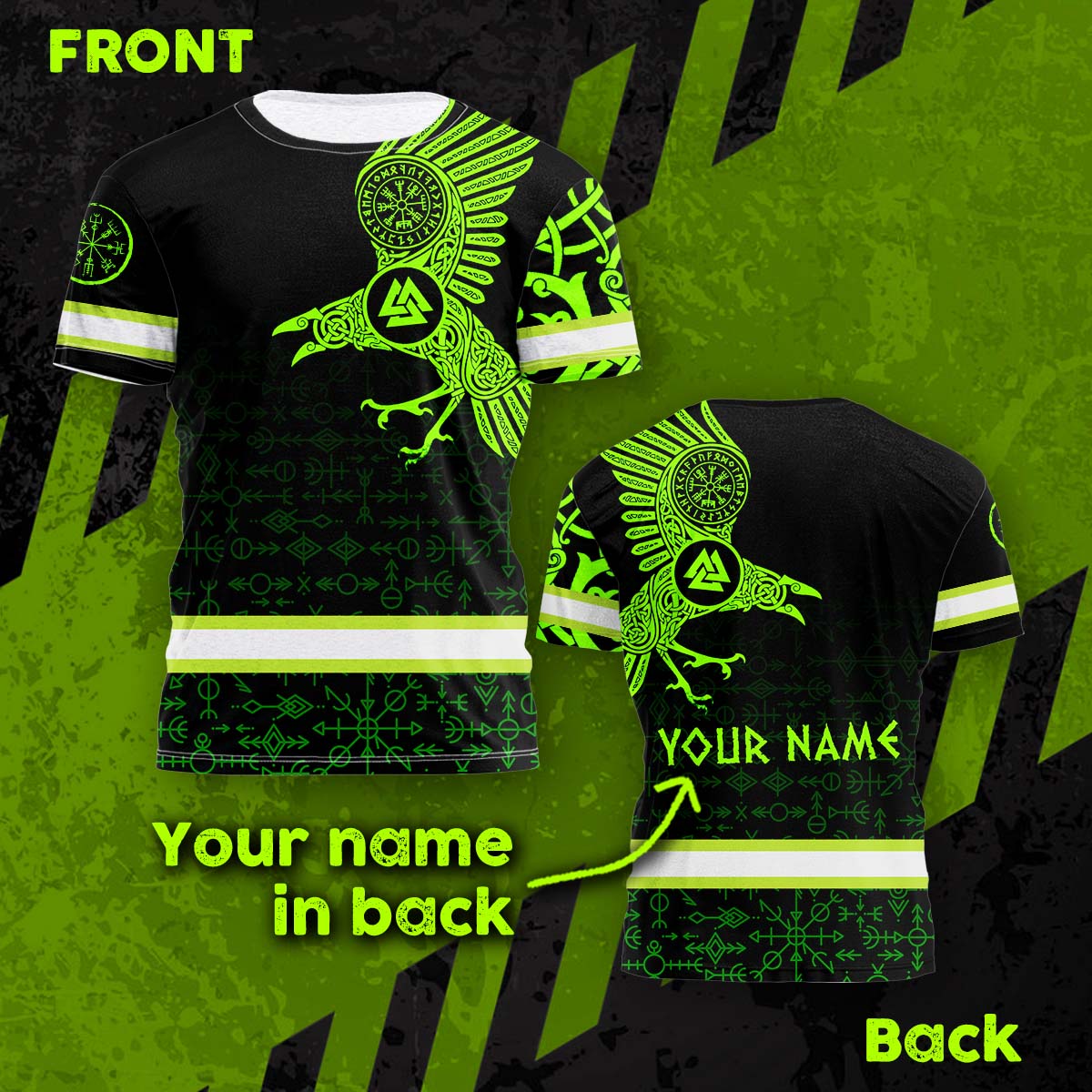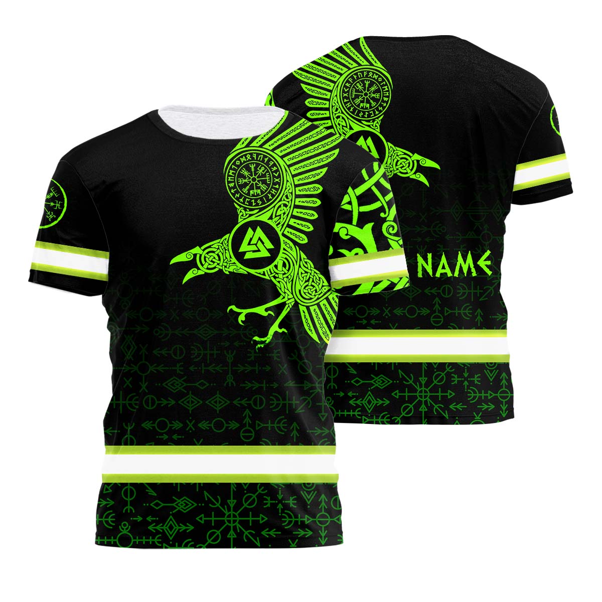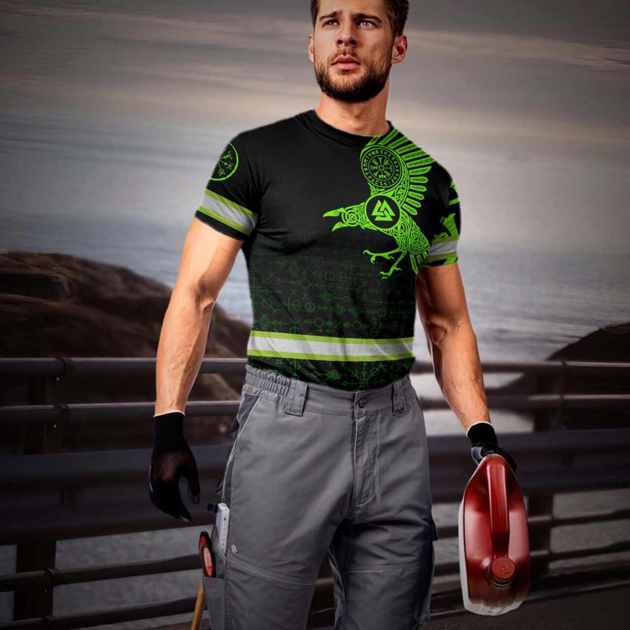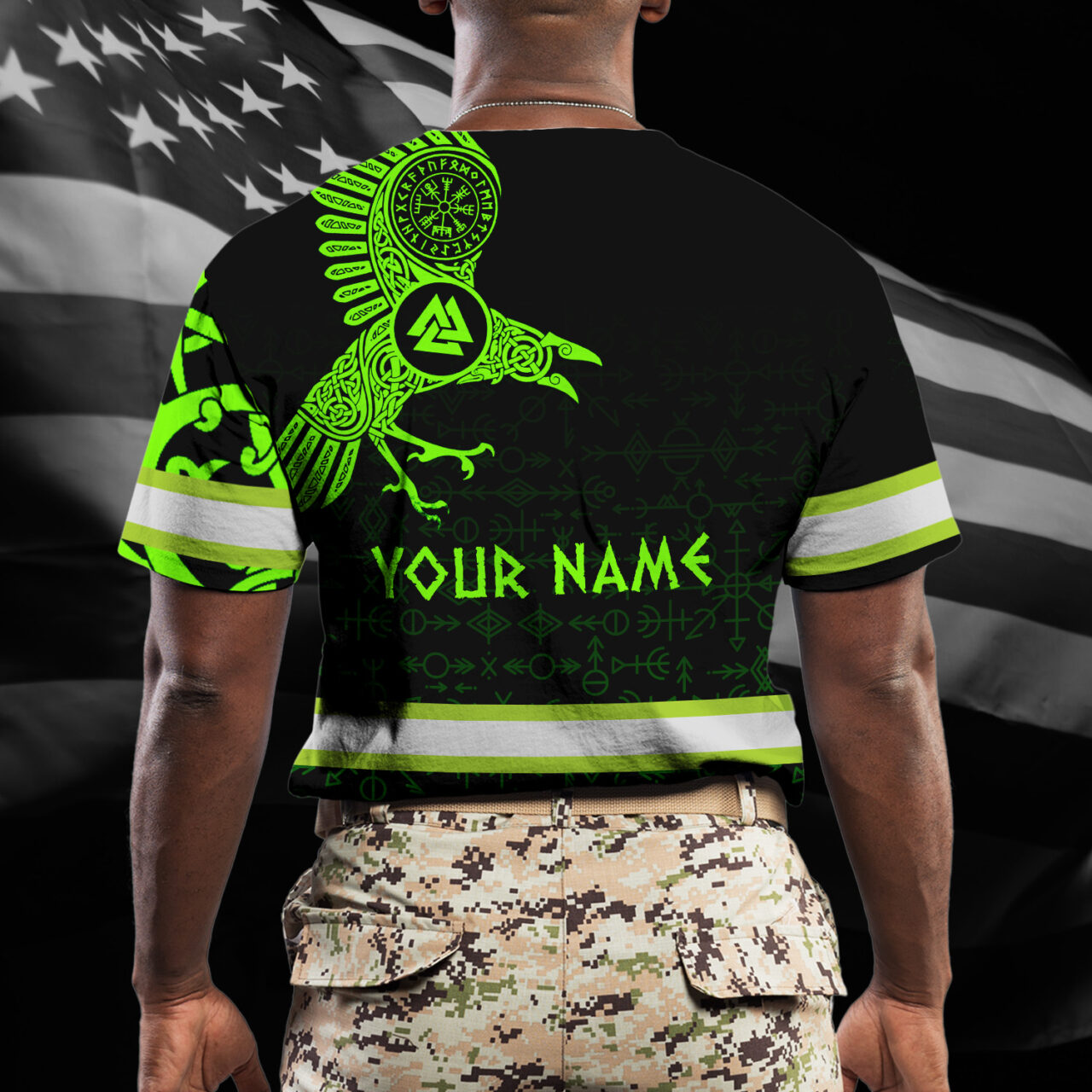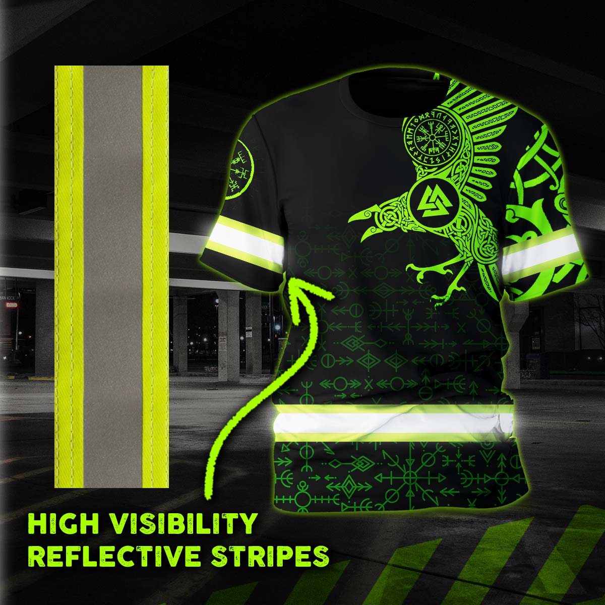 Hi Vis Shirt Reflective Tapes Raven Viking Symbol Green Neon Custom Name Safety Workwear For Workers, Runners, Cyclists