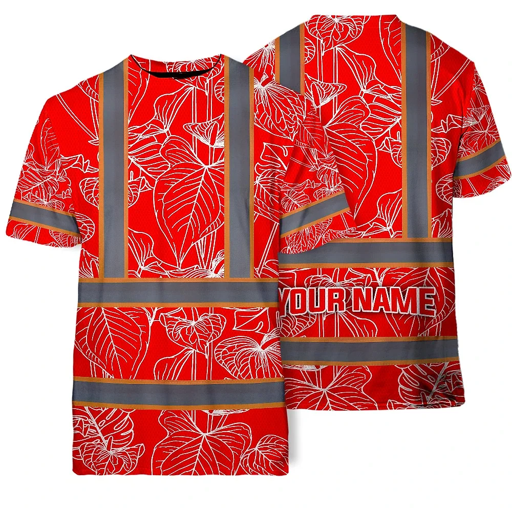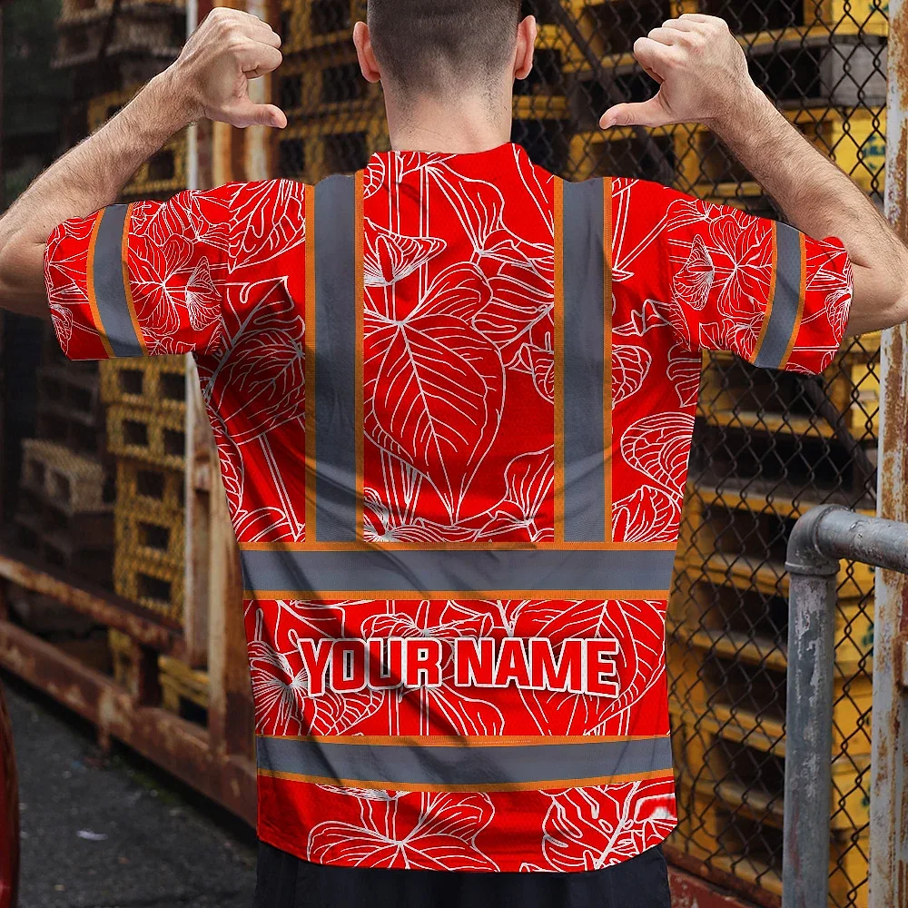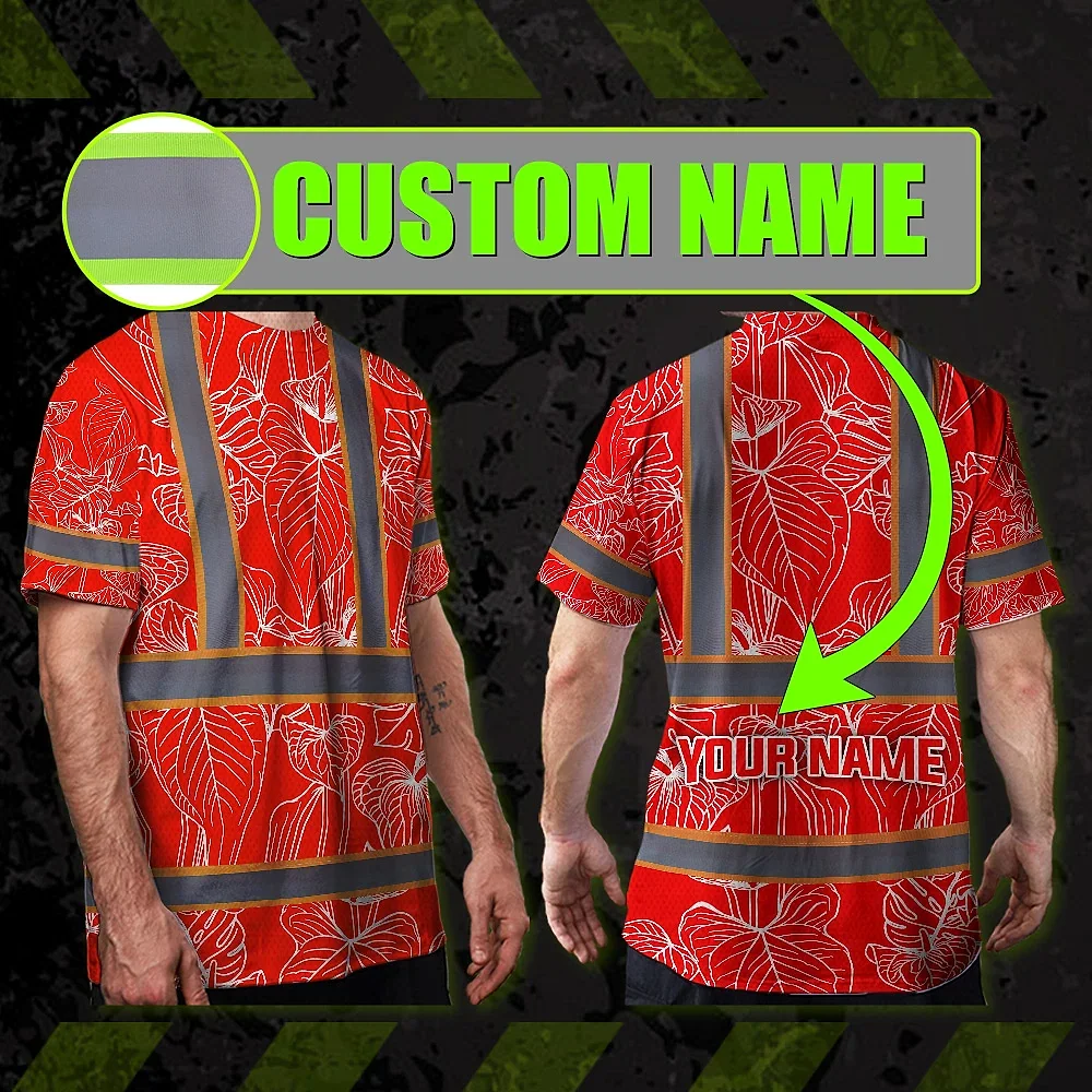 Hi Vis Shirt Reflective Tapes Red Neon Flowers Custom Name Safety Workwear For Workers, Truckers, Operators