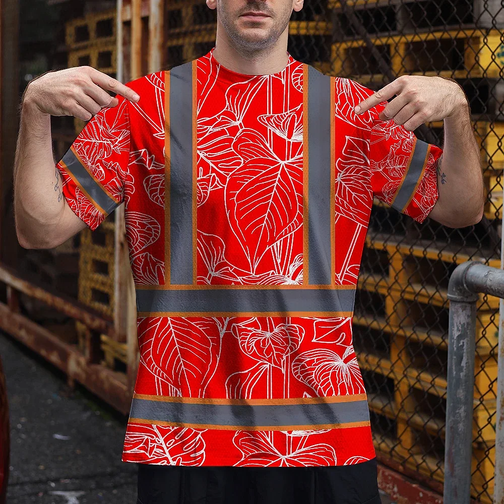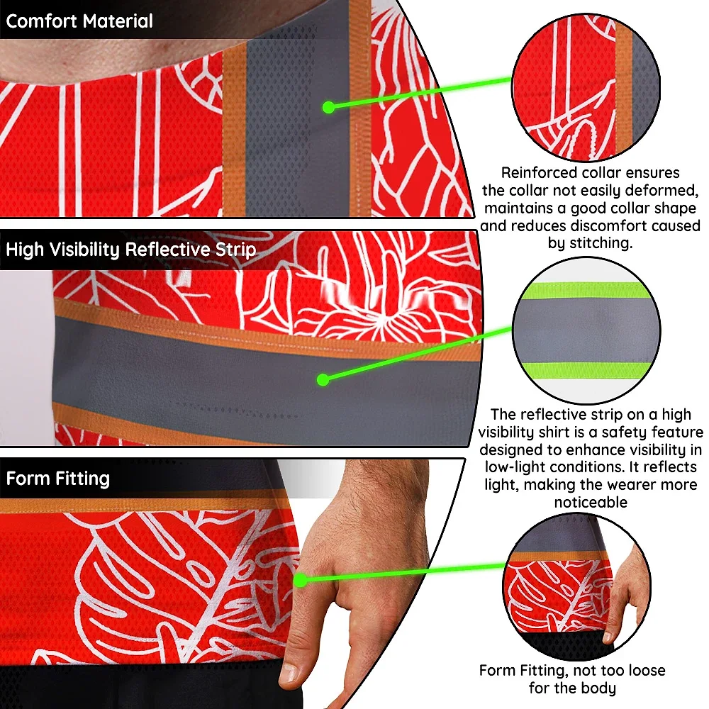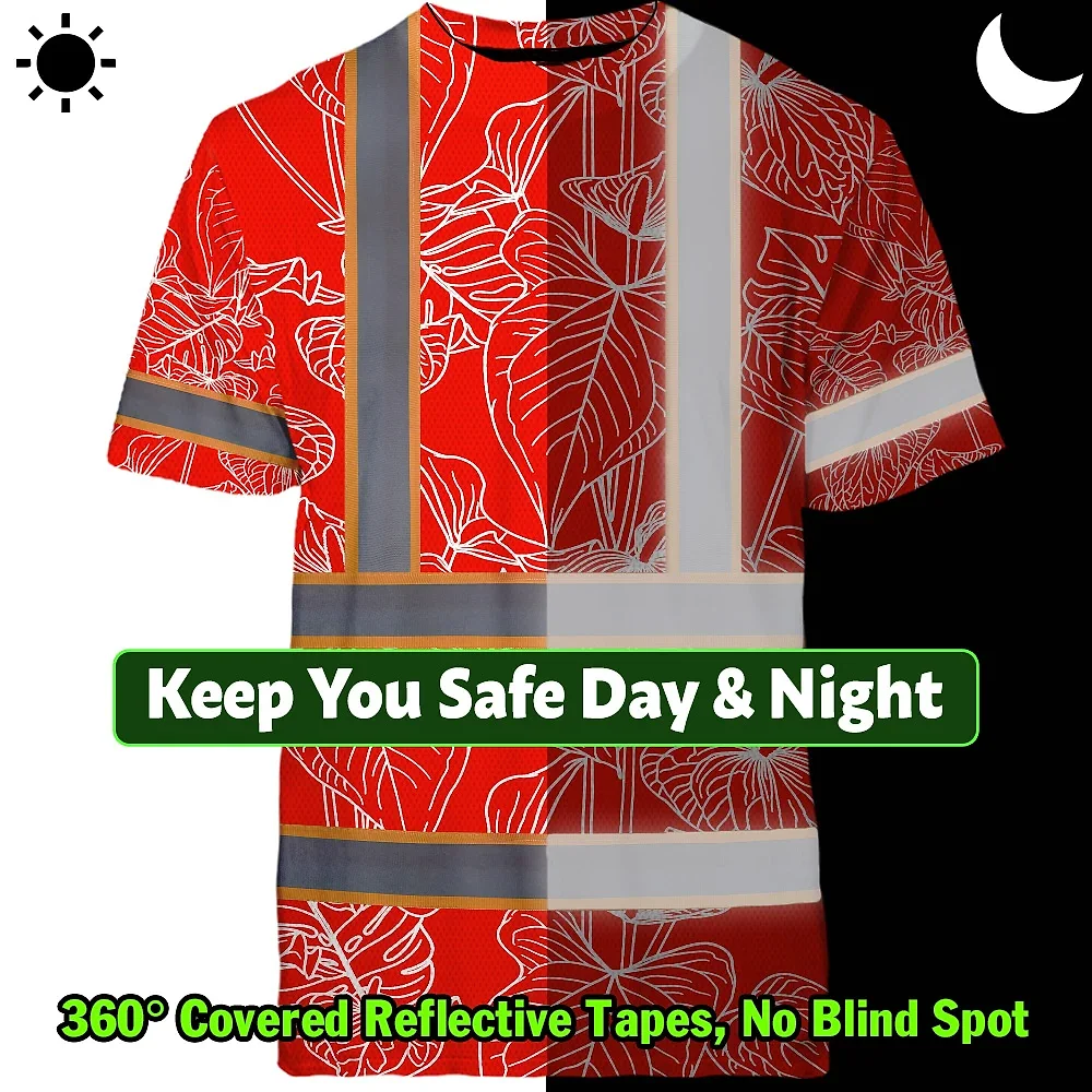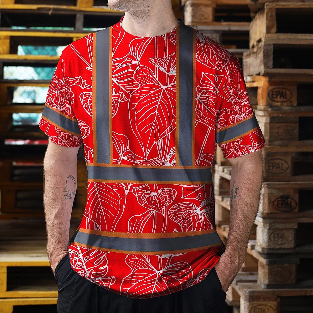 Hi Vis Shirt Reflective Tapes Red Neon Flowers Custom Name Safety Workwear For Workers, Truckers, Operators