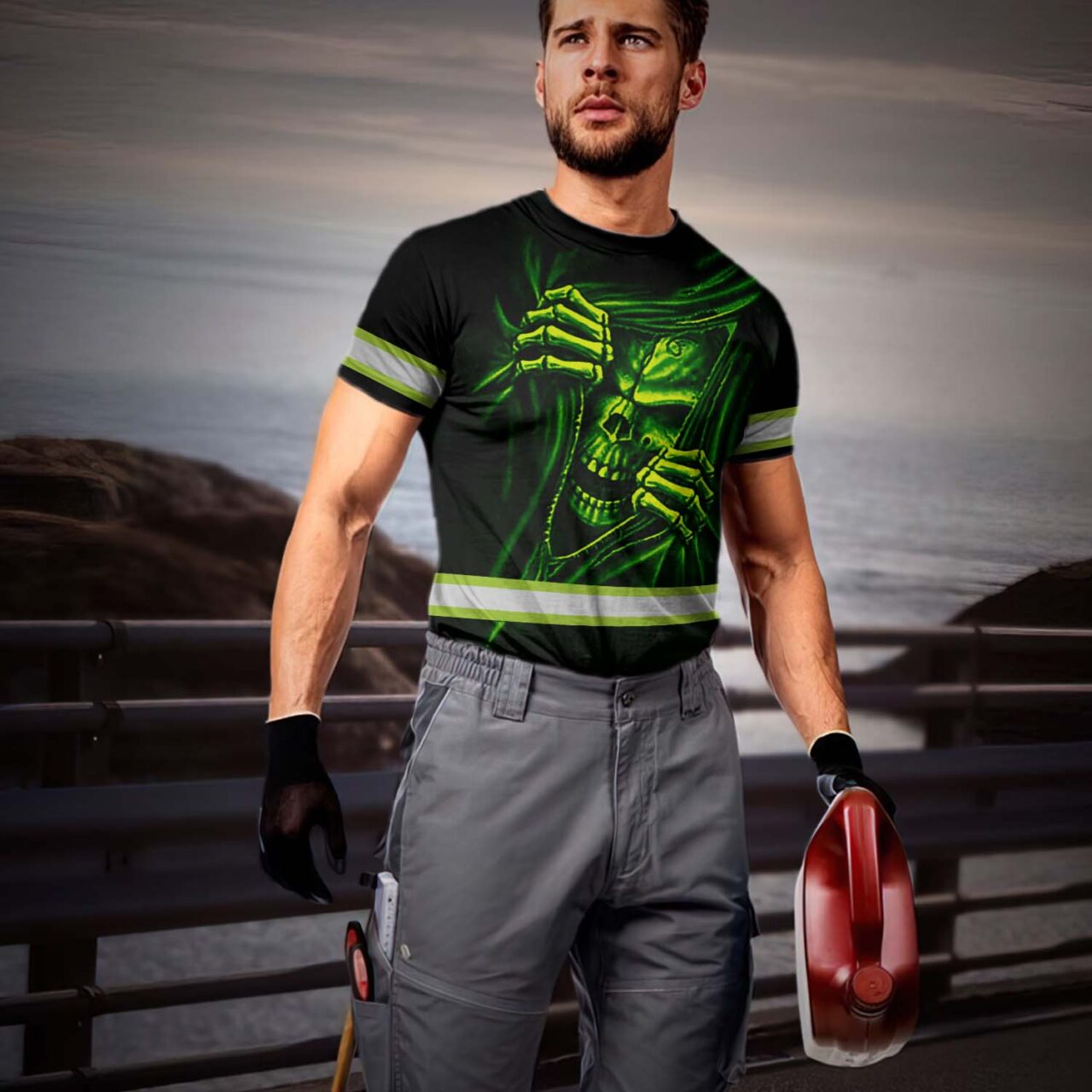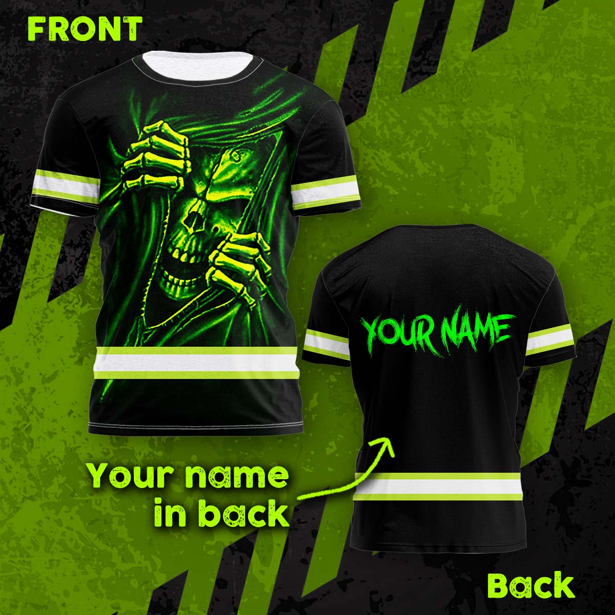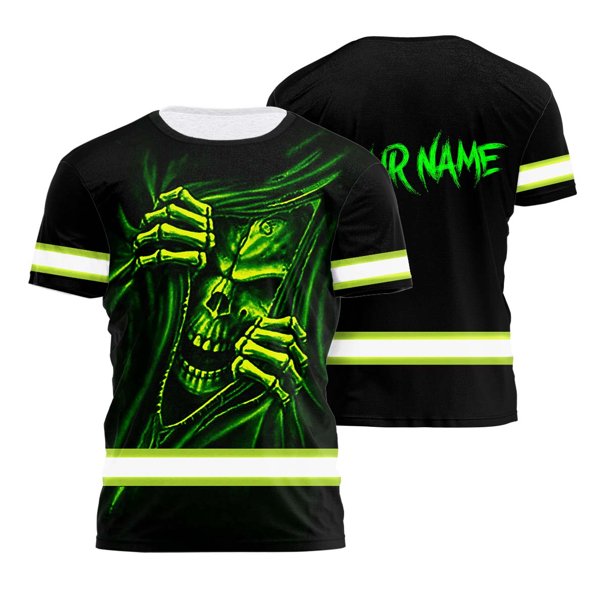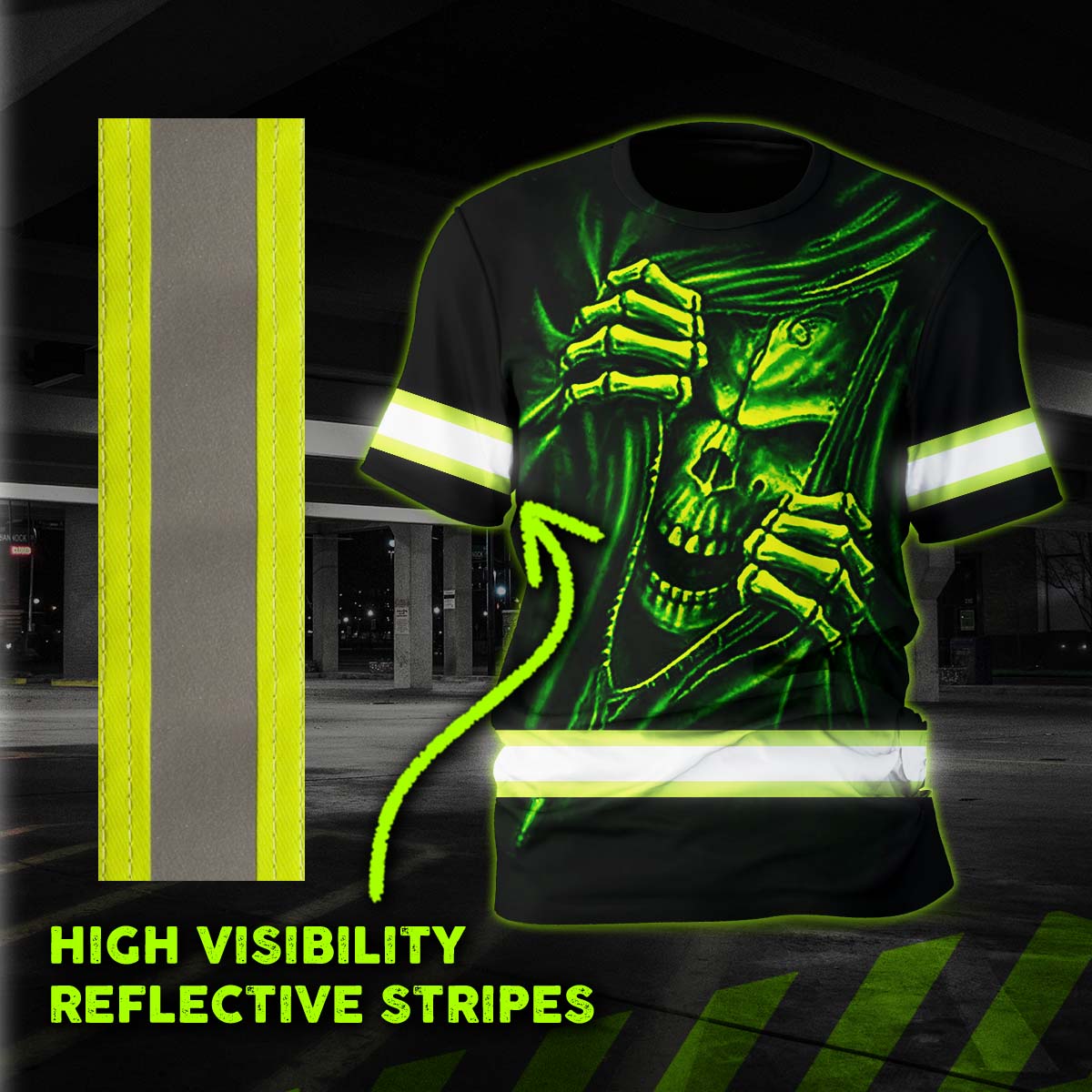 Hi Vis Shirt Reflective Tapes Skull Custom Name Safety Workwear For Patriotic, Skull Lovers, Truckers, Workers, Operator, Cyclists