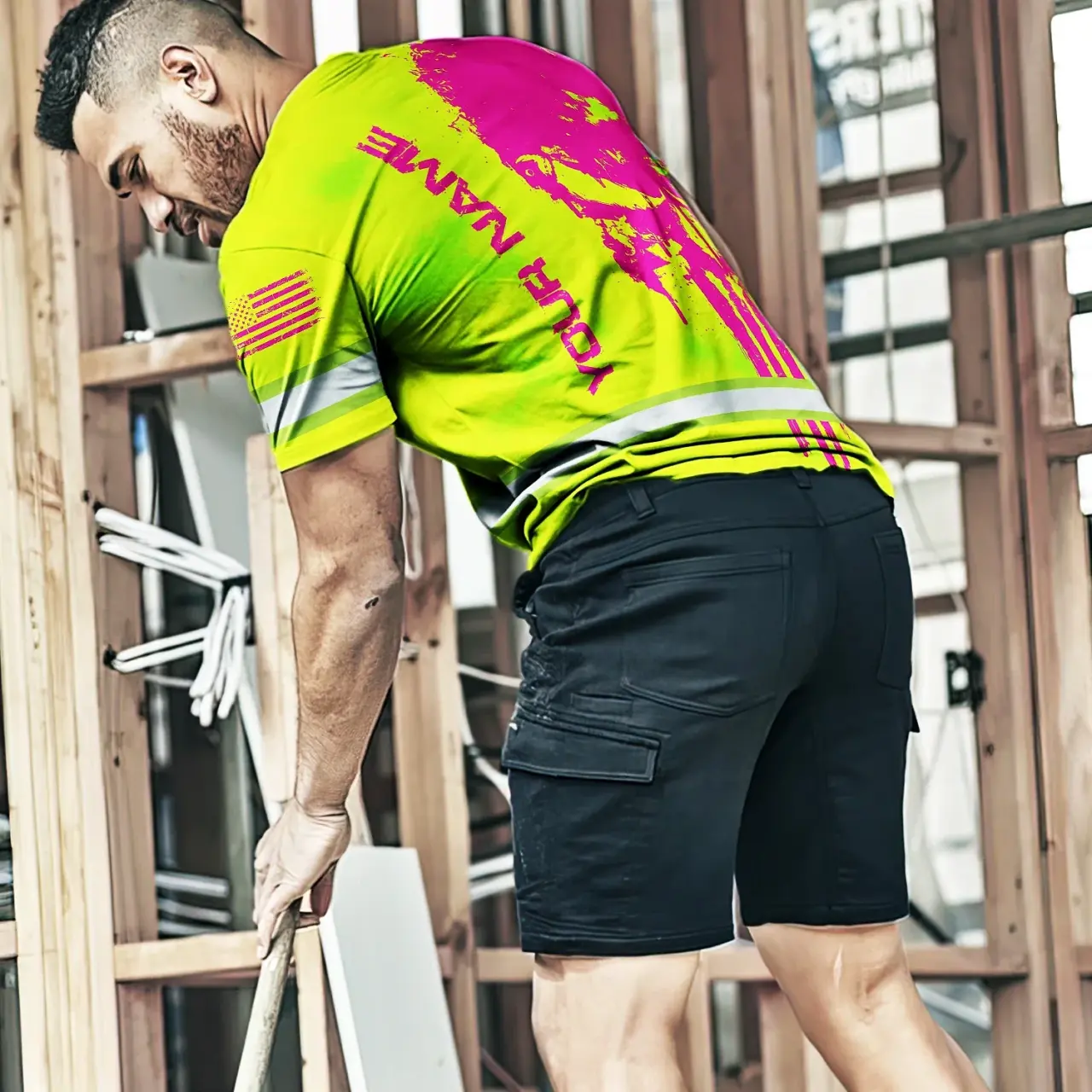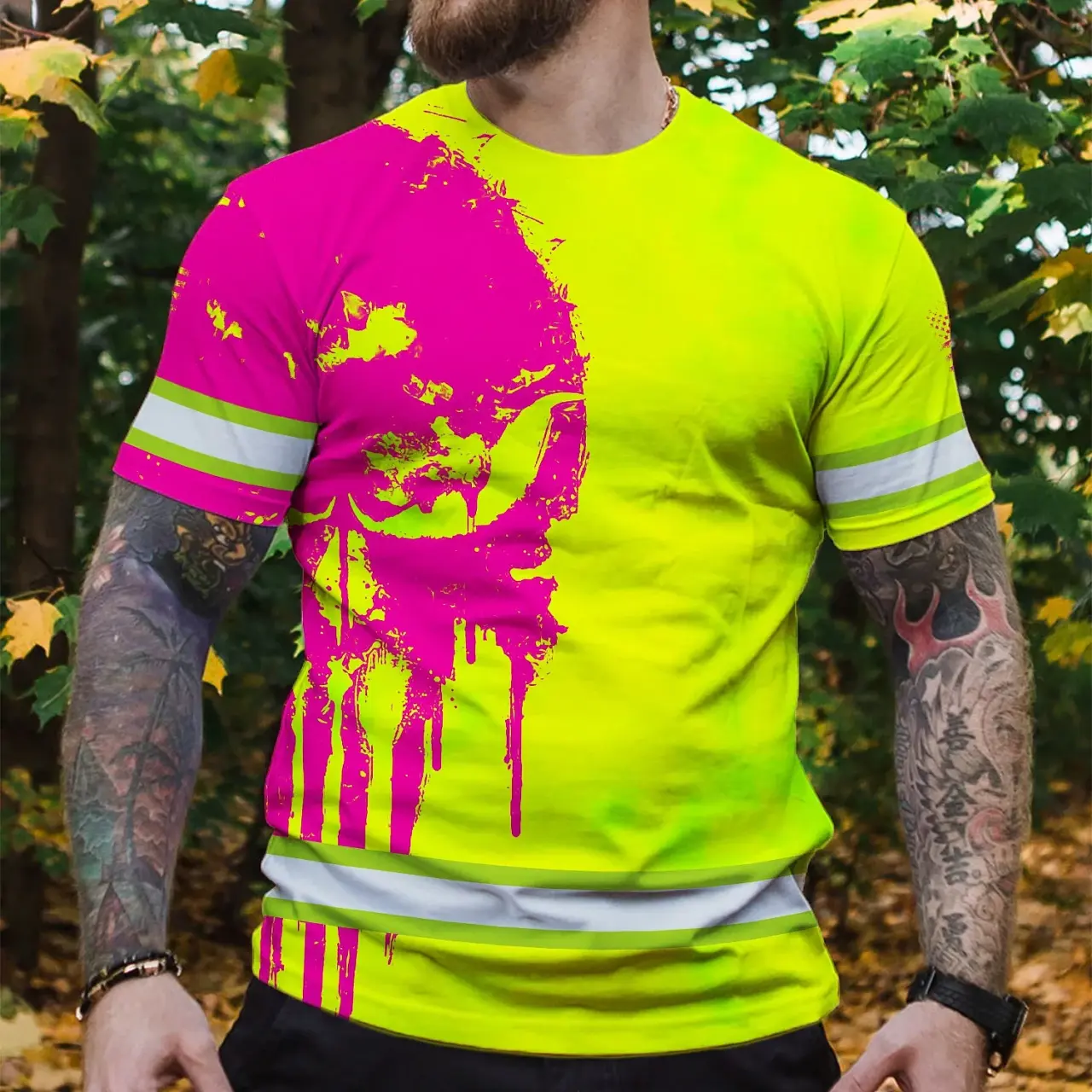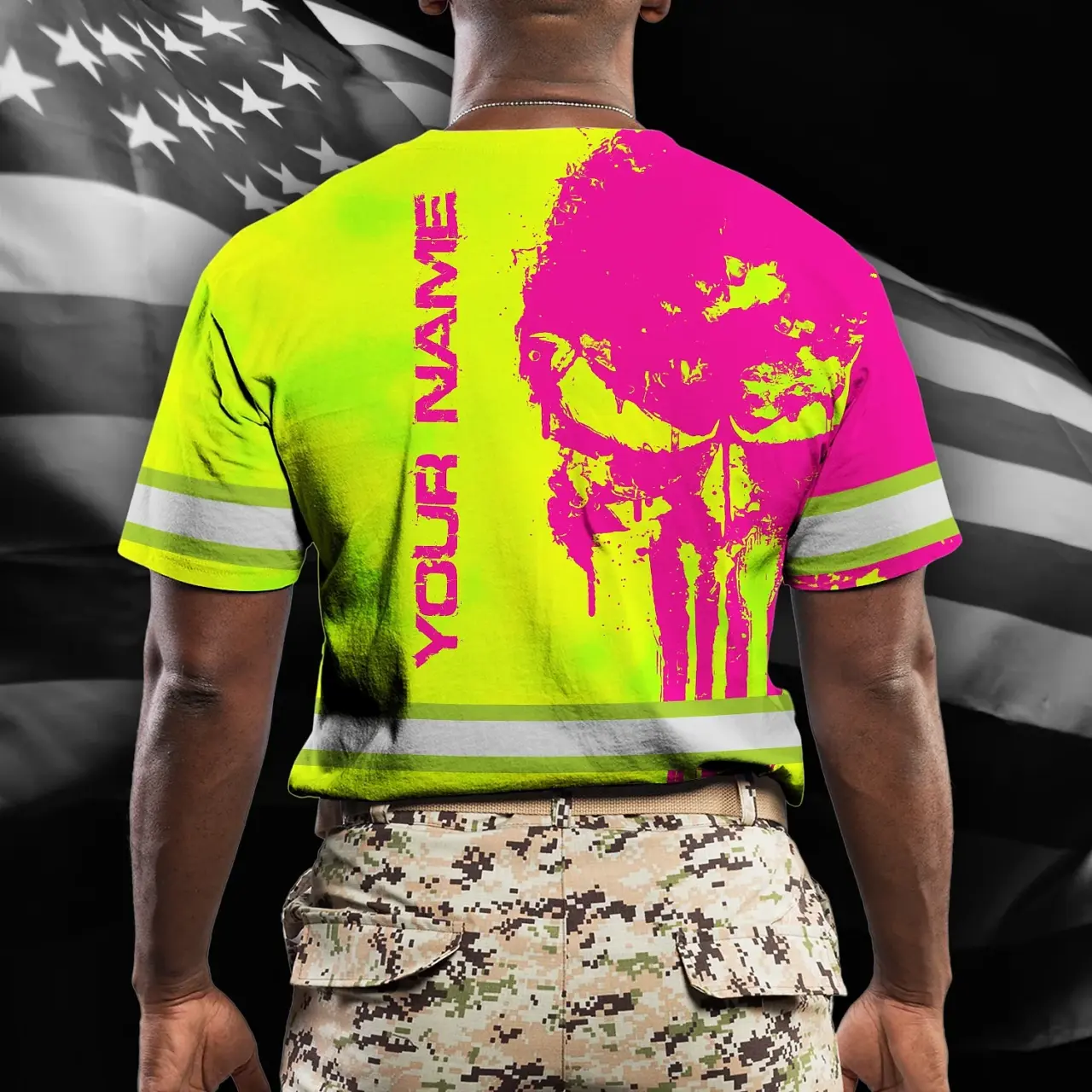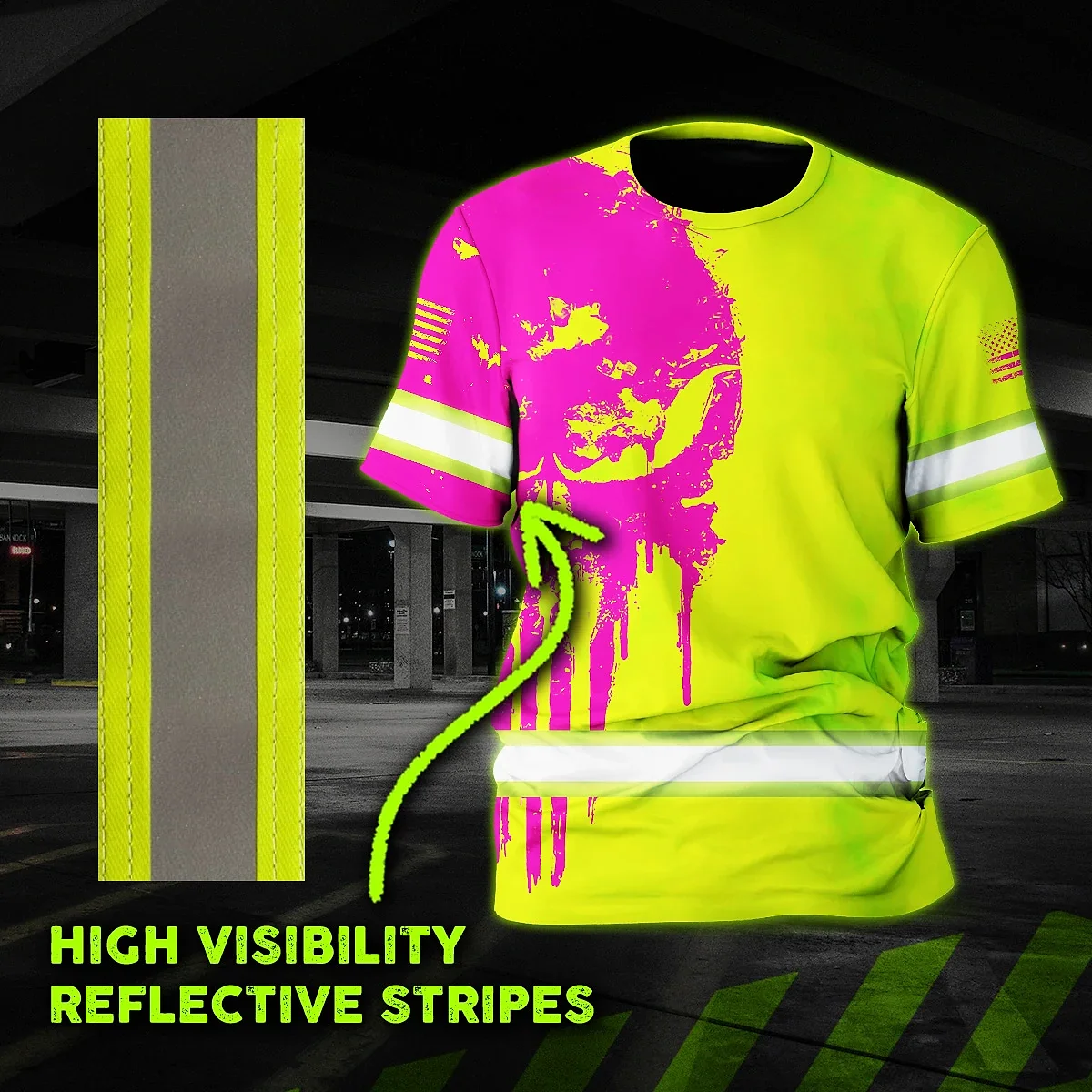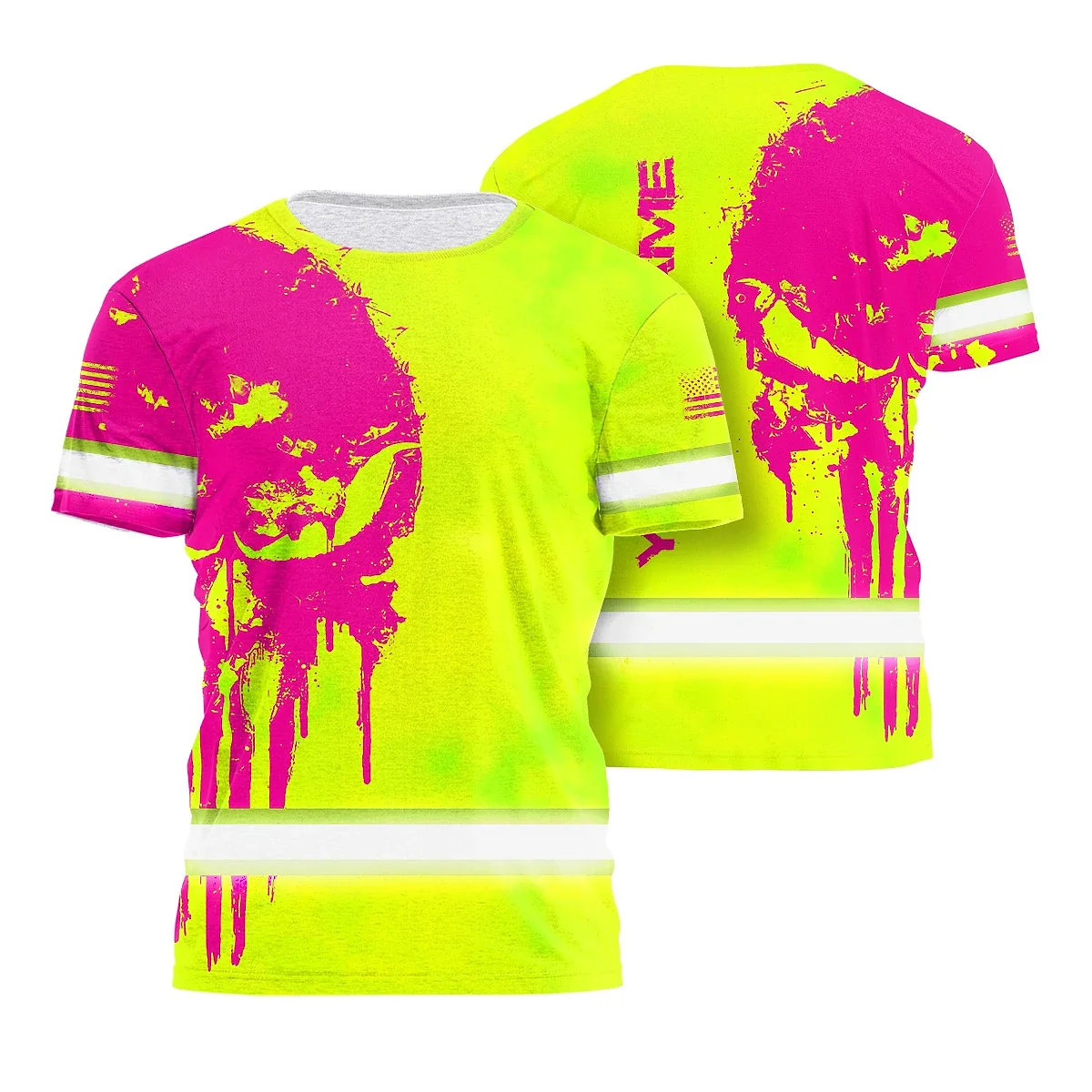 Hi Vis Shirt Reflective Tapes Skull Lime Yellow And Pink Neon Custom Name Safety Workwear For Workers, Truckers, Operators