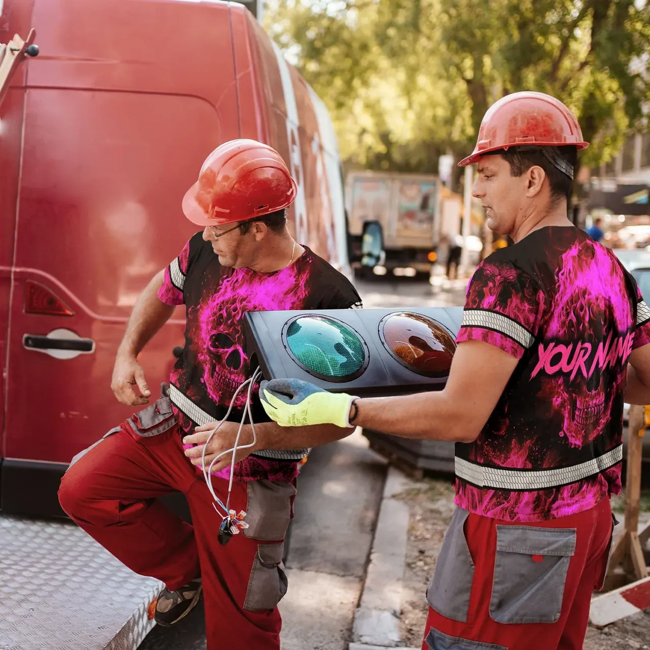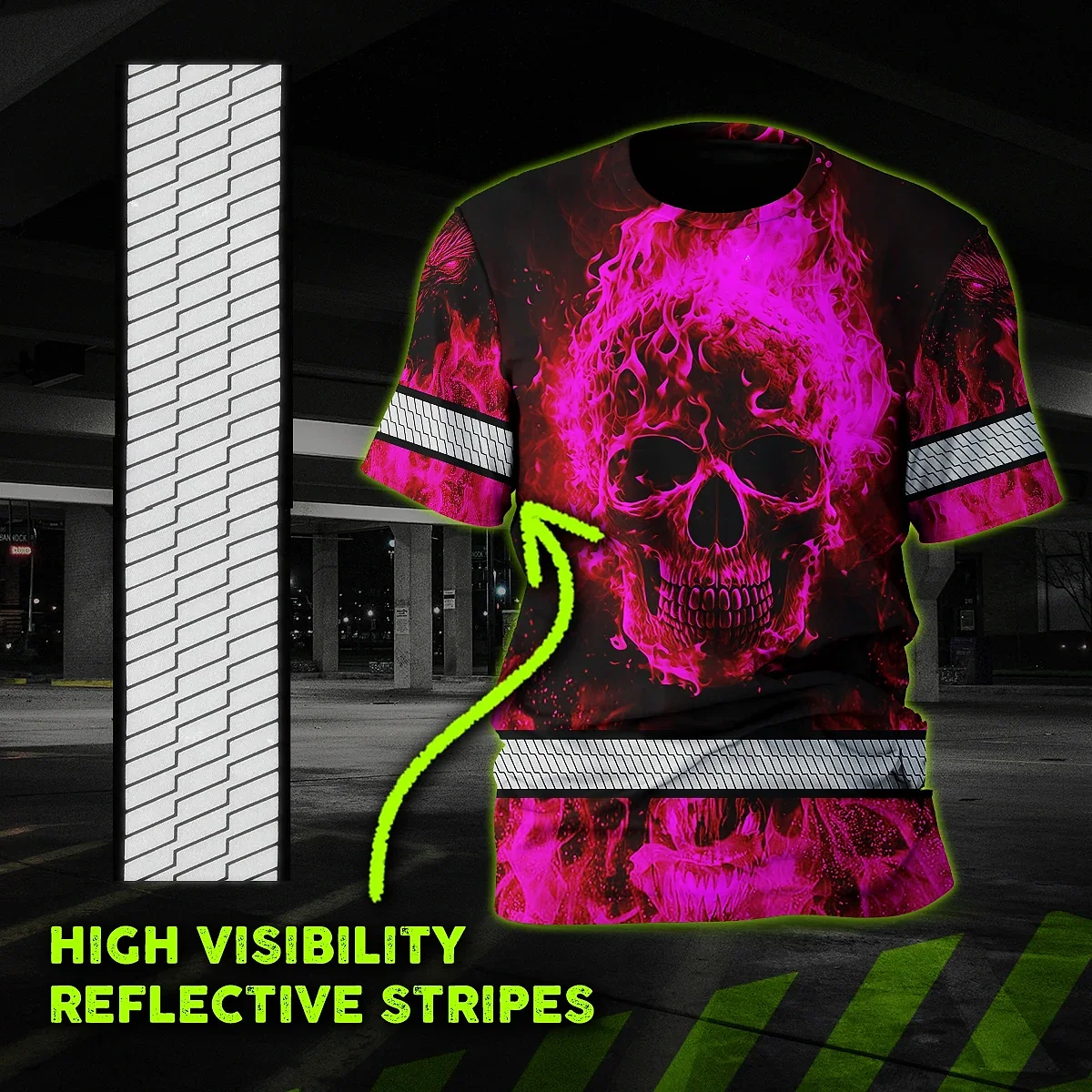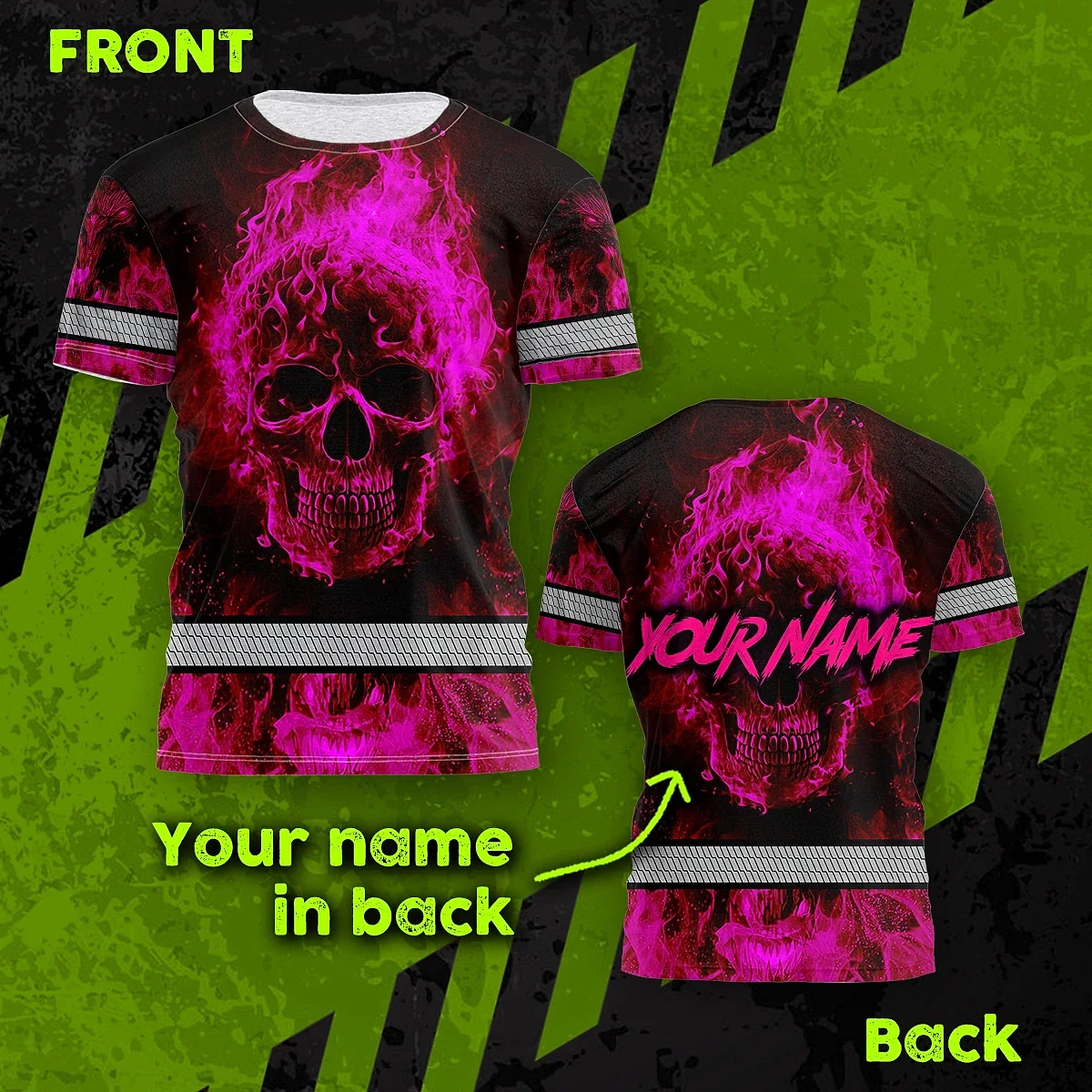 Hi Vis Shirt Reflective Tapes Skull Pink Violet Fire Custom Name Safety Workwear For Workers, Truckers, Operators