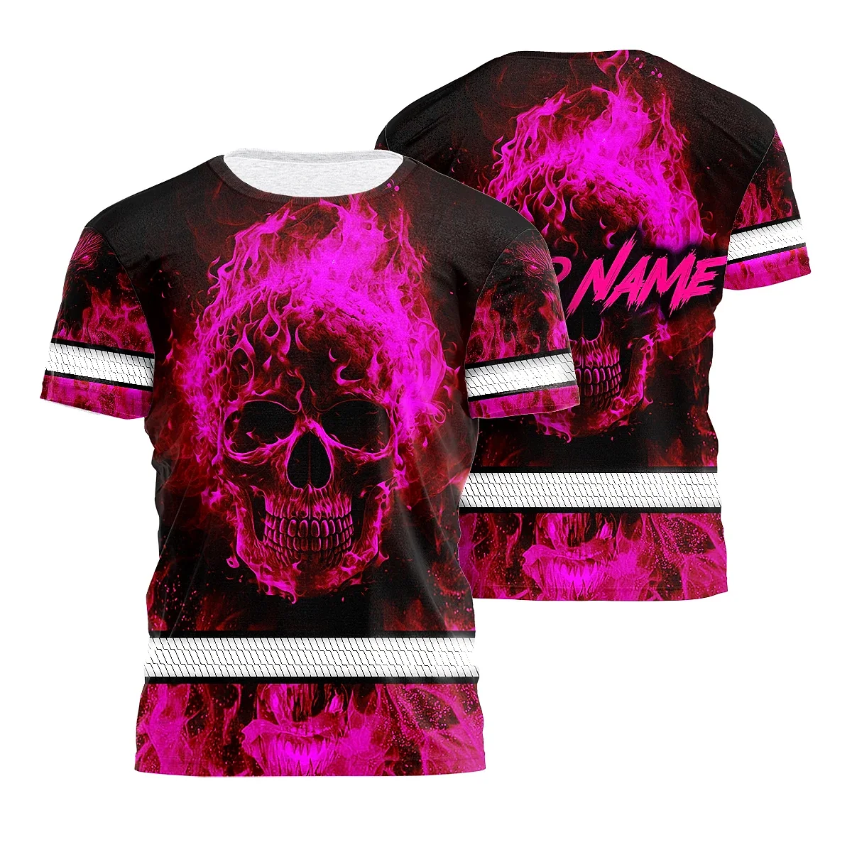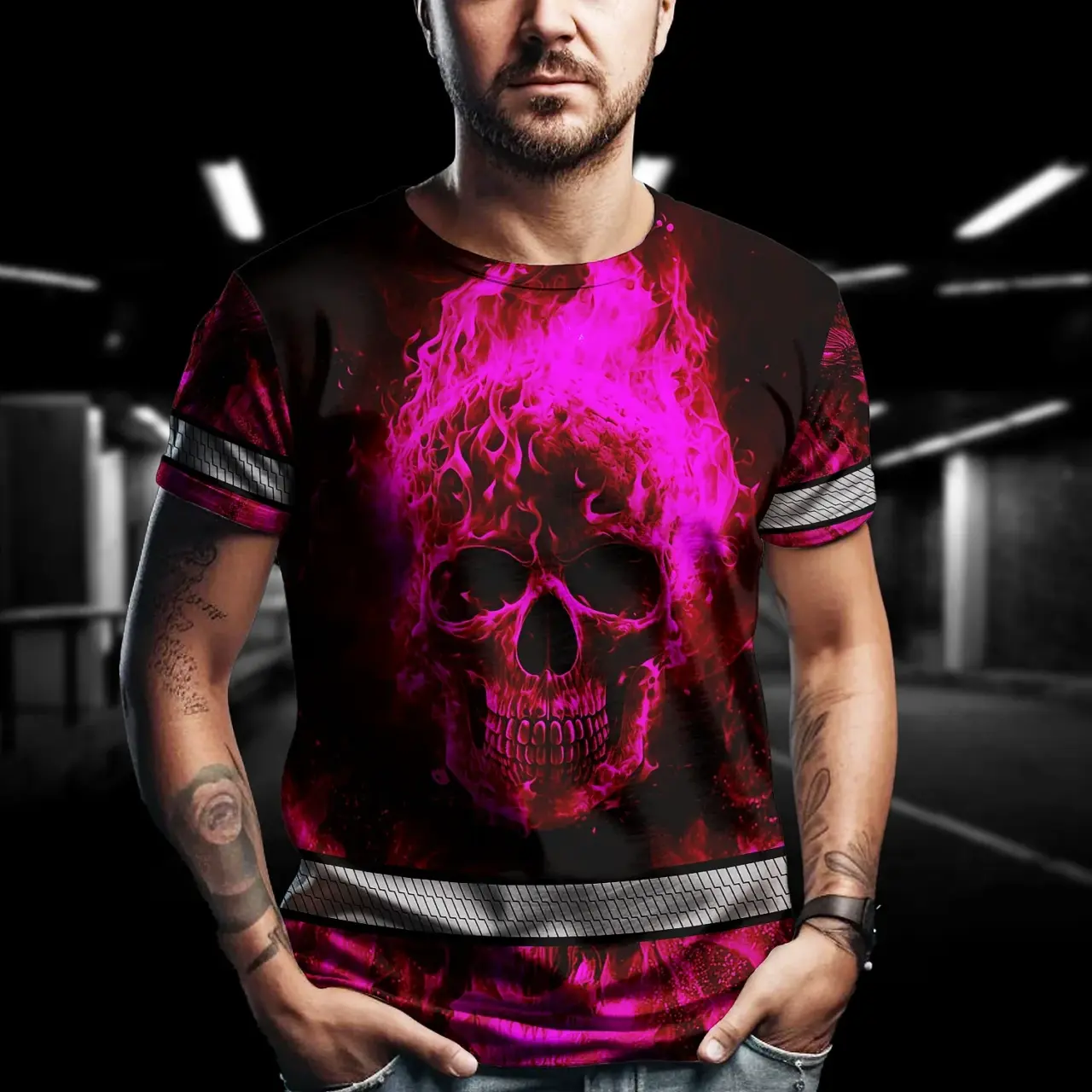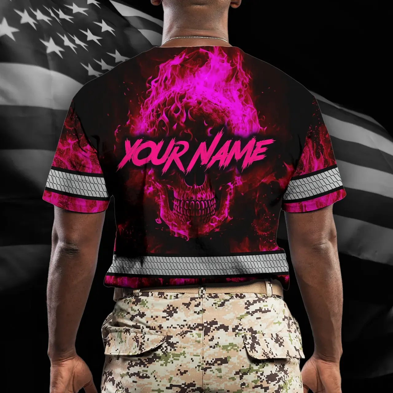 Hi Vis Shirt Reflective Tapes Skull Pink Violet Fire Custom Name Safety Workwear For Workers, Truckers, Operators