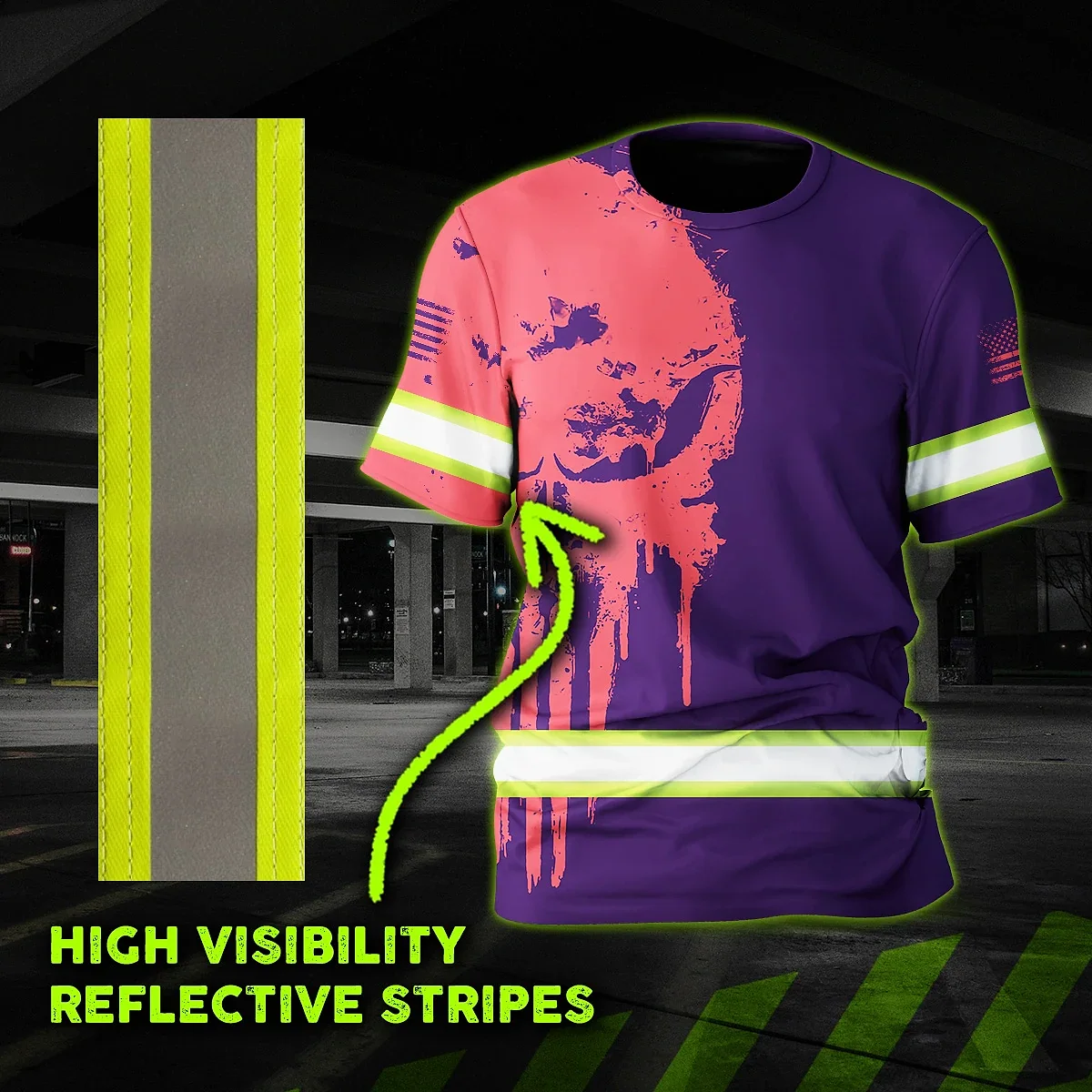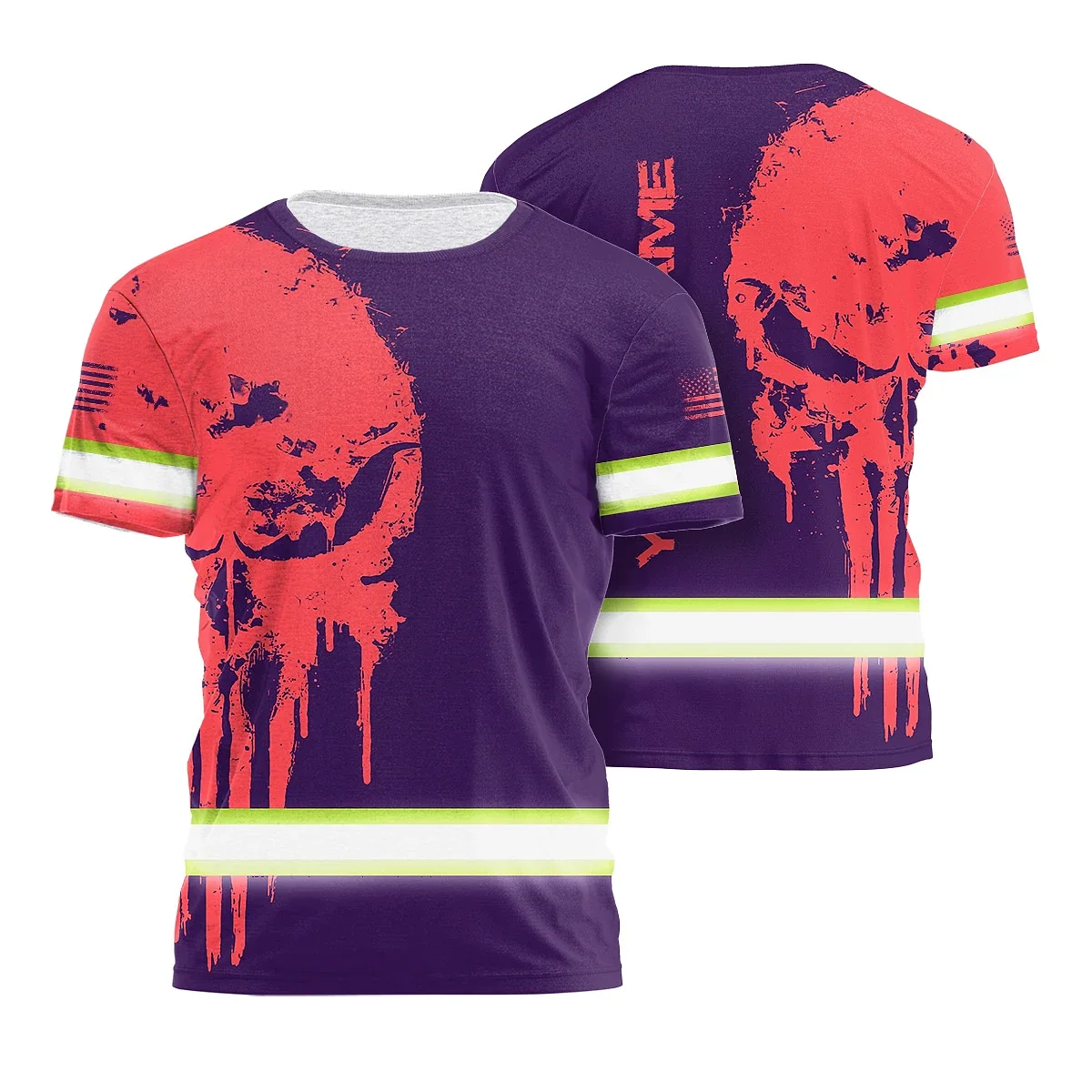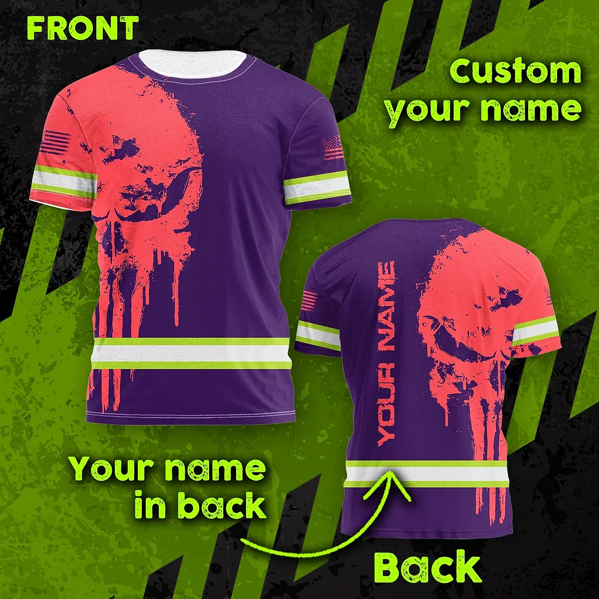 Hi Vis Shirt Reflective Tapes Skull Violet Neon And Pink Custom Name Safety Workwear For Workers, Truckers, Operators