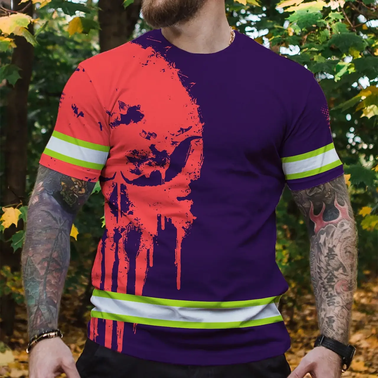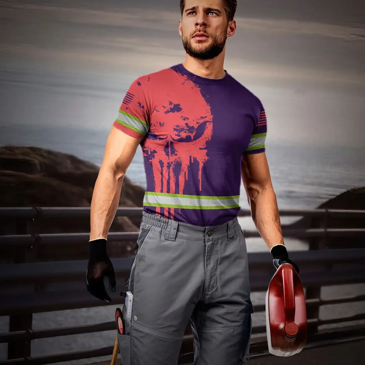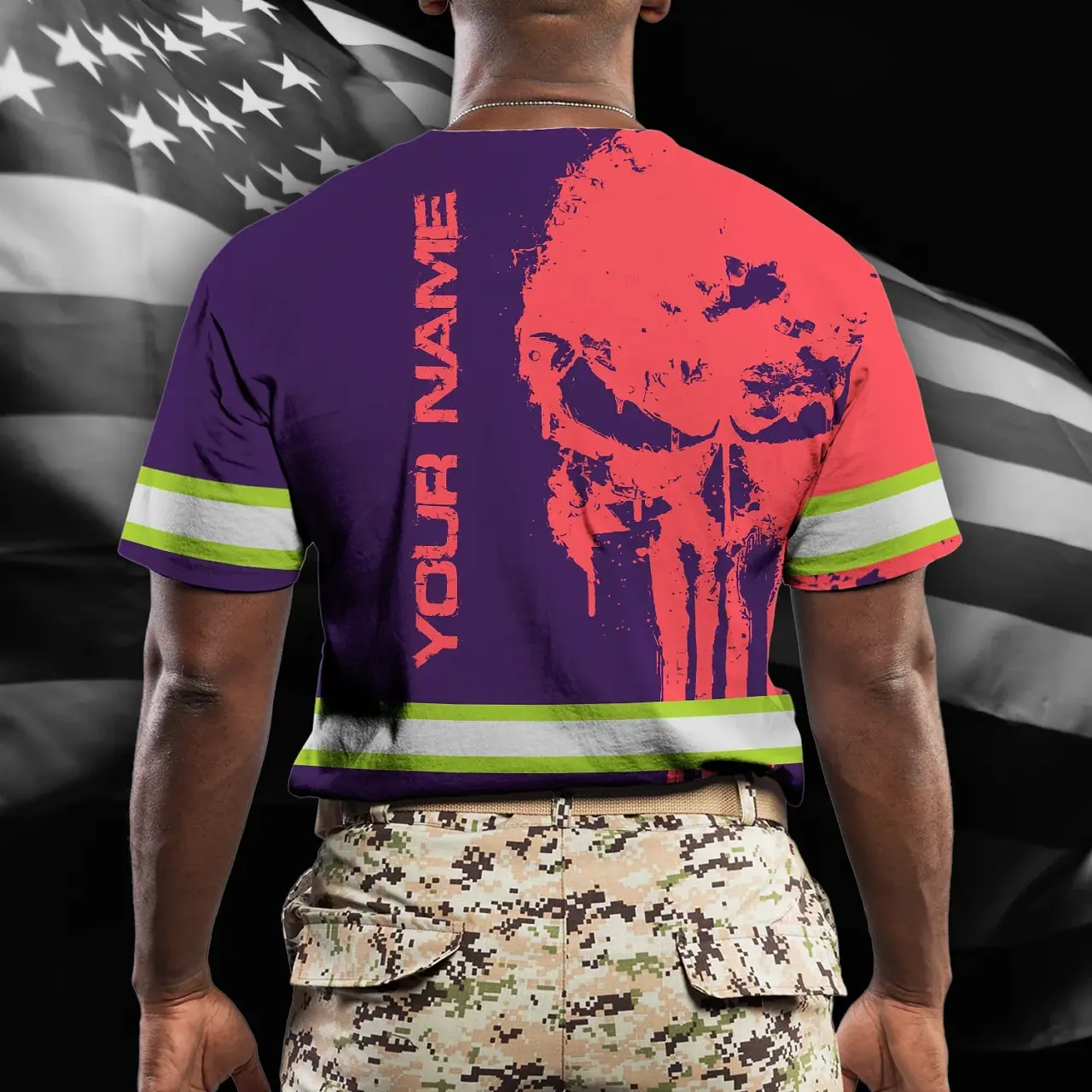 Hi Vis Shirt Reflective Tapes Skull Violet Neon And Pink Custom Name Safety Workwear For Workers, Truckers, Operators