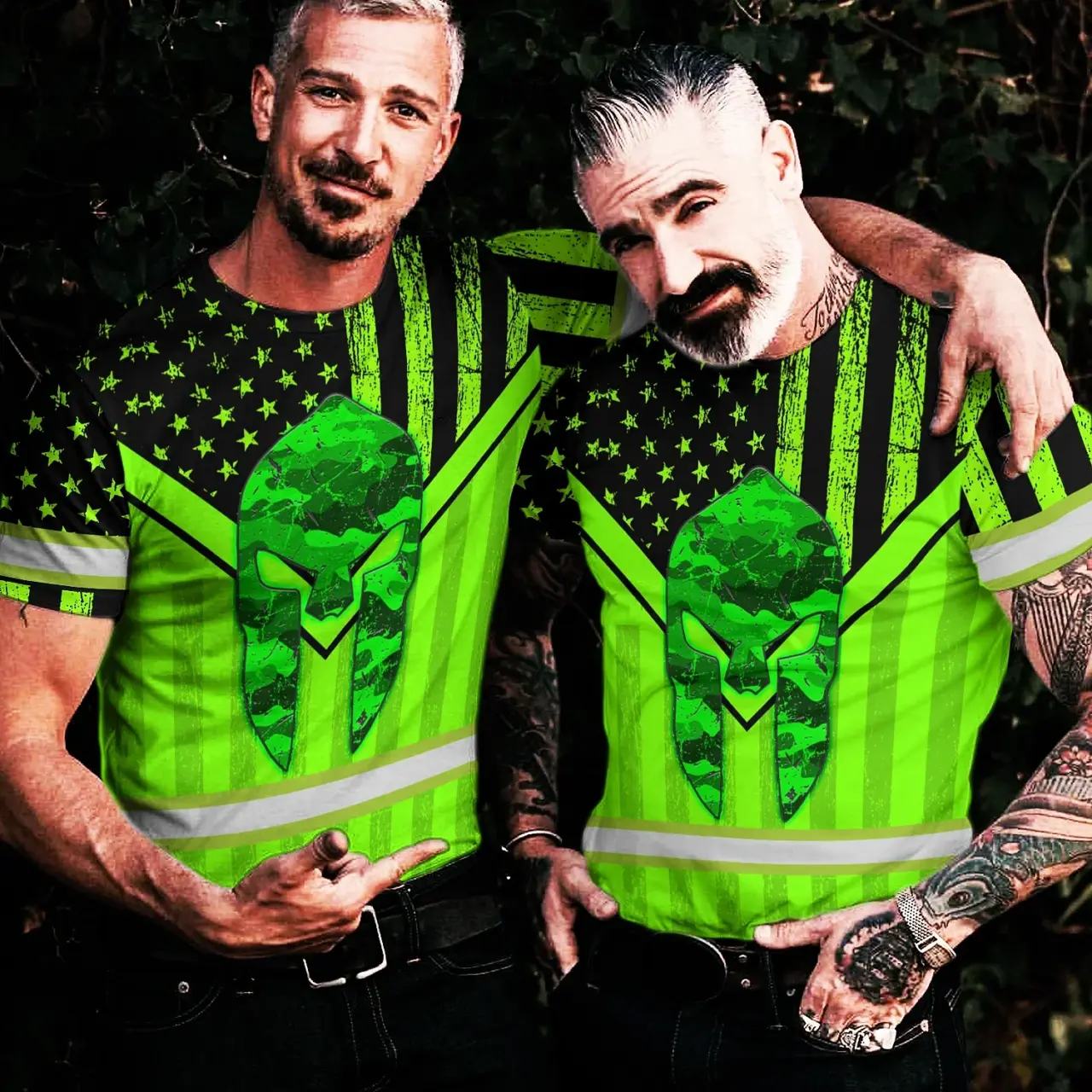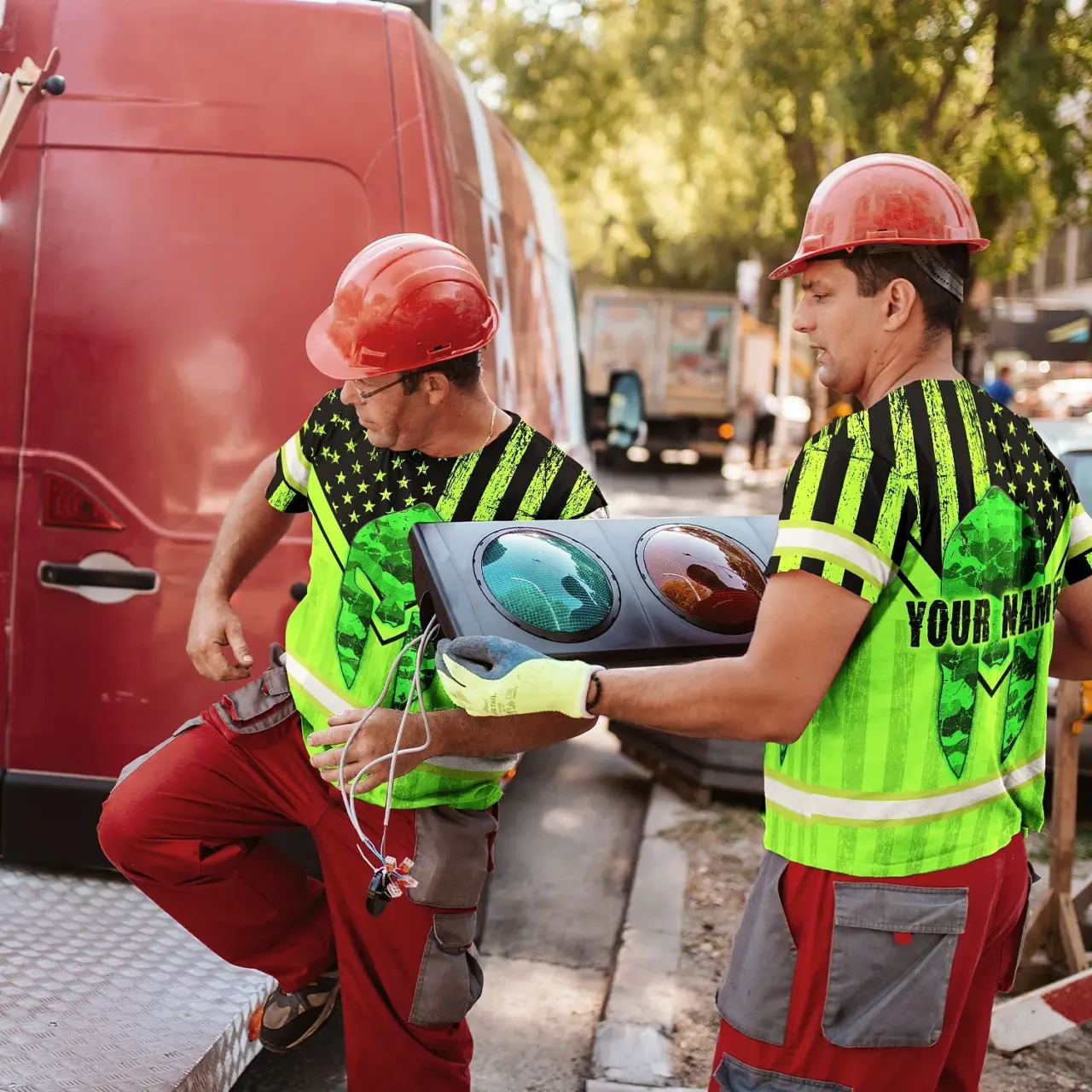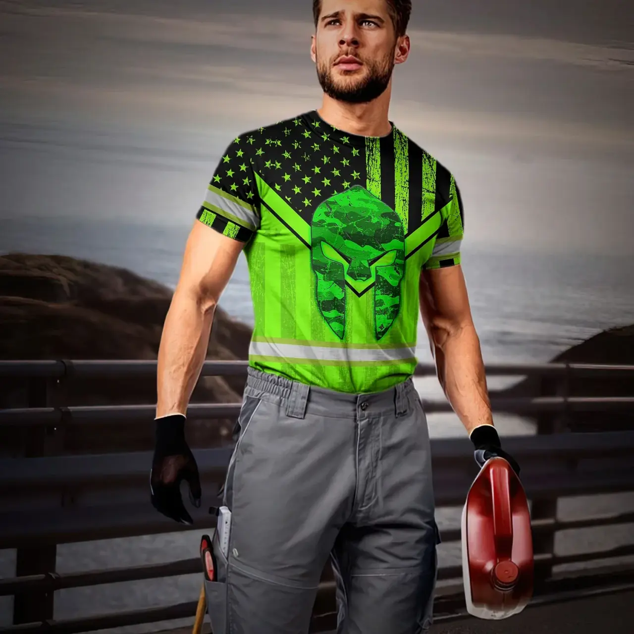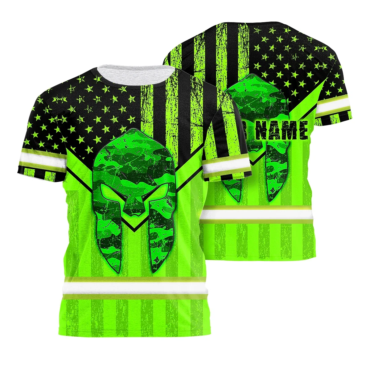 Hi Vis Shirt Reflective Tapes US Flag Skull Patriotic Custom Name Safety Workwear For Workers, Truckers, Operators