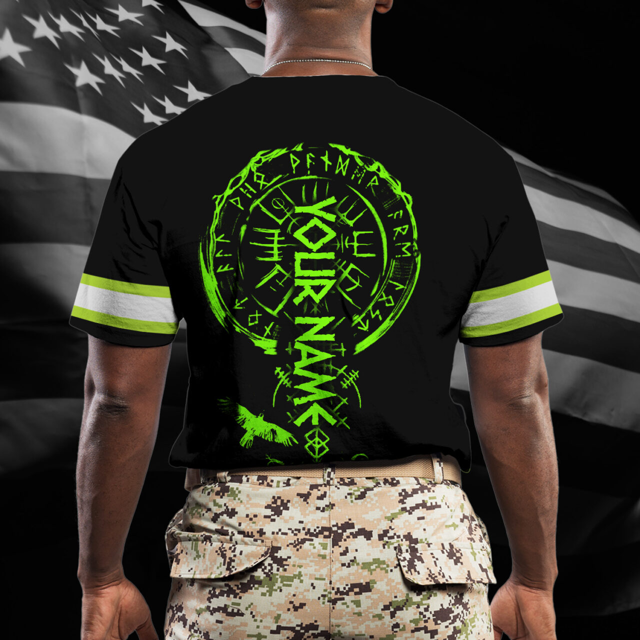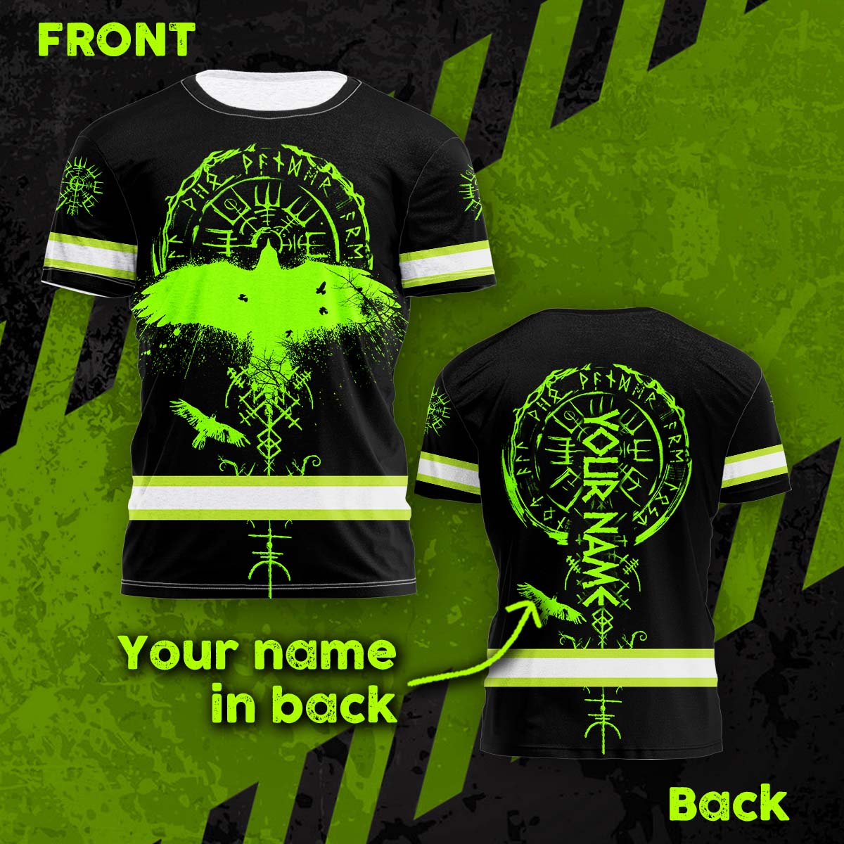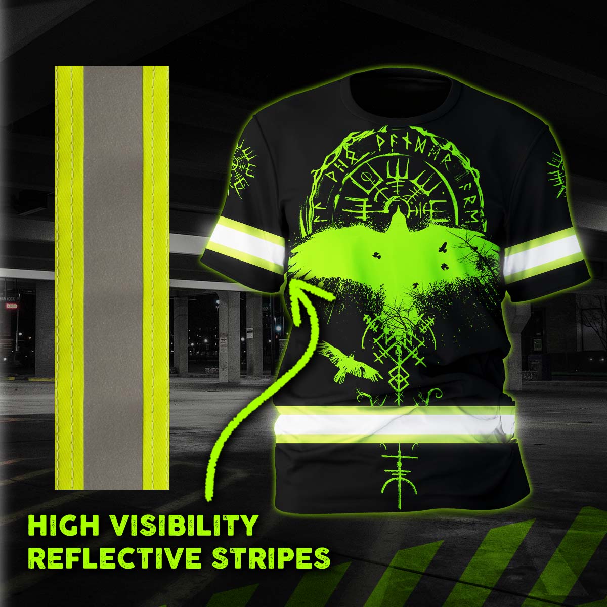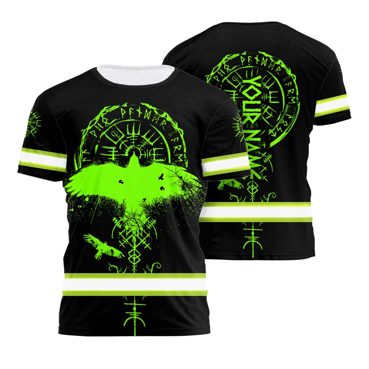 Hi Vis Shirt Reflective Tapes Viking Symbol Green Neon Custom Name Safety Workwear For Workers, Runners, Cyclists