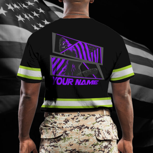 Hi Vis Shirt Reflective Tapes Violet Neon Outdoor Gorillas US Flag Custom Name Safety Workwear For Workers, Operator, Cyclists, Patriotic
