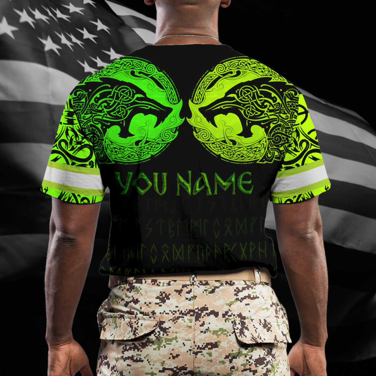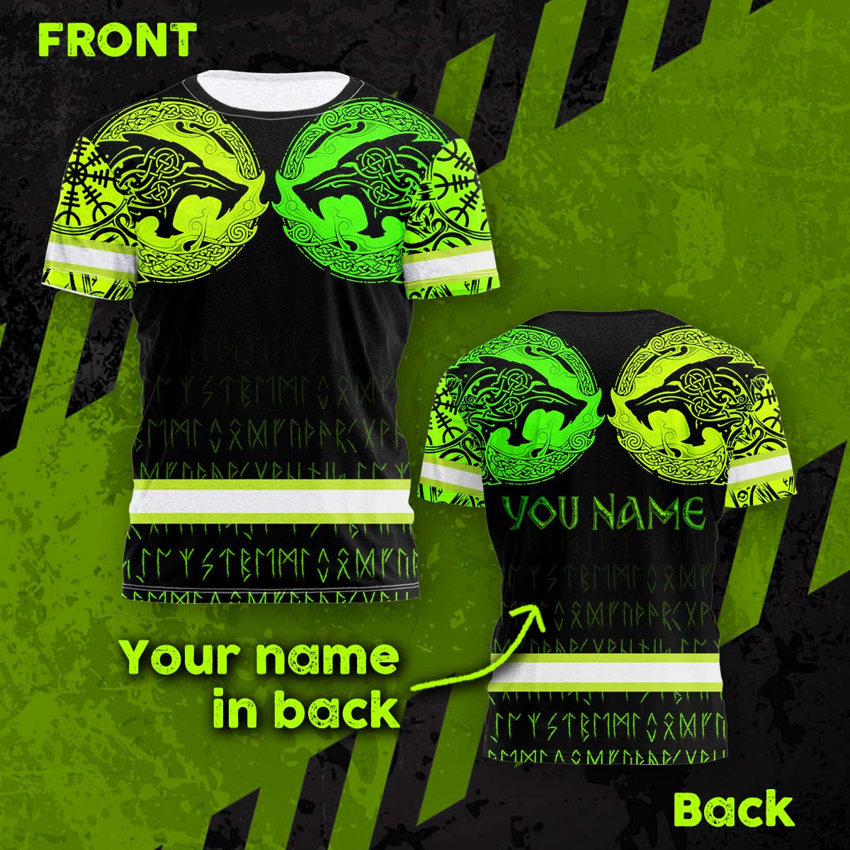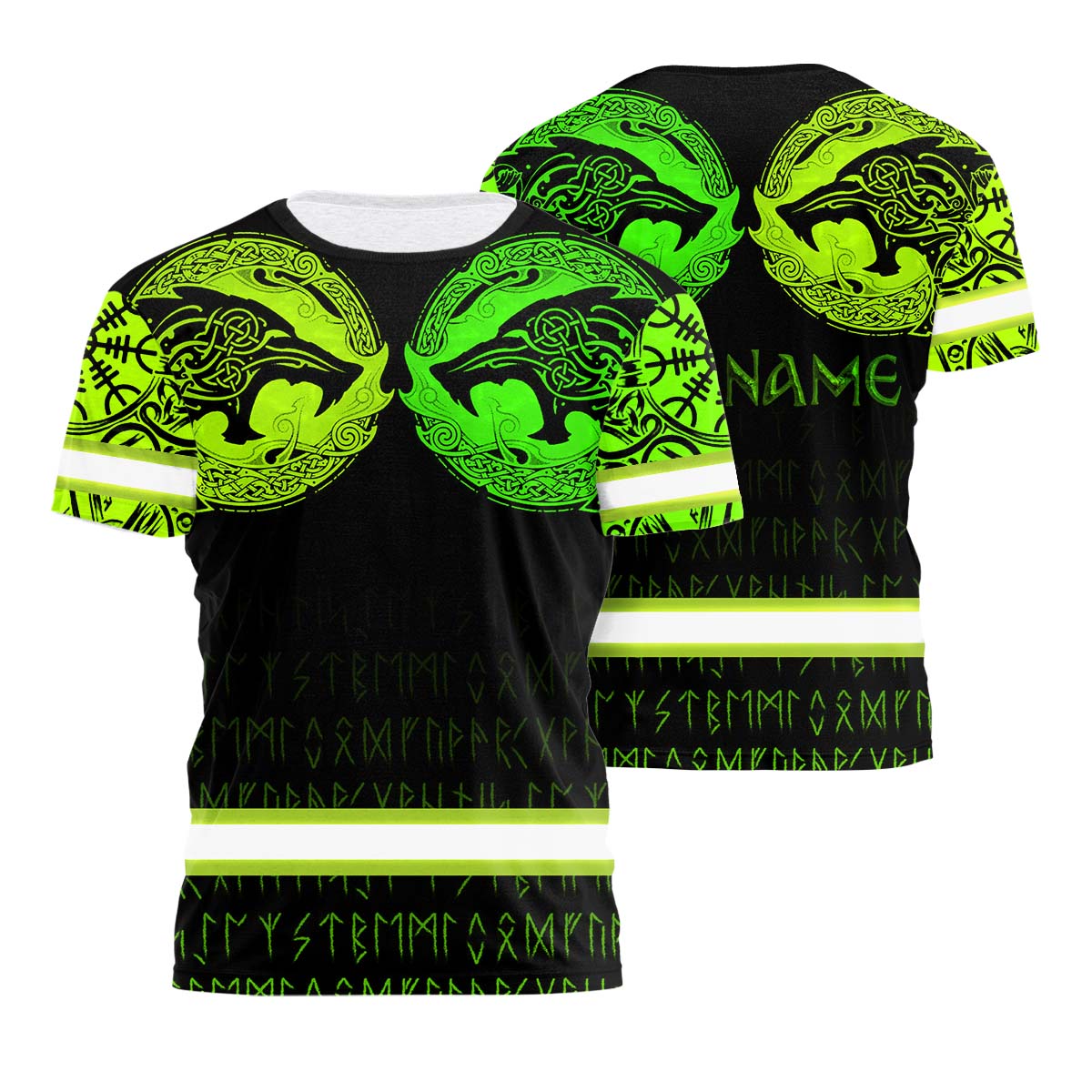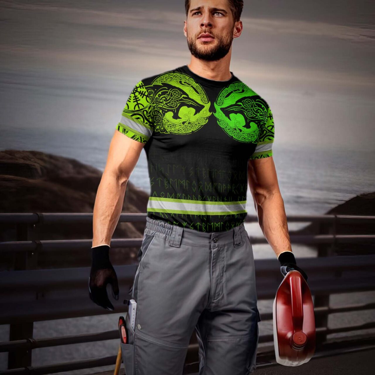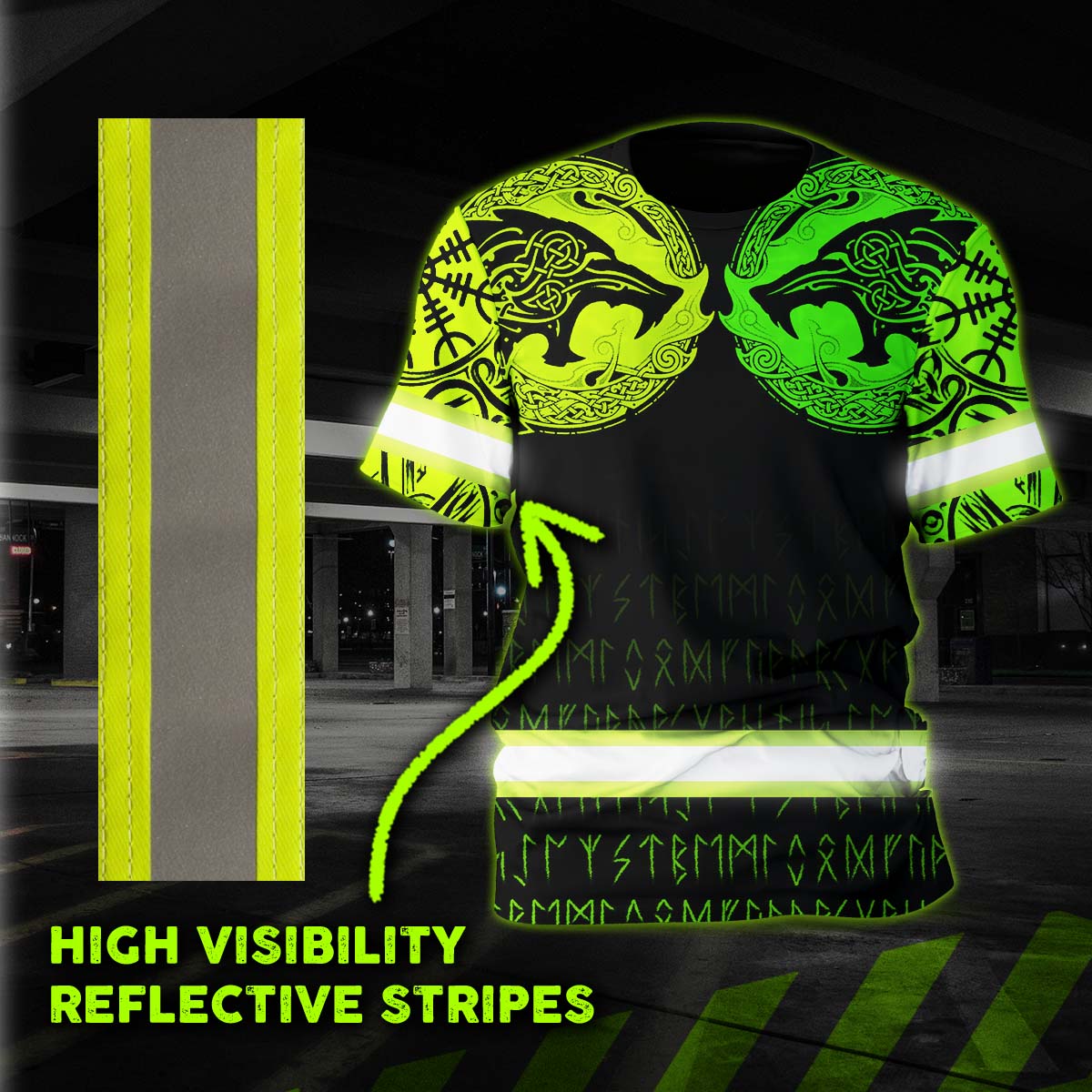 Hi Vis Shirt Reflective Tapes Wolf Tattoo Viking Symbol Green Neon Custom Name Safety Workwear For Workers, Runners, Cyclists
