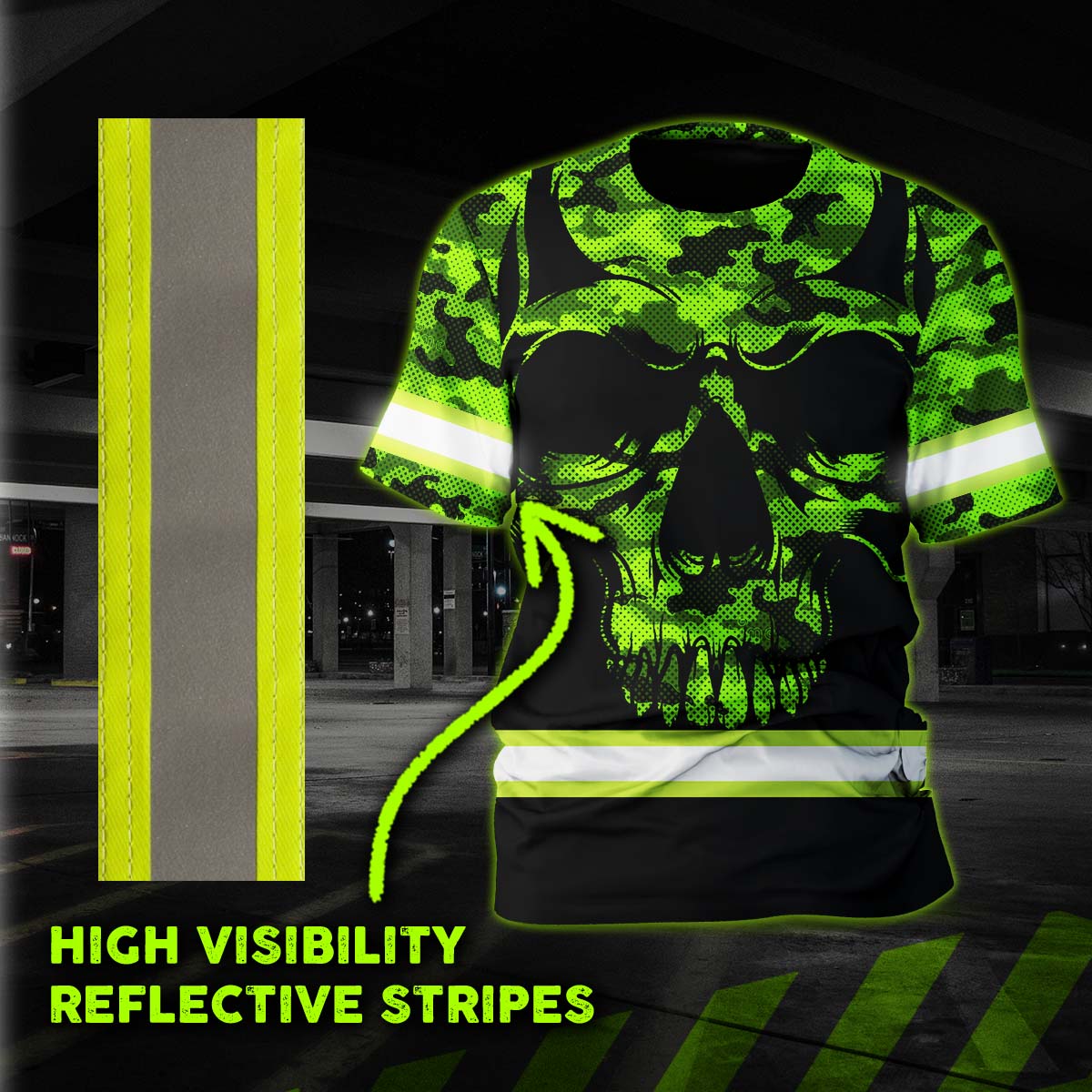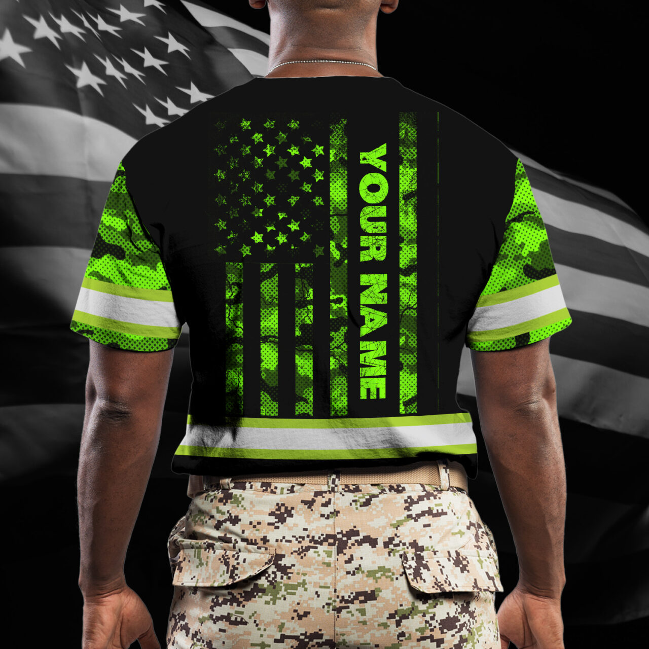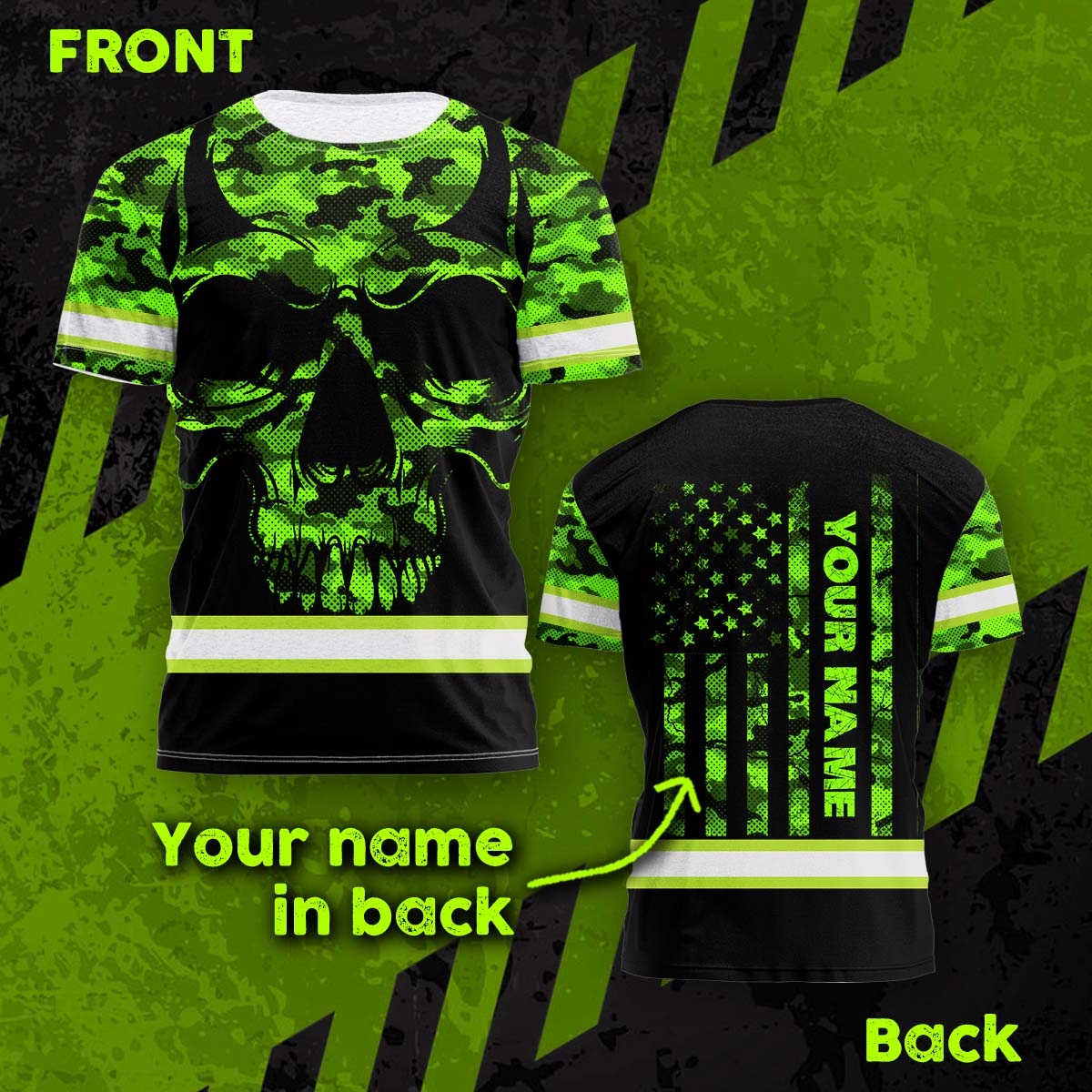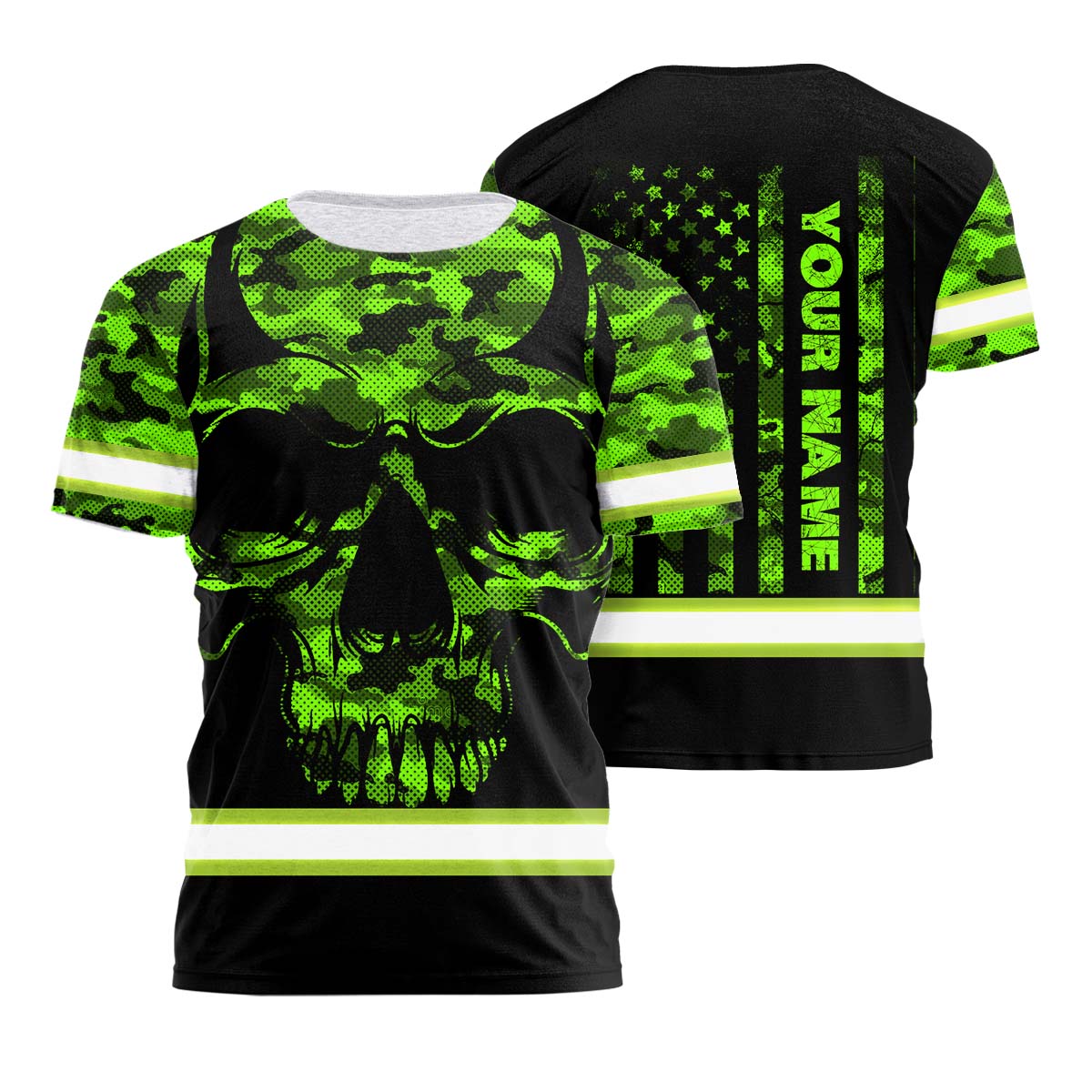 Hi Vis Shirt Reflective US Flag Patriotic Camo Skull Custom Name Safety Workwear For Workers, Runners, Cyclists, Truckers, Operator, Military Soldiers