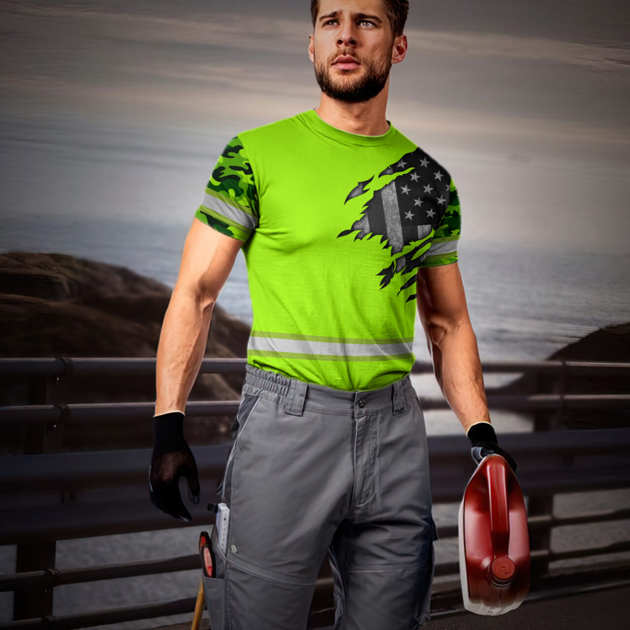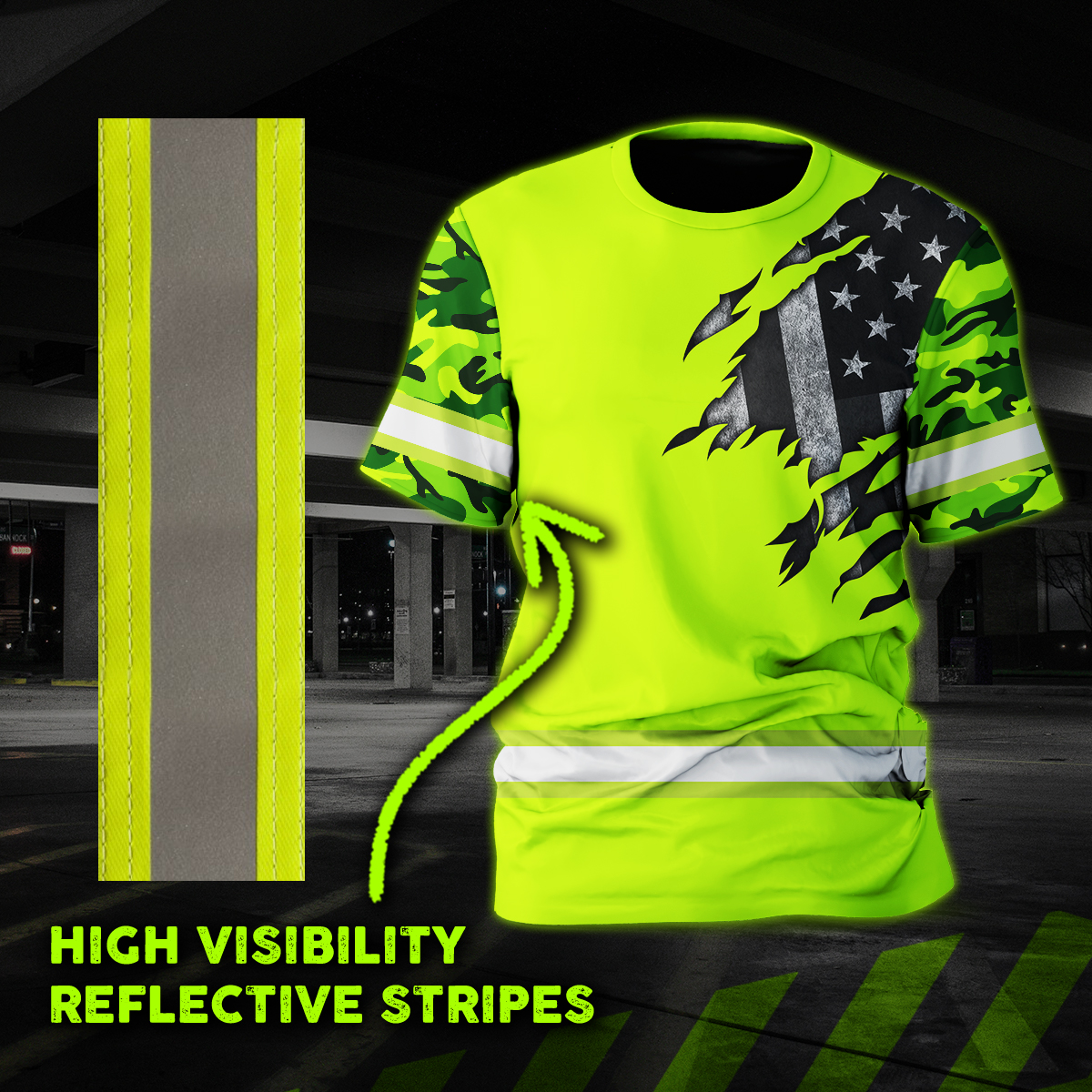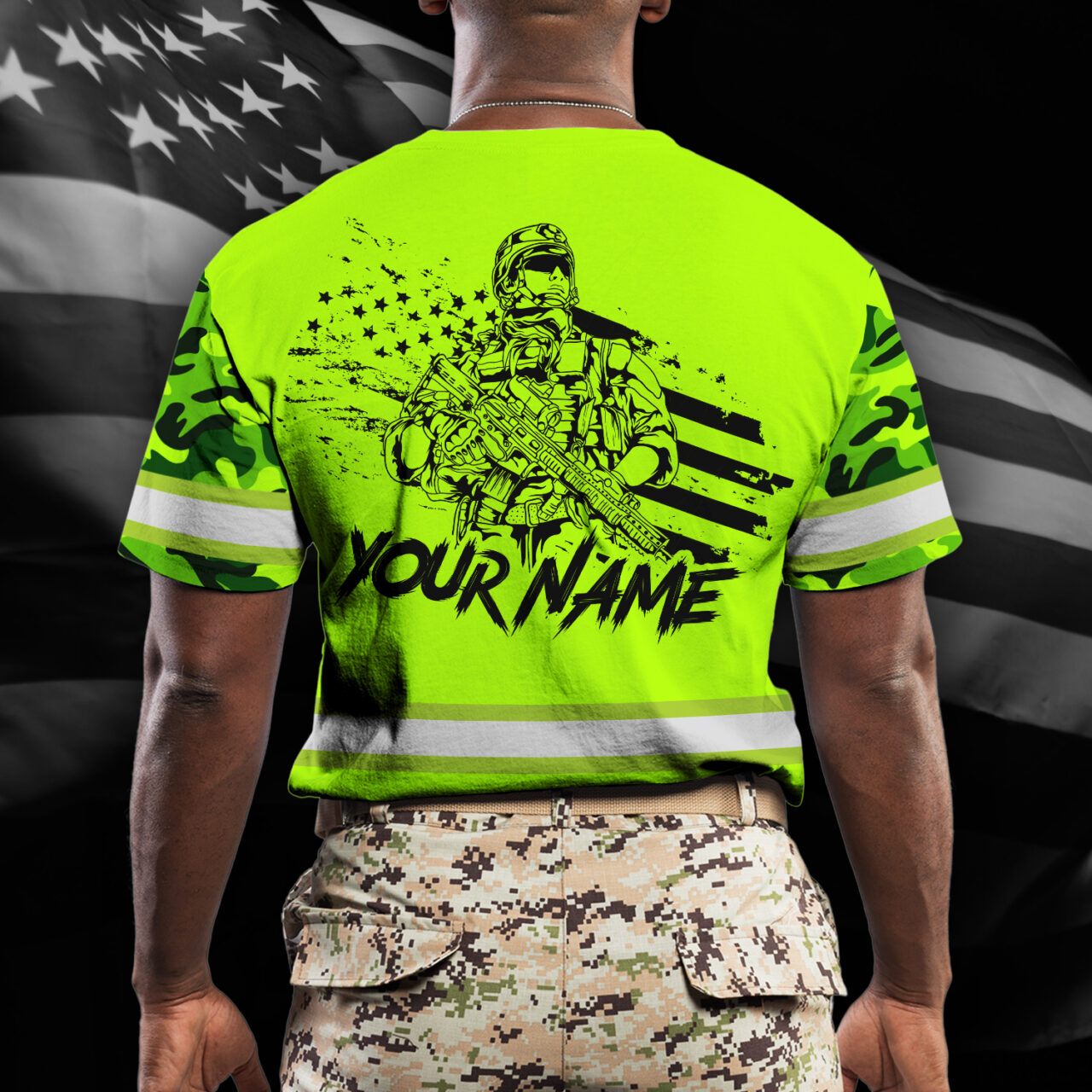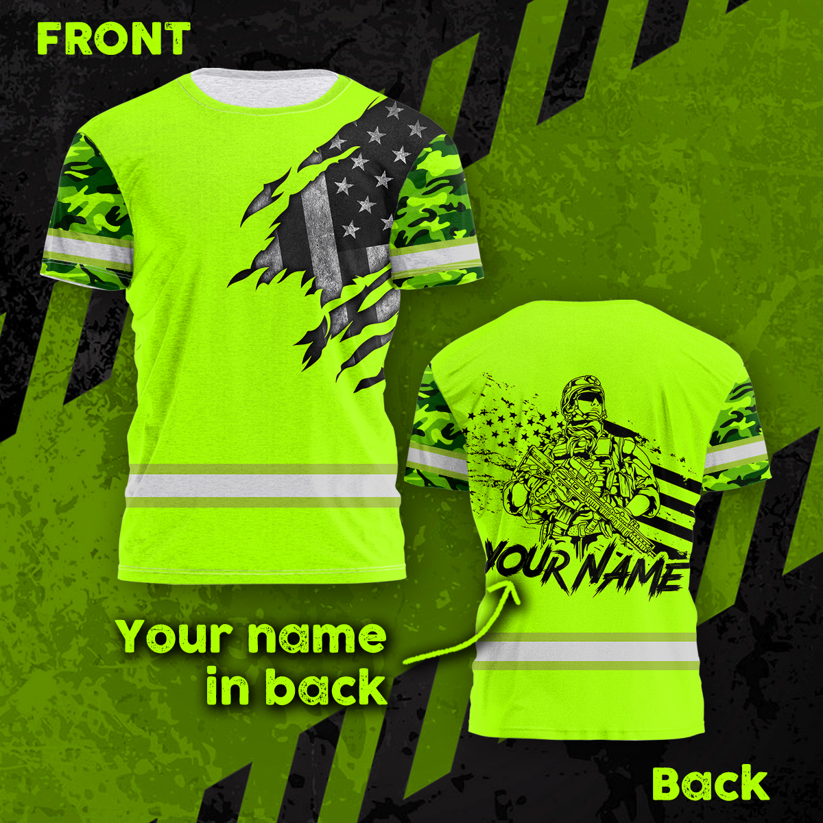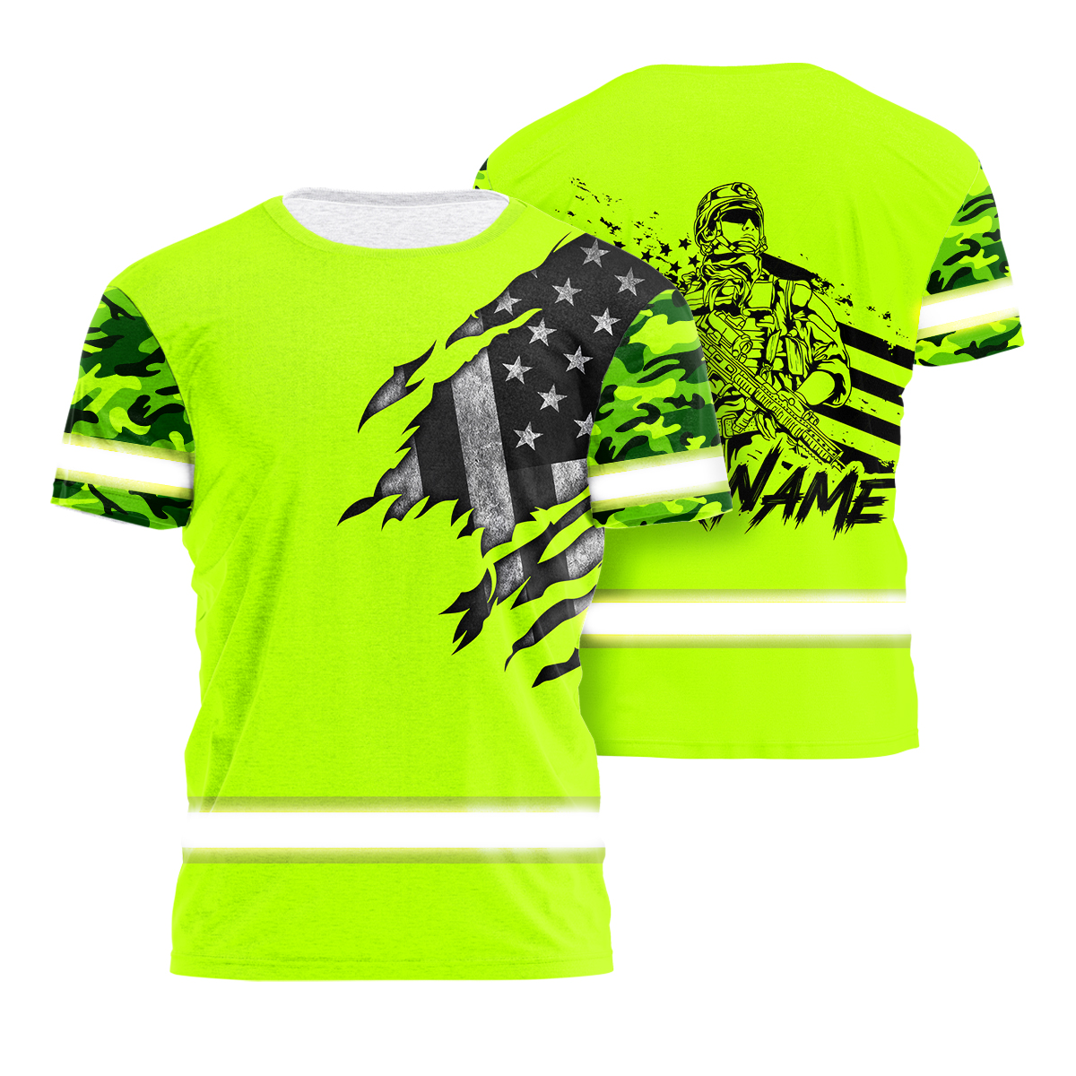 Hi Vis Shirt Reflective Veteran Soldiers Camo Green Neon Scratch US Flag Custom Name Safety Workwear