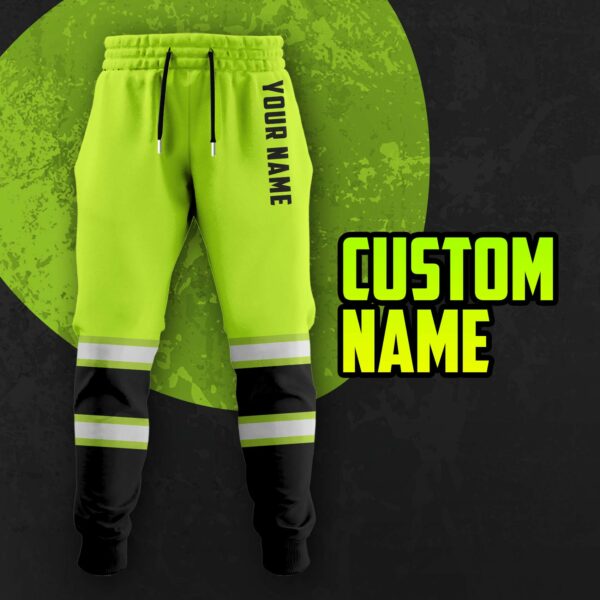 Check out these personalized Hi Vis Sweatpants Reflective Green Custom Name Safety Workwear! They not only make you more visible in low light, but they also look terrific. Additionally, they are ideal for all-day wear due to the comfy fit. Place your order right away to experience the impact safety clothing can make!