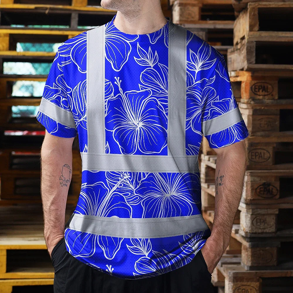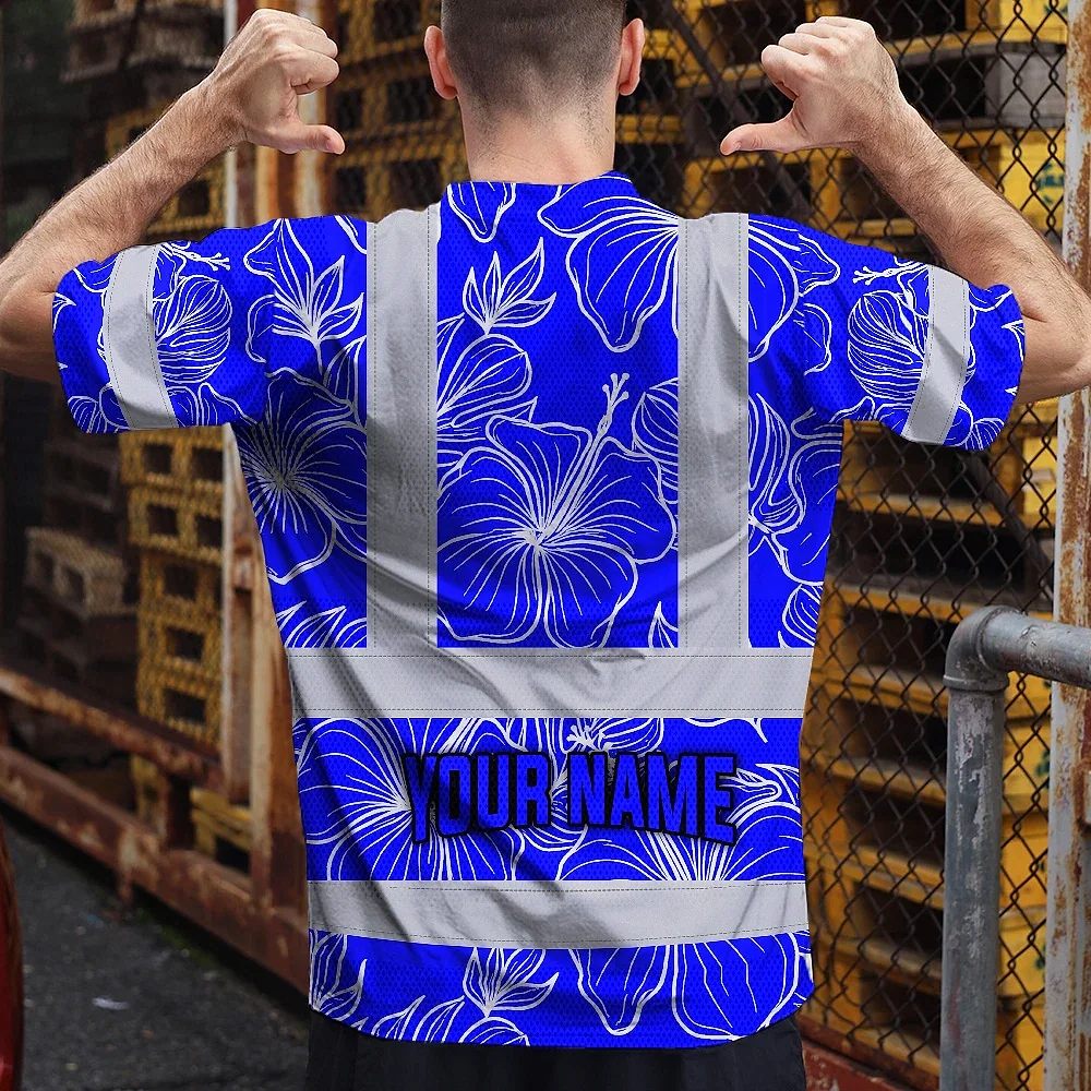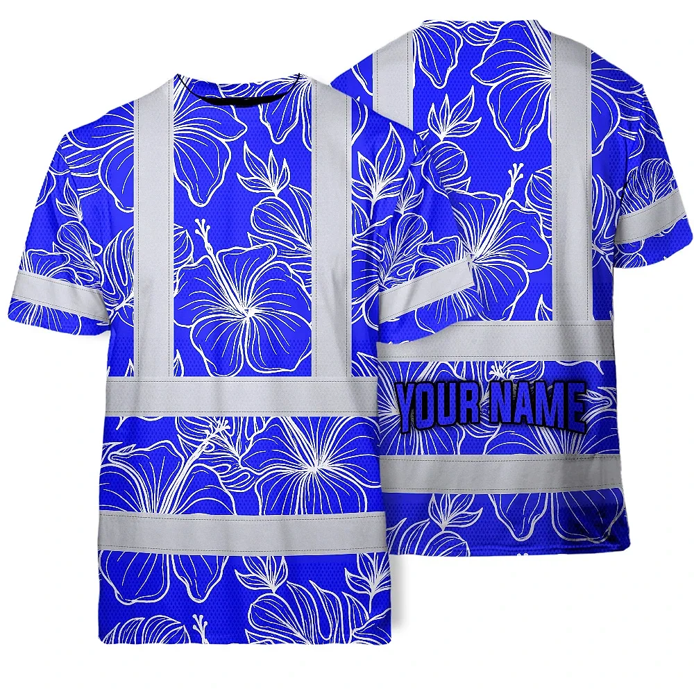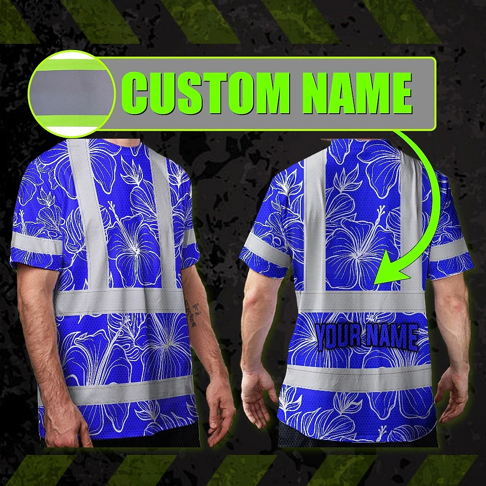 Hi Vis T Shirt Reflective Tapes Blue Neon Flowers Hawaii Custom Name Safety Workwear For Workers, Truckers, Operators