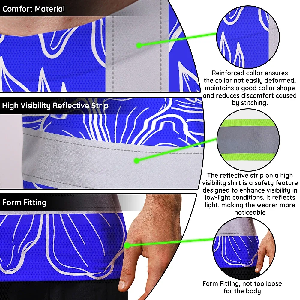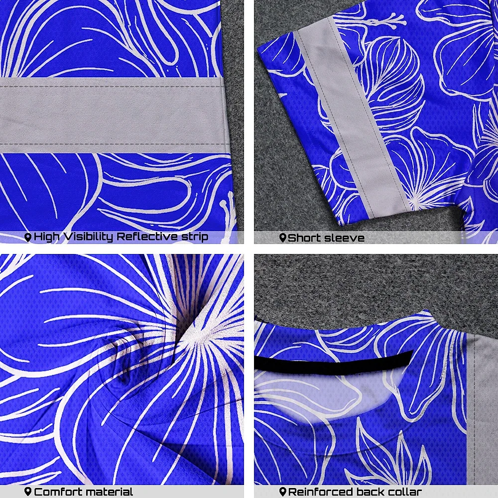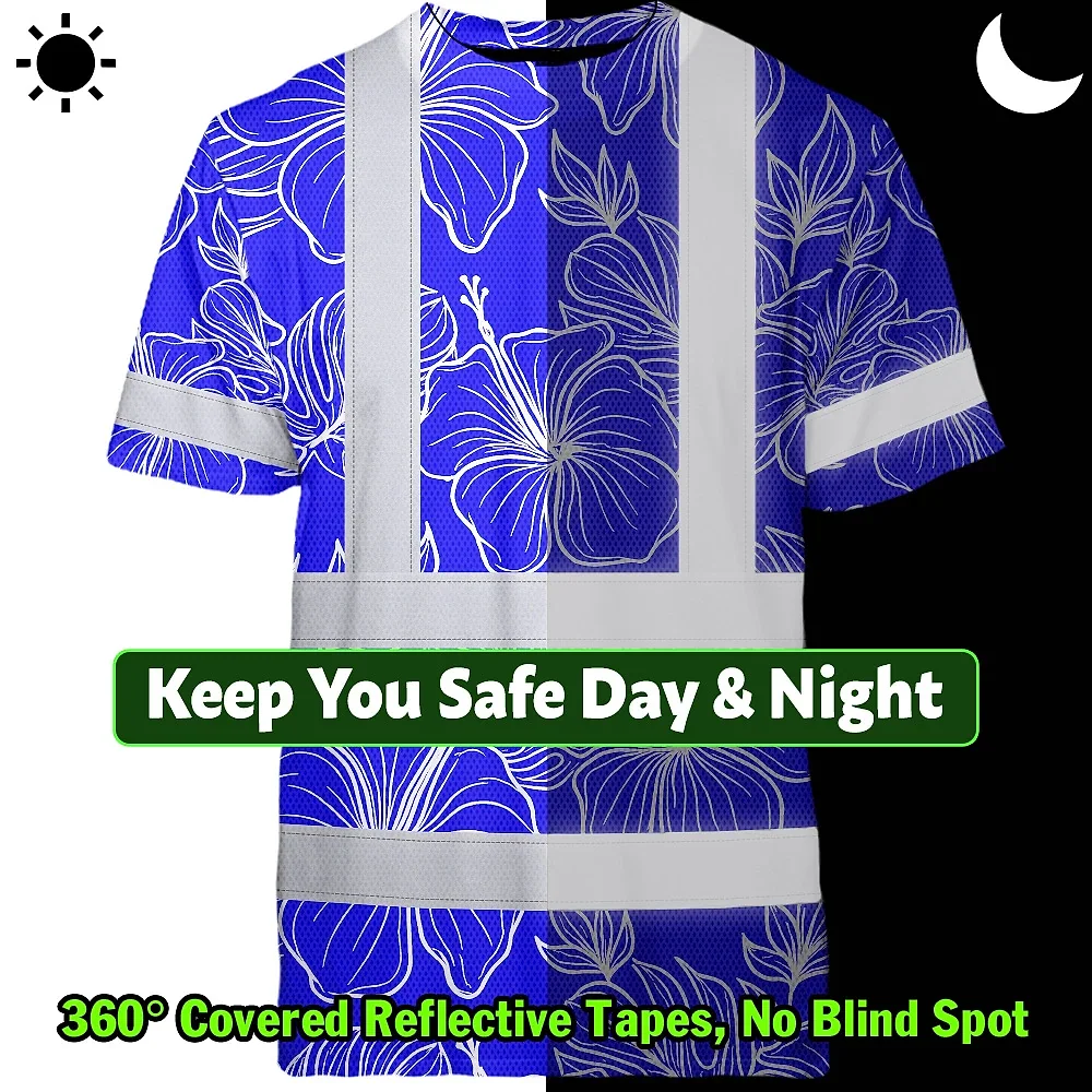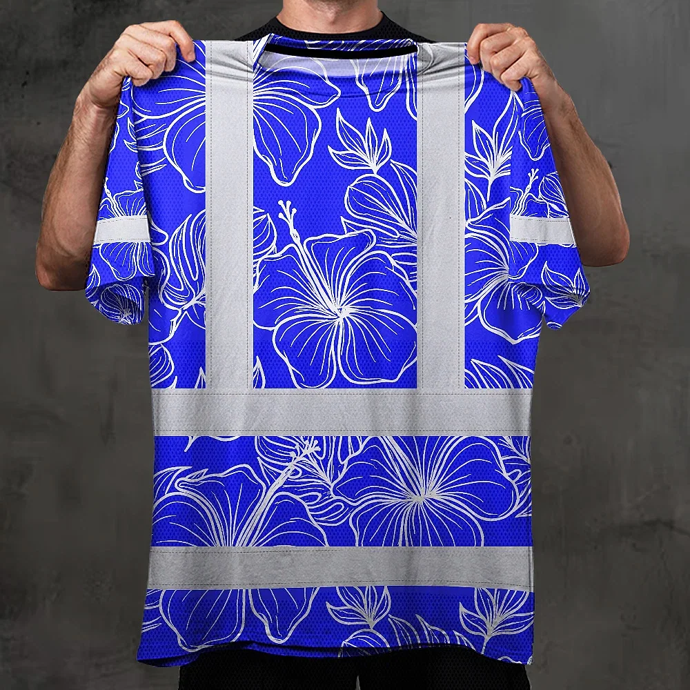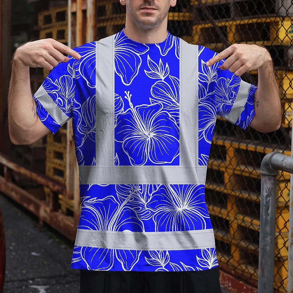Hi Vis T Shirt Reflective Tapes Blue Neon Flowers Hawaii Custom Name Safety Workwear For Workers, Truckers, Operators