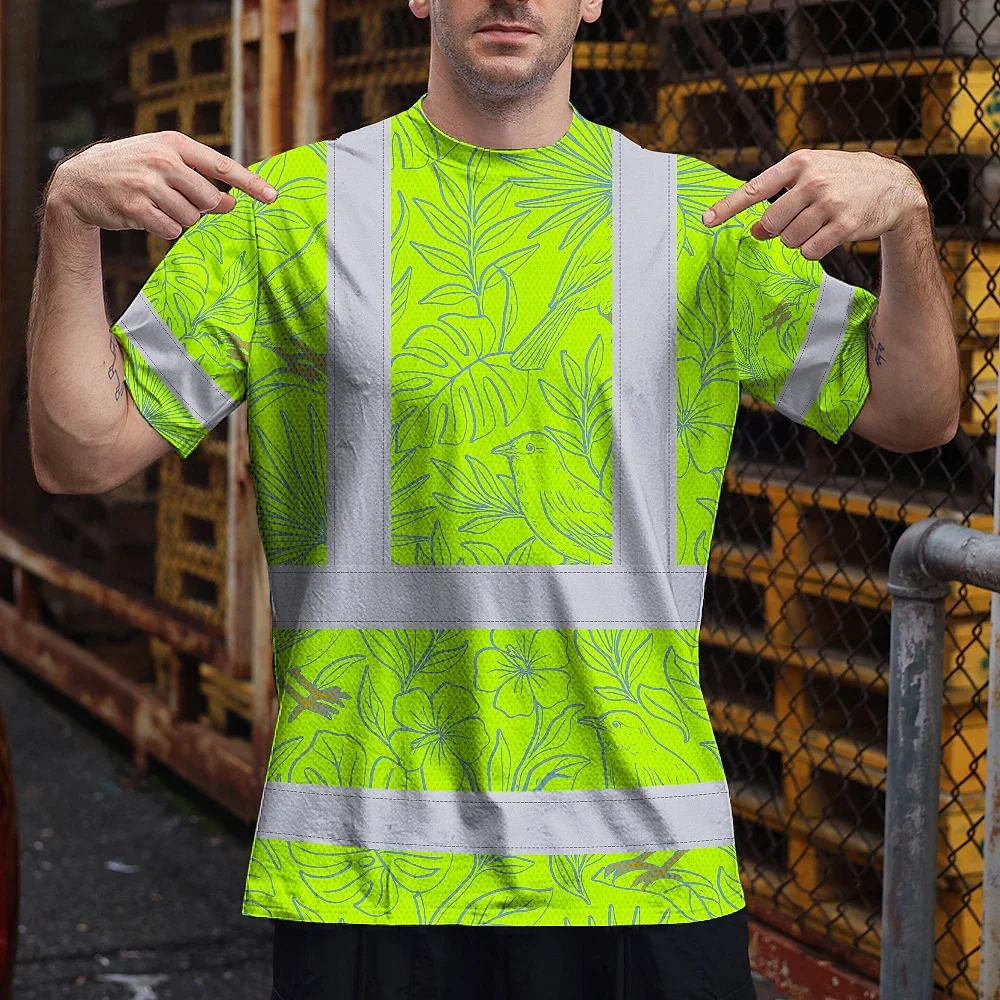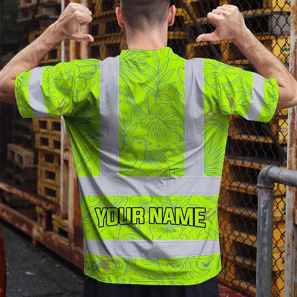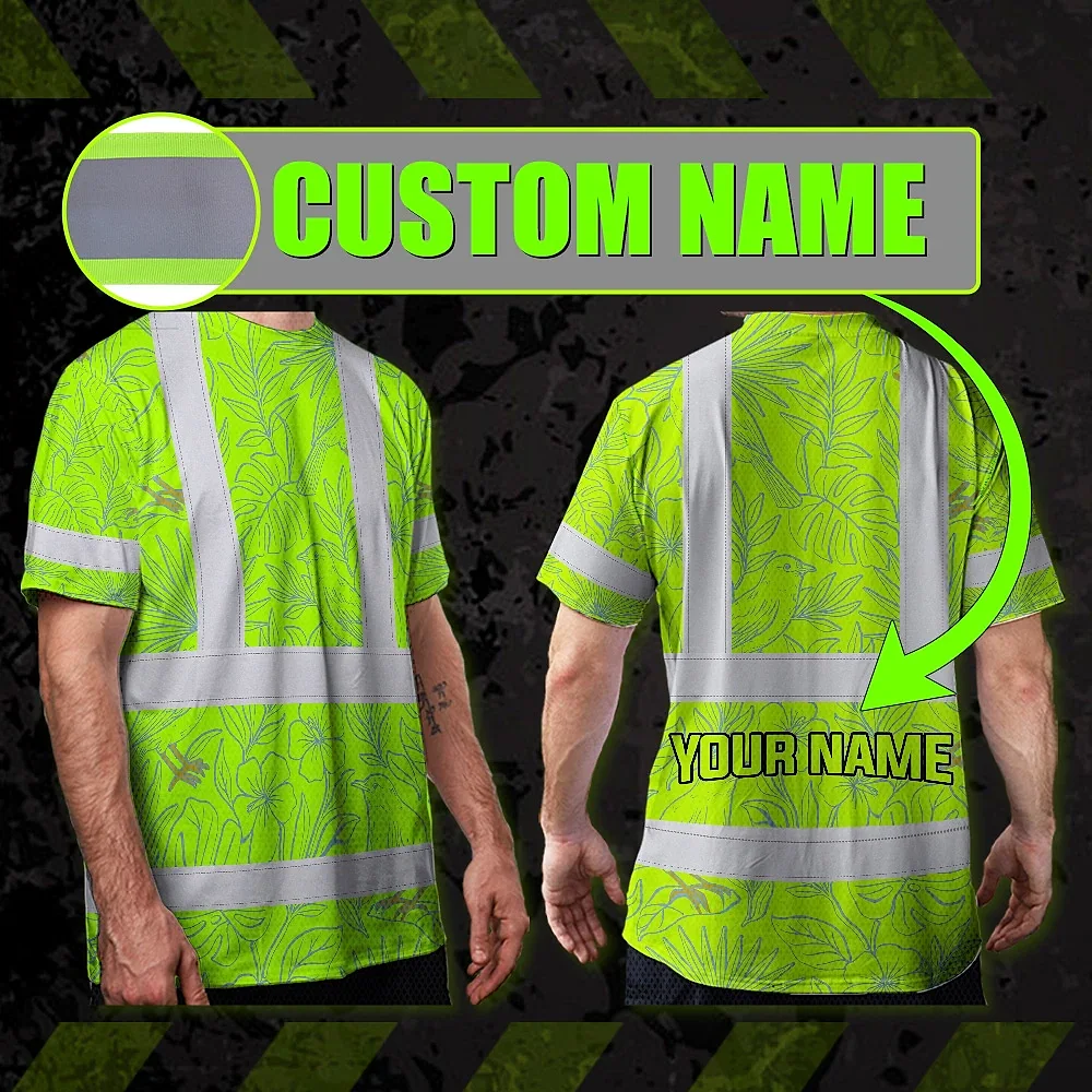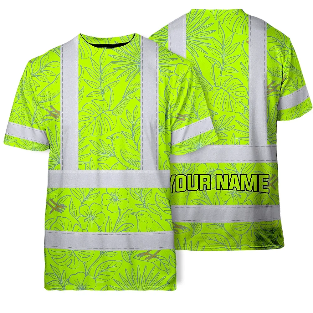 Hi Vis T Shirt Reflective Tapes Green Grey Flowers Hawaii Custom Name Safety Workwear For Workers, Truckers, Operators