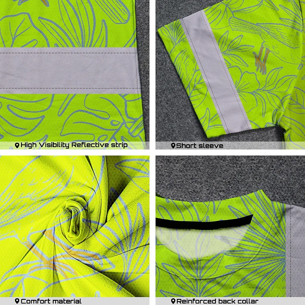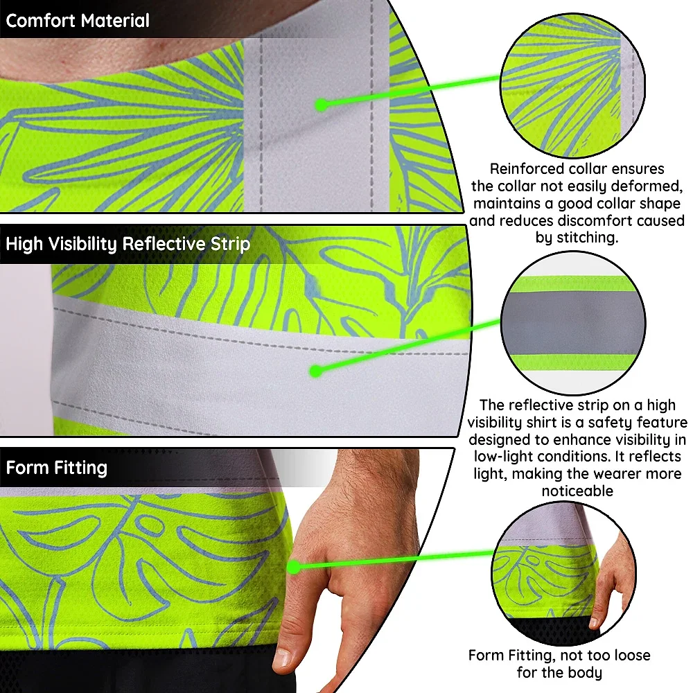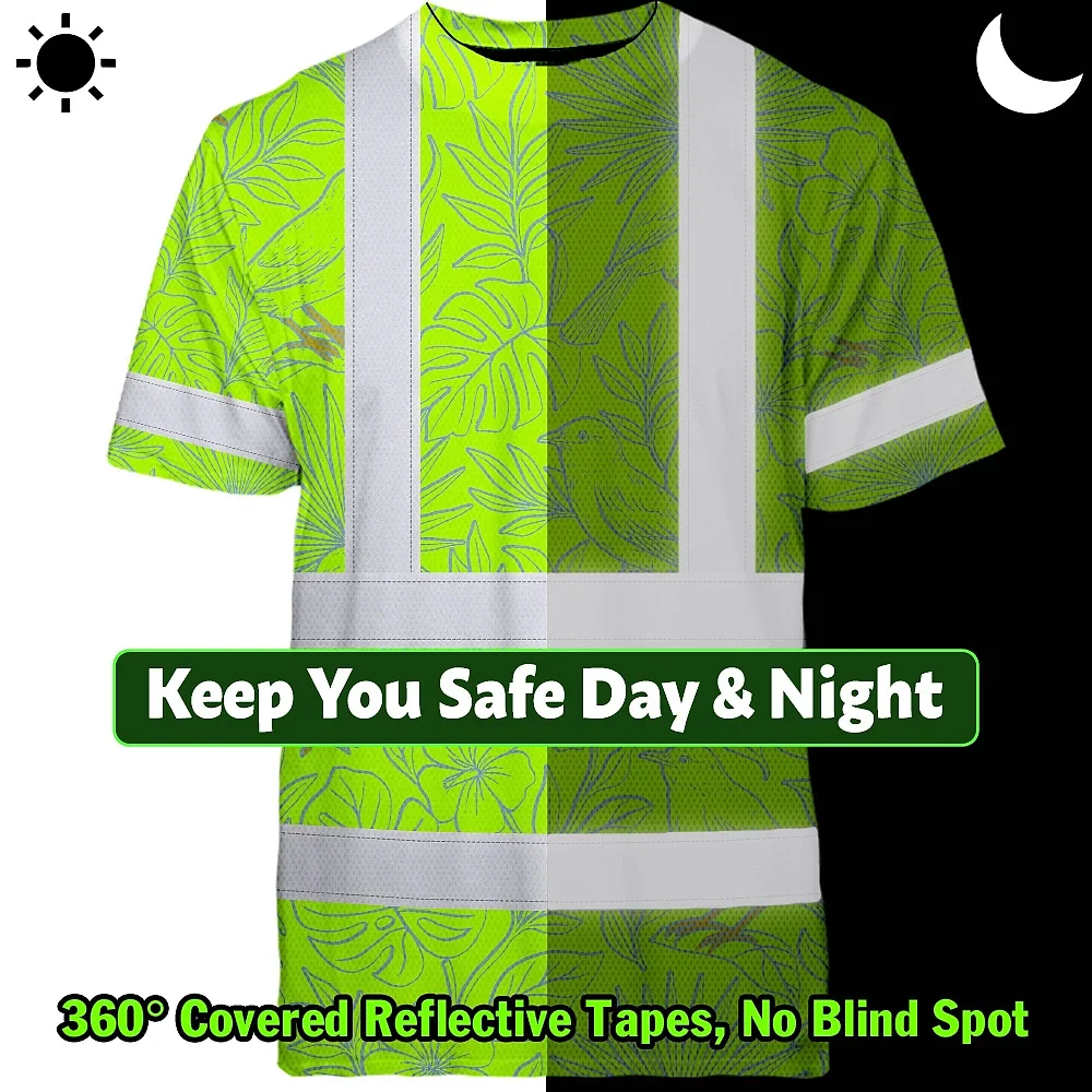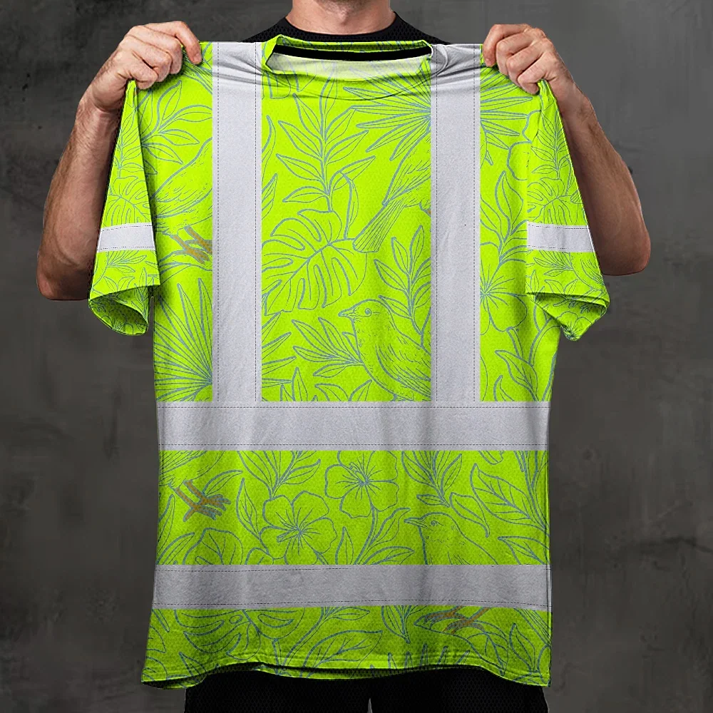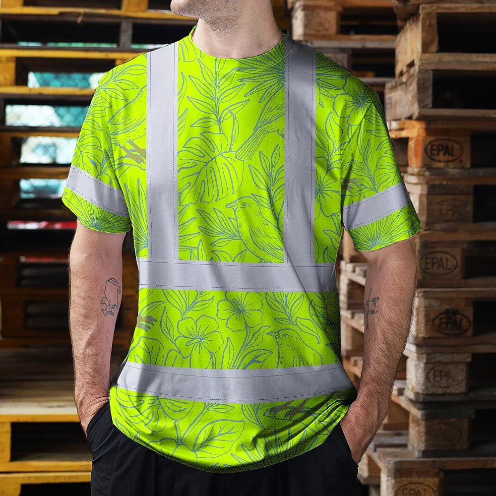 Hi Vis T Shirt Reflective Tapes Green Grey Flowers Hawaii Custom Name Safety Workwear For Workers, Truckers, Operators