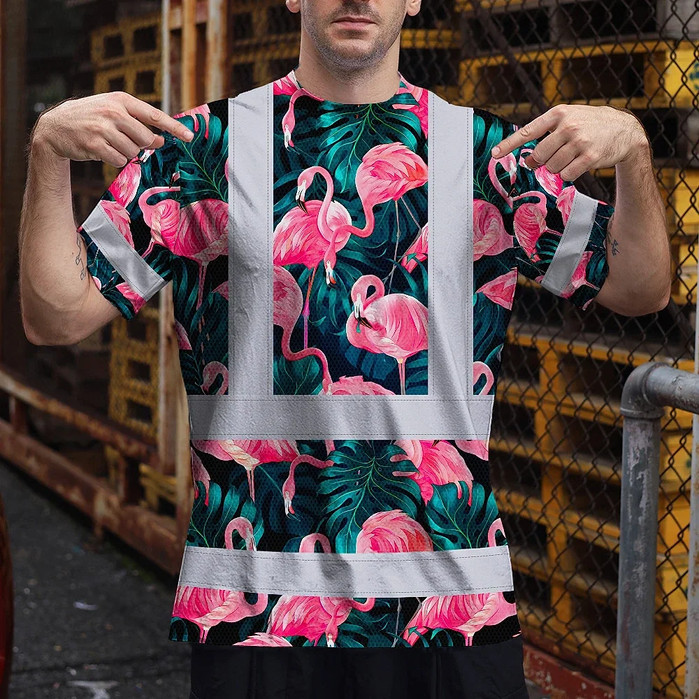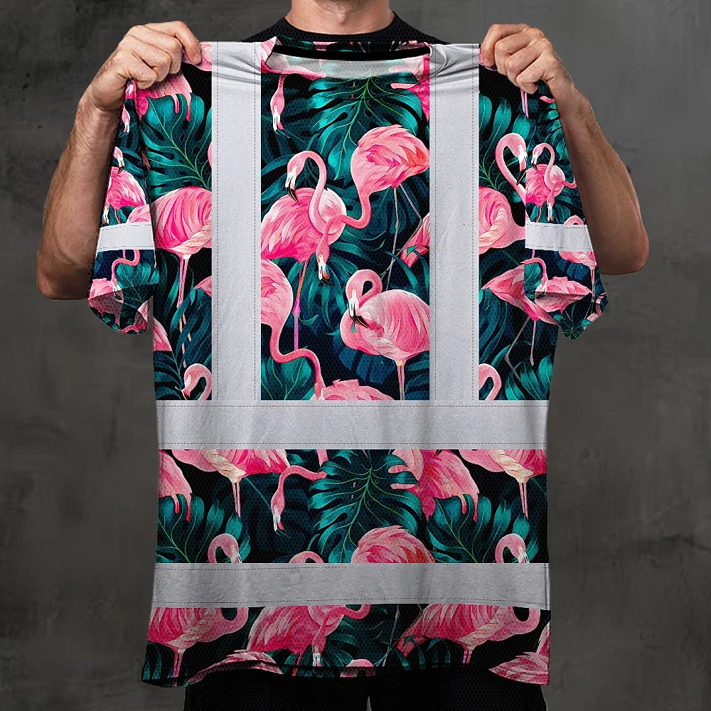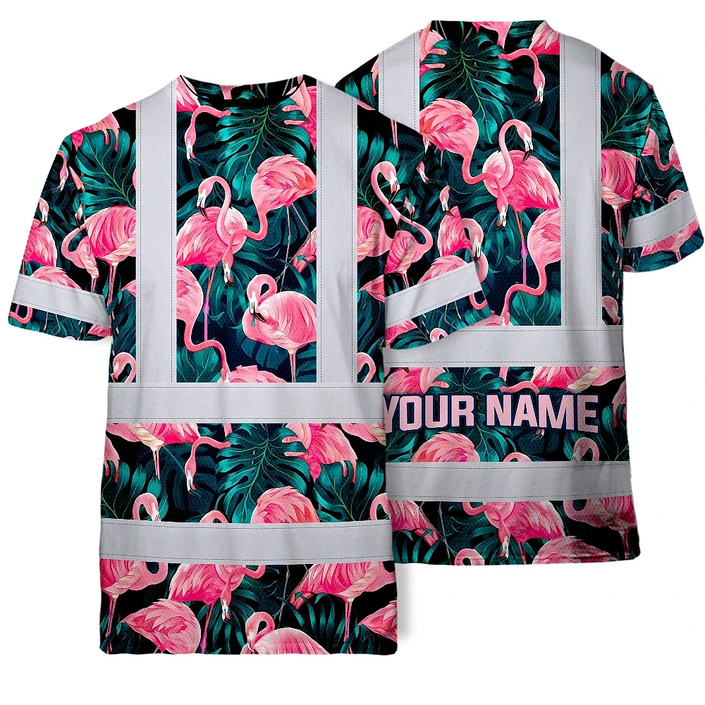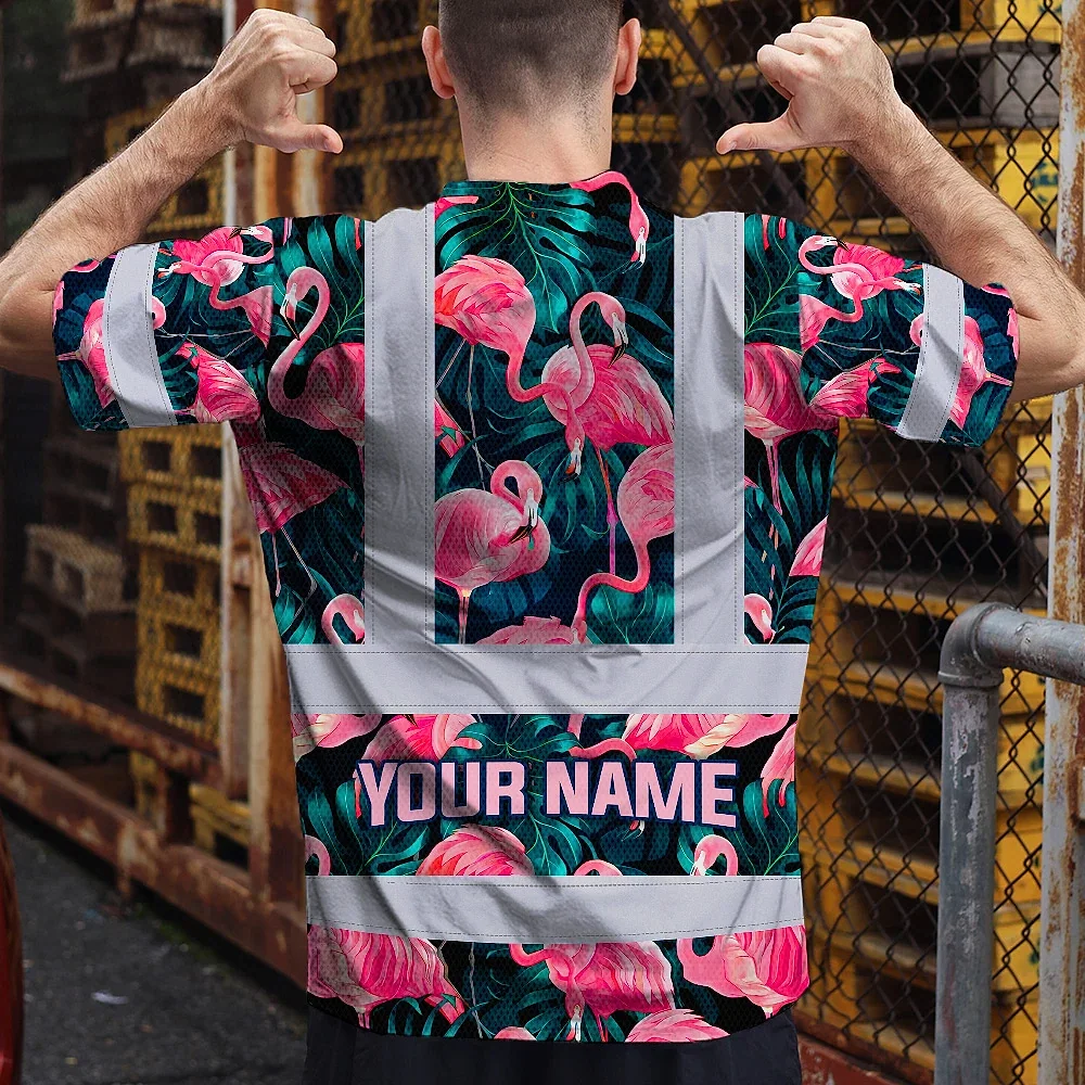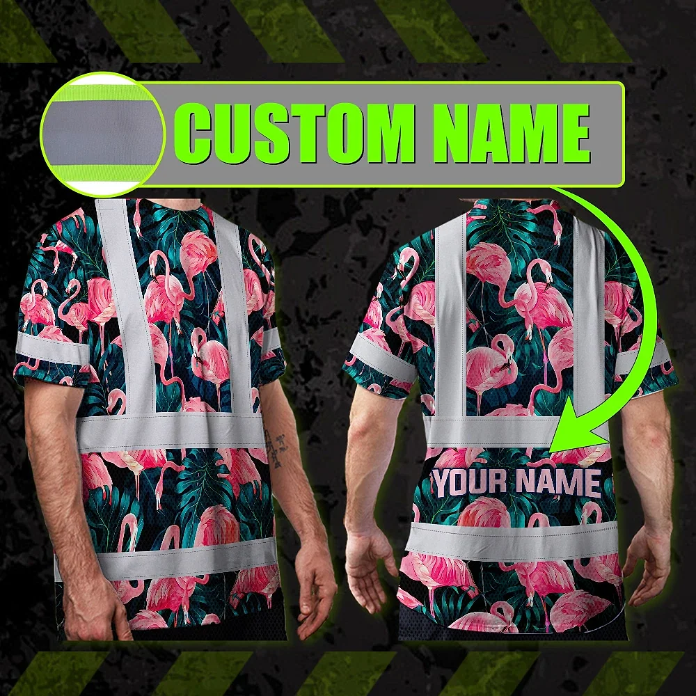 Hi Vis T Shirt Reflective Tapes Hawaii Flamingo Custom Name Safety Workwear For Workers, Truckers, Operators