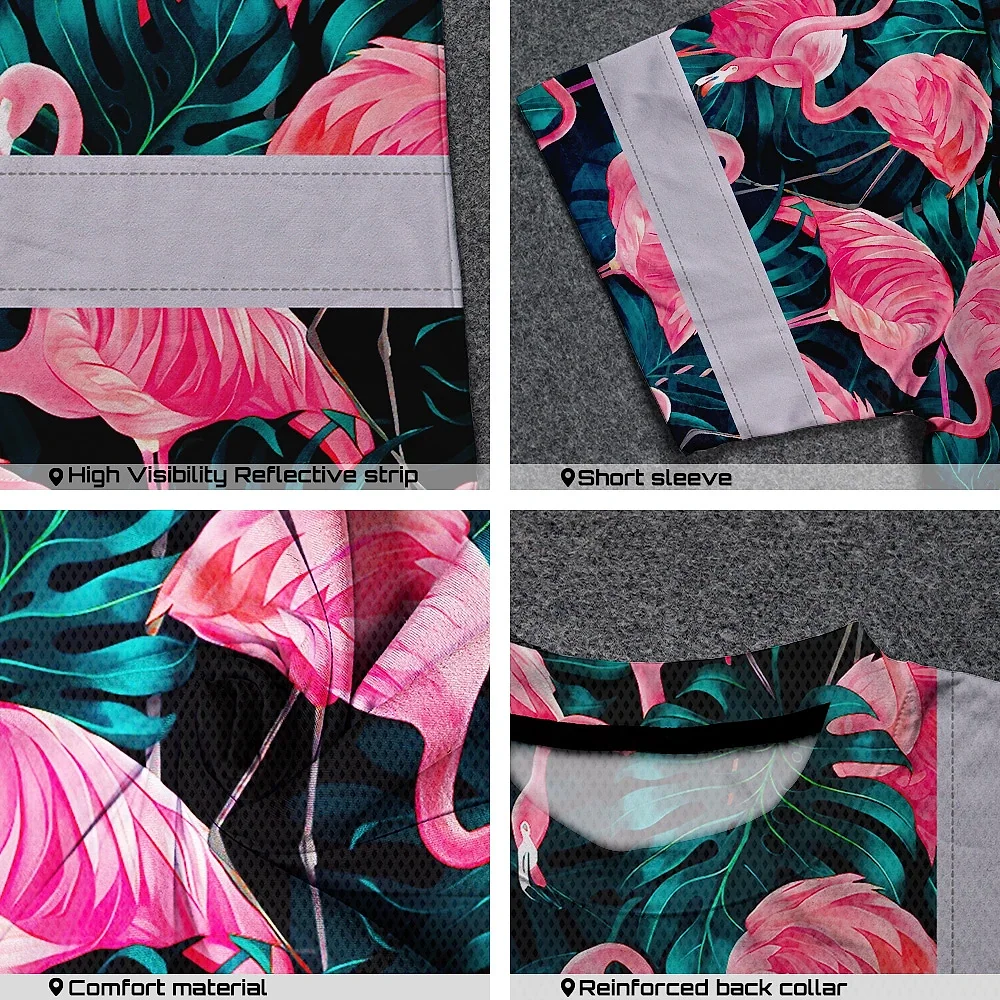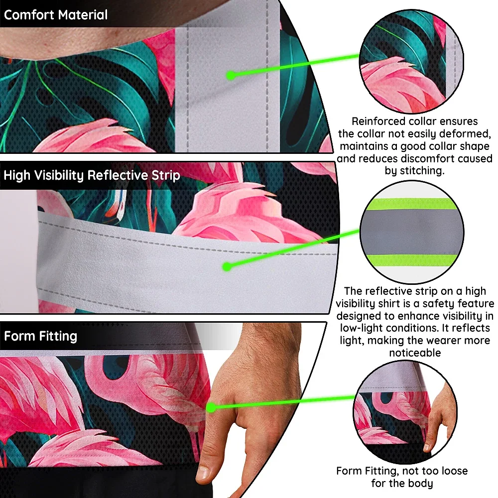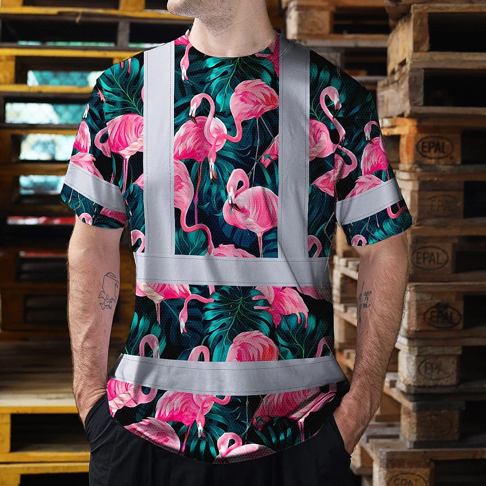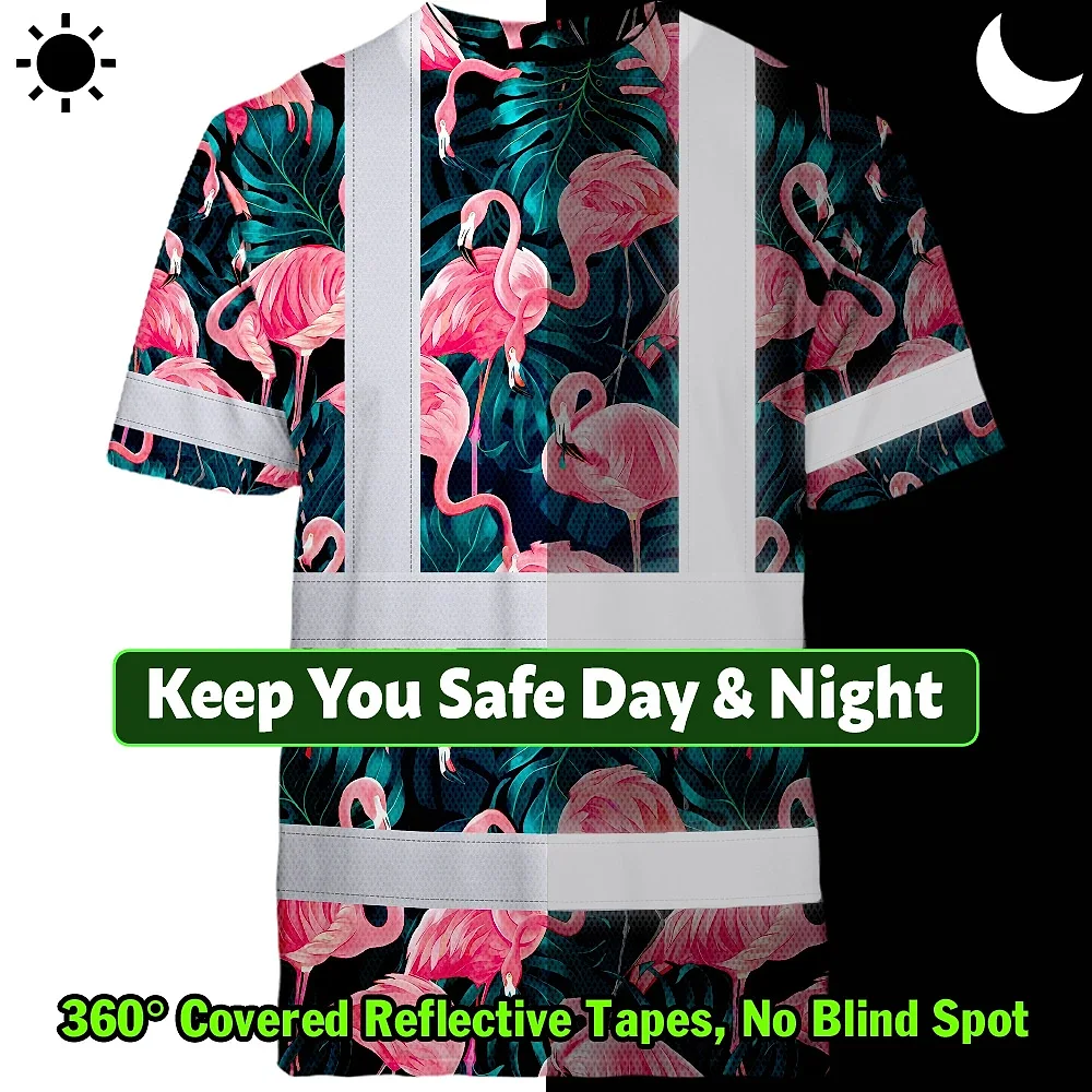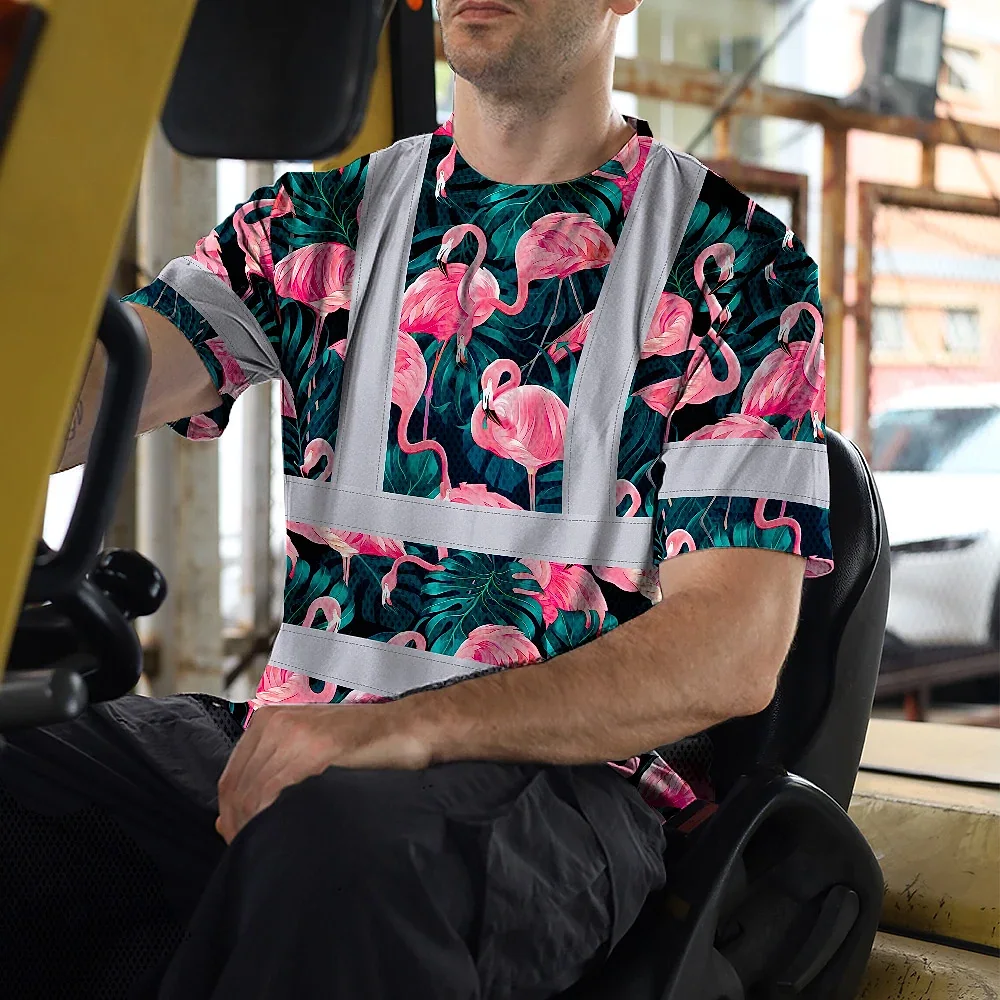 Hi Vis T Shirt Reflective Tapes Hawaii Flamingo Custom Name Safety Workwear For Workers, Truckers, Operators