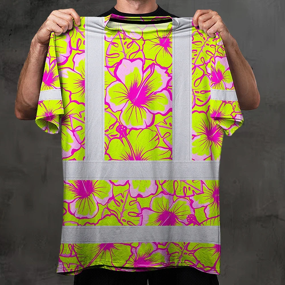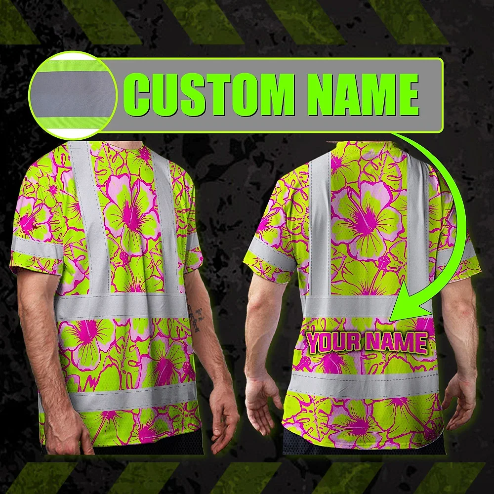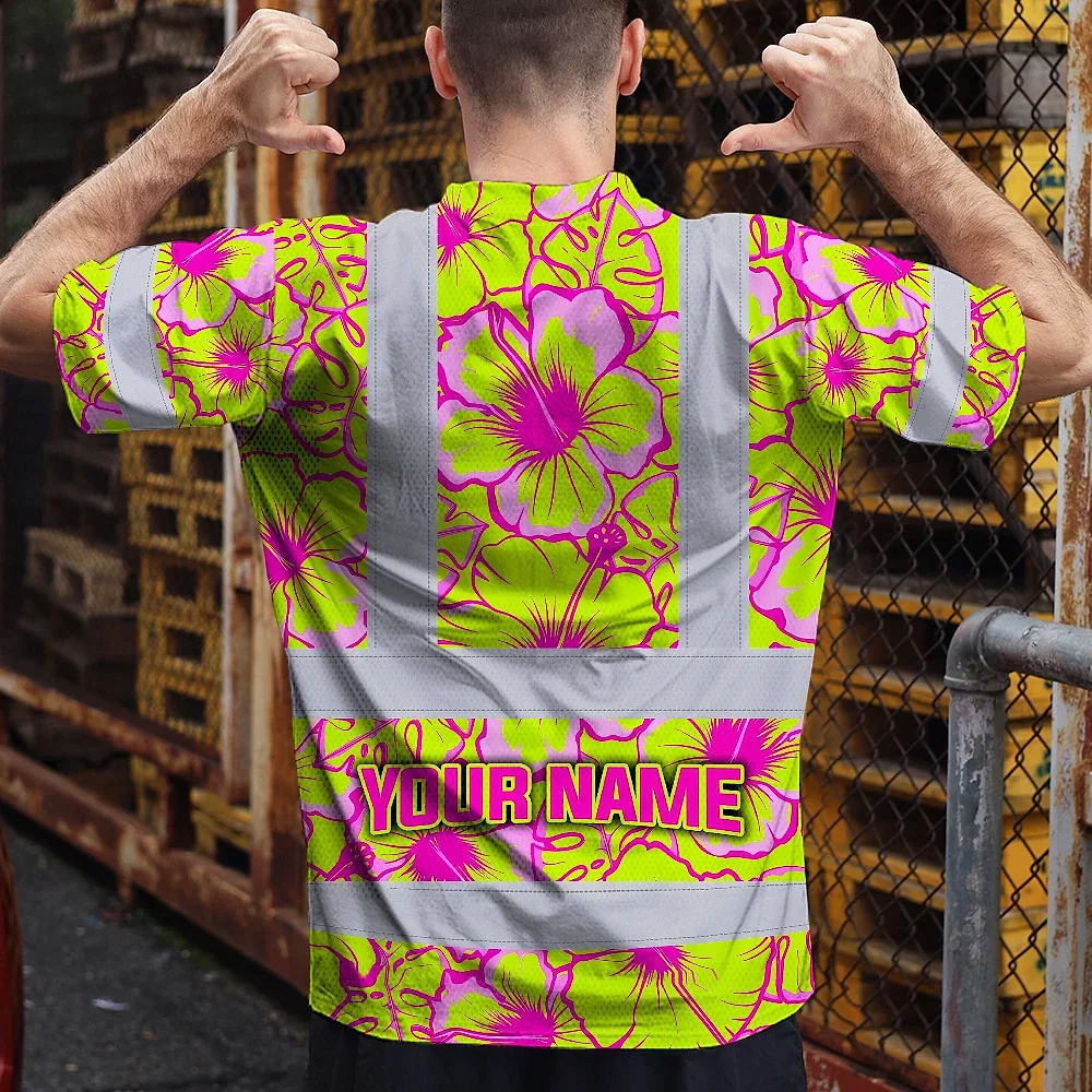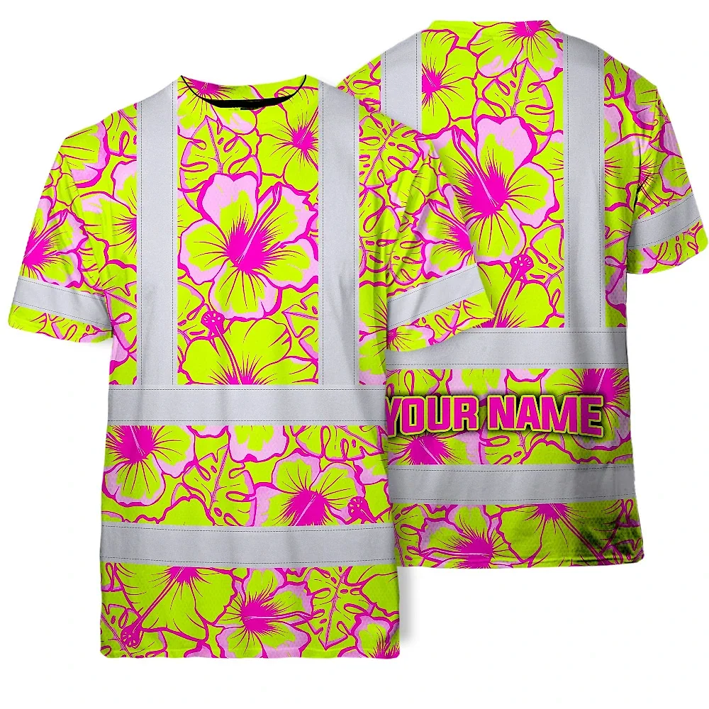 Hi Vis T Shirt Reflective Tapes Pink Neon And Lime Flowers Hawaii Custom Name Safety Workwear For Workers, Truckers, Operators